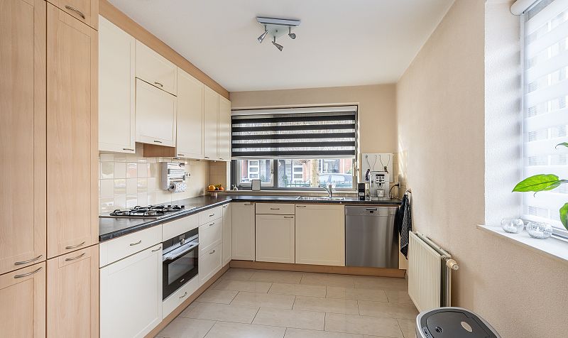 De woonkamer is voorzien van comfortabele vloerverwarming met een plavuizenvloer, een praktische trapkast en geeft via de openslaande deuren toegang naar de tuin. Door de extra 2 ramen in de zijgevel heeft de woonkamer een mooie lichtinval. Er is een elektrische screen geplaatst aan de keukenzijde en zijgevel. De achtergevel is nog voorzien van een elektrisch zonnescherm. De hoekkeuken is voorzien van een gaskookplaat, afzuigkap, oven (2020), vaatwasser (2020), koelkast, vriesladen, apothekerskast, carrousel en veel kasruimten.