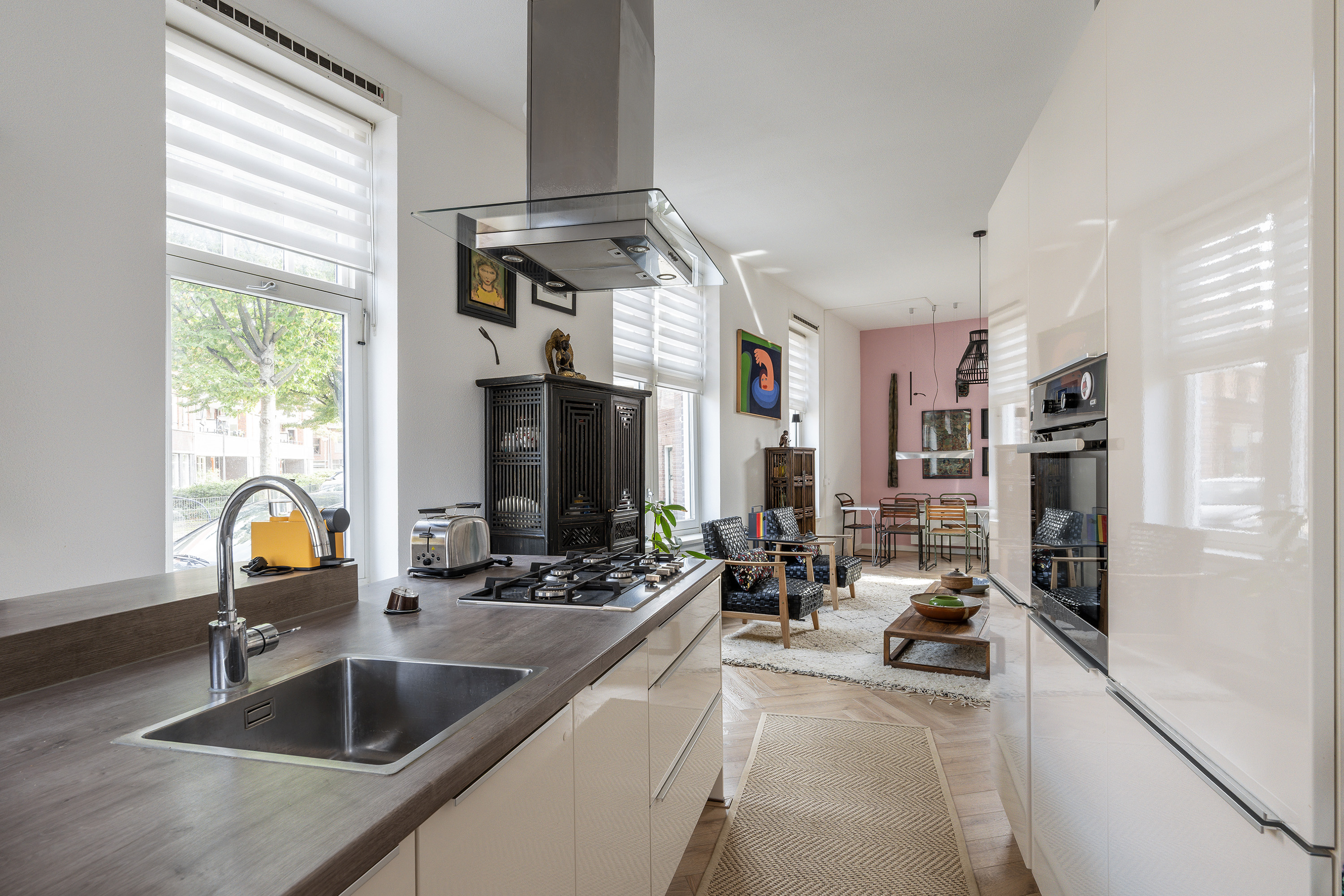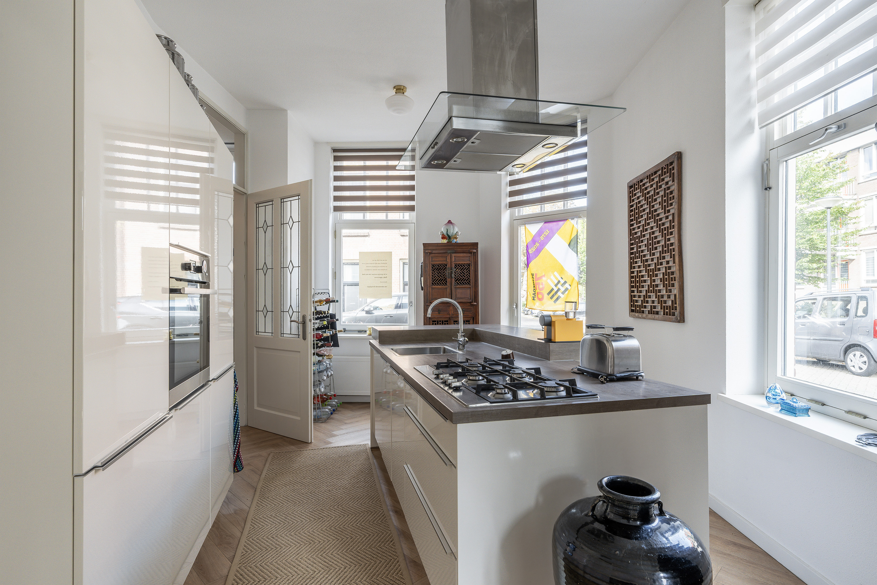 Entree met ruimte hal, meterkast en trap naar de eerste etage. Heerlijk ruime en lichte woonkamer met open keuken aan de voorzijde van tezamen meer dan 40m2. Aan de achterzijde is er toegang tot de zonnige achtertuin. De moderne open keuken in wit hoogglans heeft een spoel-/kookeiland en is voorzien van kwalitatief goede inbouwapparatuur zoals een afzuigkap, 5-pits gaskookplaat, oven, koelkast en vaatwasser. Toilet tevens op de begane grond.