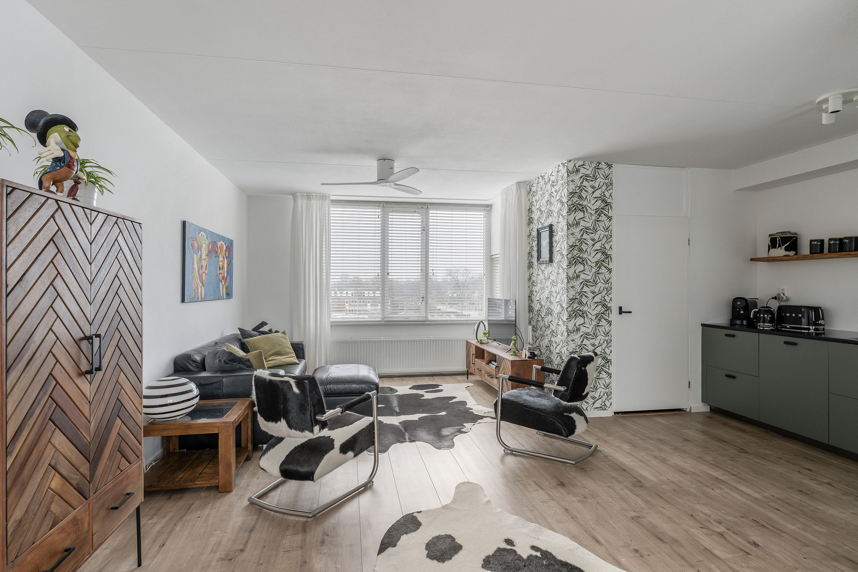 Derde verdieping, overloop, cv kast. Royale sfeervolle woonkamer van ca. 42,2m2 met een openkeuken en met een directe toegang naar het zonnige terras via openslaande deuren. De woonkamer ademt een prettige sfeer, heeft een mooie lichtinval en een leuke doorkijk over de wijk. De keuken is voorzien van een inductie kookplaat (2024), een afzuigkap, een oven, een vaatwasser (allen van het merk Bosch) en een koelkast/vriescombinatie (Liebherr). Naast de keuken bevindt zich een praktische inpandige bergruimte. Ook deze etage is voorzien van laminaat met hoge witte plinten en gestucte wanden.