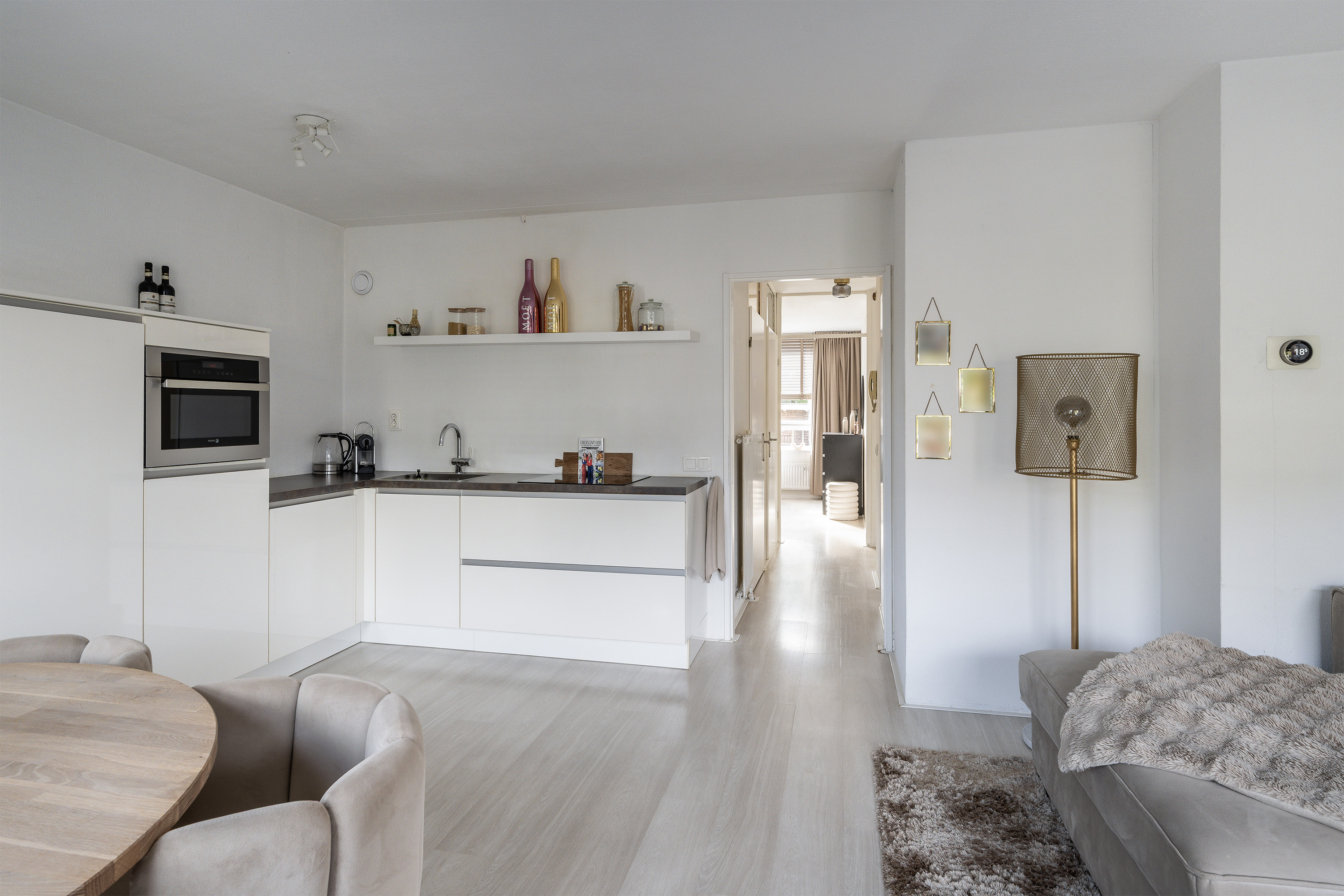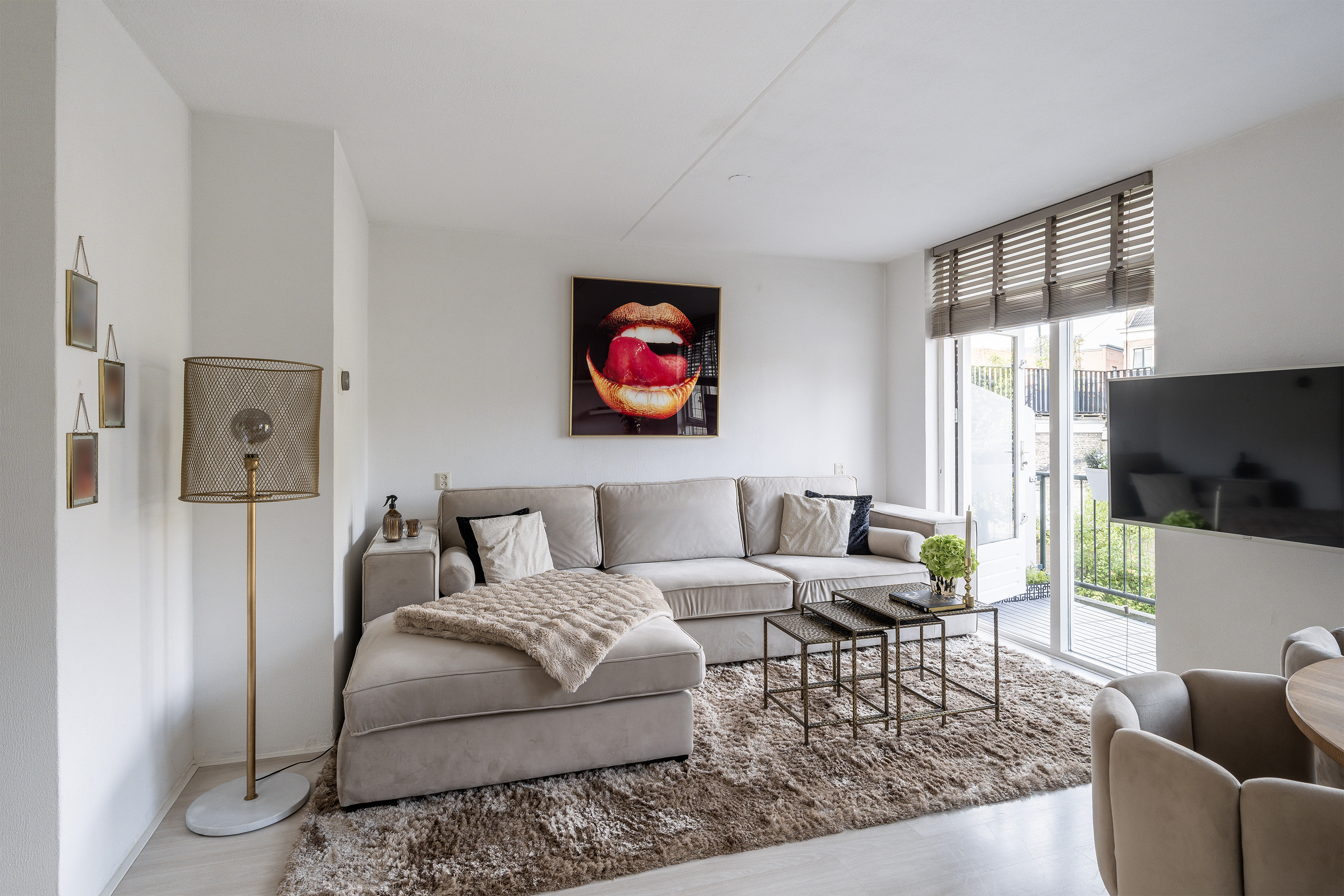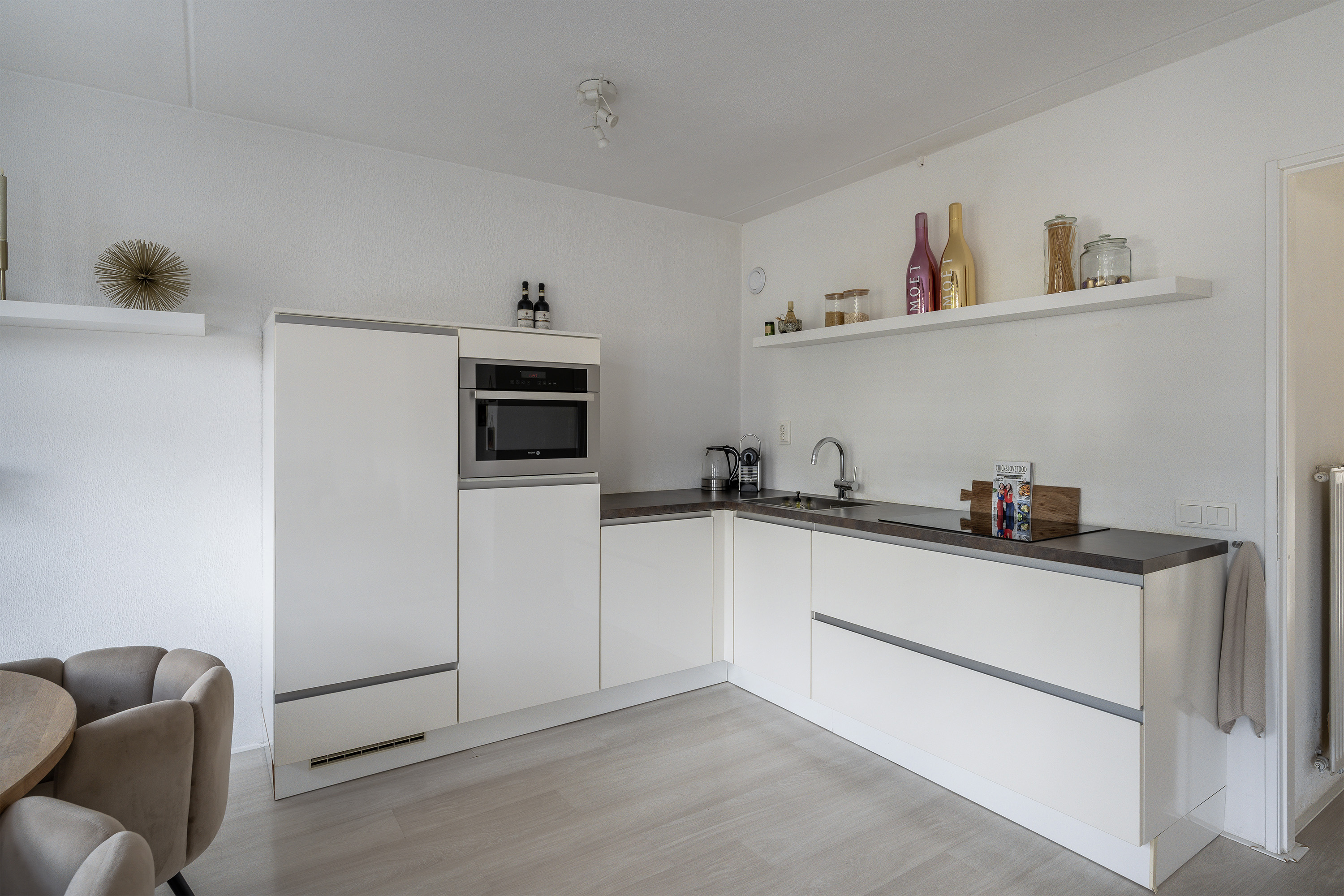 Entree, hal met meterkast en toegang tot alle vertrekken. De woonkamer met open keuken van tezamen ruim 24m2 is voorzien van een laminaatvloer en geeft toegang tot het balkon. De keuken is voorzien van diverse opbergkasten, 4 zones inductiekookplaat, afzuigkap, vaatwasser en een koelkast met vriesvak. Vanuit de gang is er toegang tot de hoofdslaapkamer van ca. 12m². Deze kamer heeft een vaste kast met de wasmachine aansluiting. De 2e slaapkamer van ca. 8m2 is voorzien van een frans balkon. De tevens modern uitgevoerde badkamer beschikt over van een inloopdouche en een wastafelmeubel met spiegel. Apart toilet met fonteintje.