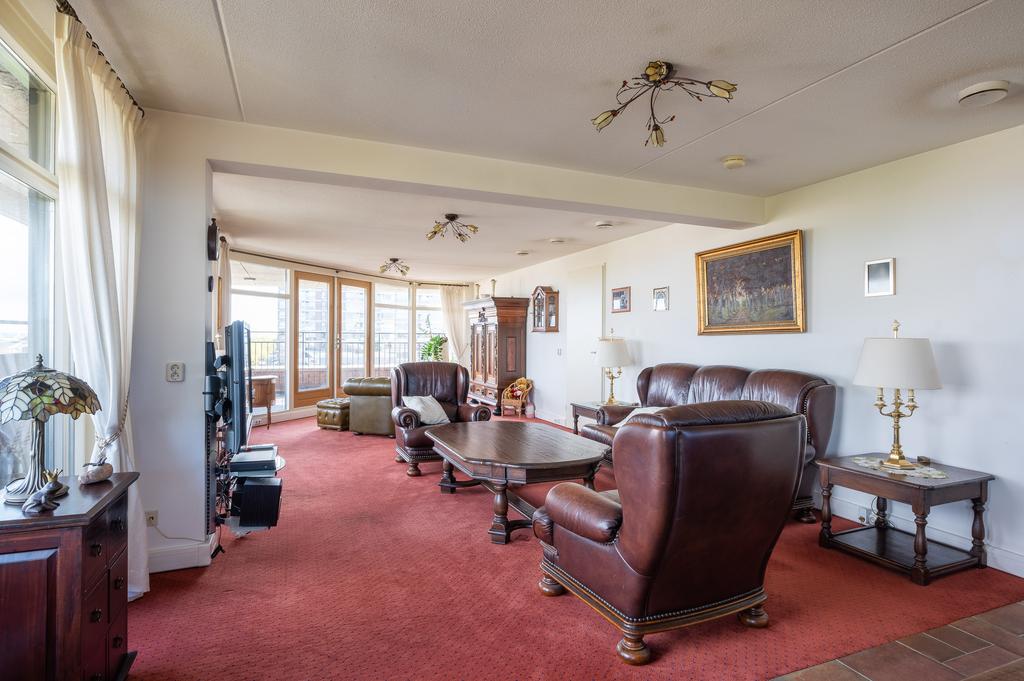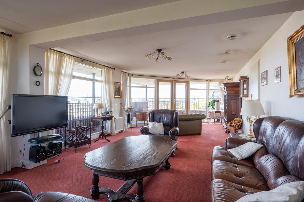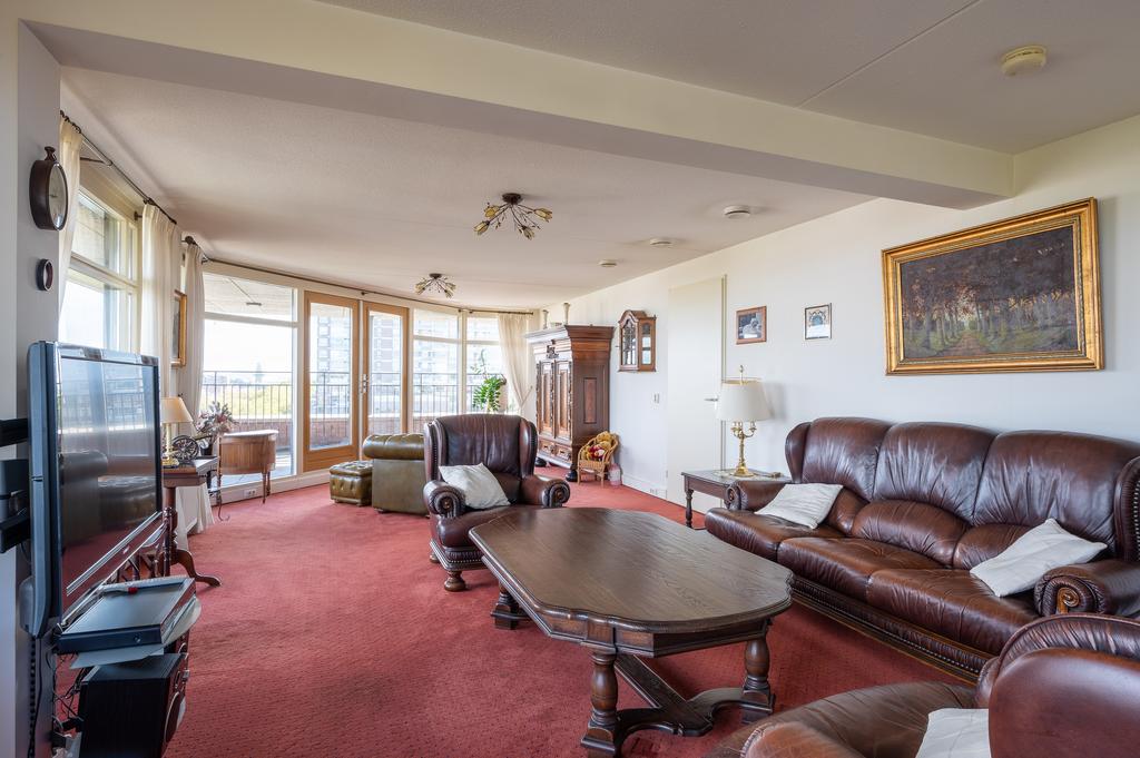 Entree, ruime hal met garderobe ruimte en meterkast, toilet met fonteintje. Ruime berging voorzien van de CV ketel, WTW-unit en de wasmachine/droger aansluitingen. De woonkamer met open keuken van tezamen bijna 60m2 heeft een waanzinnig uitzicht over Schiedam, richting Rotterdam. De hoeveelheid ramen zorgt voor een plezierige lichtinval en via openslaande deuren is er toegang tot het balkon. De keuken is uitgevoerd in een U opstelling, voorzien van een granieten aanrechtblad, losse Amerikaanse koelkast en de navolgende inbouwapparatuur: friteuse, gaskookplaat (beide Gaggenau), afzuigkap (Itho), vaatwasser (Miele) en een combi-magnetron (Siemens). De keuken beschikt tevens over veel kasten en lades. In de keuken en het eetgedeelte liggen tegels en in het living gedeelte en de slaapkamers ligt tapijt. De woonkamer en de slaapkamers worden gescheiden van elkaar door een 2e hal. De hoofdslaapkamer van ca. 22m is ontstaan doordat er 2 kamers zijn samengevoegd. Toiletruimte met een 2e toilet, urinoir en een wastafel. Ruime en net betegelde badkamer voorzien van een dubbel wastafelmeubel, 2 extra kasten, radiator en een ruime douche. 2e Slaapkamer met inloopkast van tezamen ca. 20m2. De inloopkast is te bereiken middels schuifdeuren en is voorzien van verlichting en leg- en hanggedeeltes. Deze slaapkamer geeft tevens toegang tot het balkon.