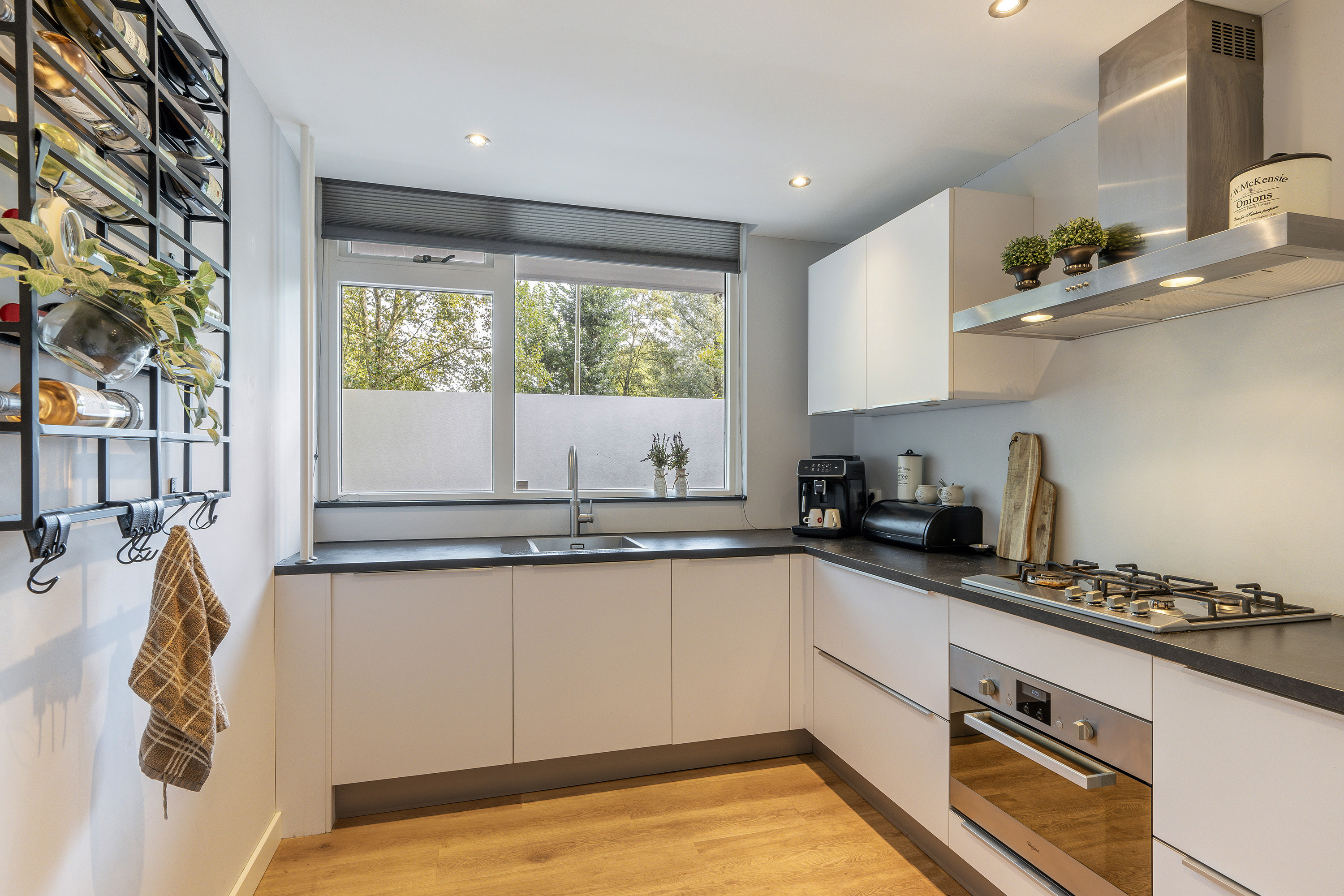 Entree, hal met meterkast. Videofoon-installatie. Moderne luxe keuken voorzien van een Quooker, gaskookplaat, rvs afzuigkap, combi magnetron, koelkast/vriesladen, vaatwasser, veel kastruimten en een plafond met inbouw ledverlichting. Inbouwkast met opstelling wasmachine/droger. Royale woonkamer/eetkamer van totaal ca. 46m2. Door het verwijderen van de tussenwanden is een heerlijke leefruimte ontstaan. Gang naar de praktische bergkast met 120L boiler. Luxe badkamer voorzien van een inloopdouche, dubbele wastafelmeubel, halogeen verlichting. Separaat modern vrij hangend toilet met hand wasbakje. Slaapkamer van ca. 10m2 voorzien van een airco gelegen aan de balkonzijde Hoofdslaapkamer van ca. 13m2, slaapkamer van ca. 10m2 gelegen aan de galerijzijde.