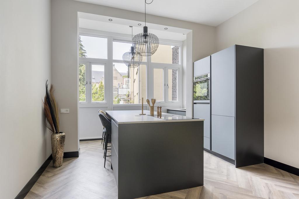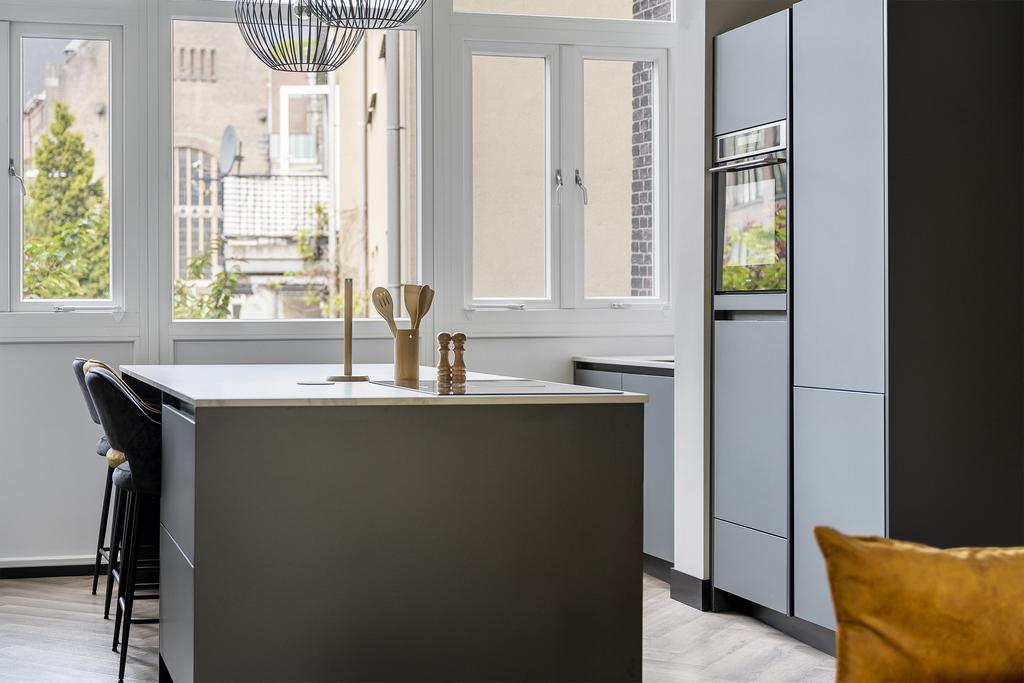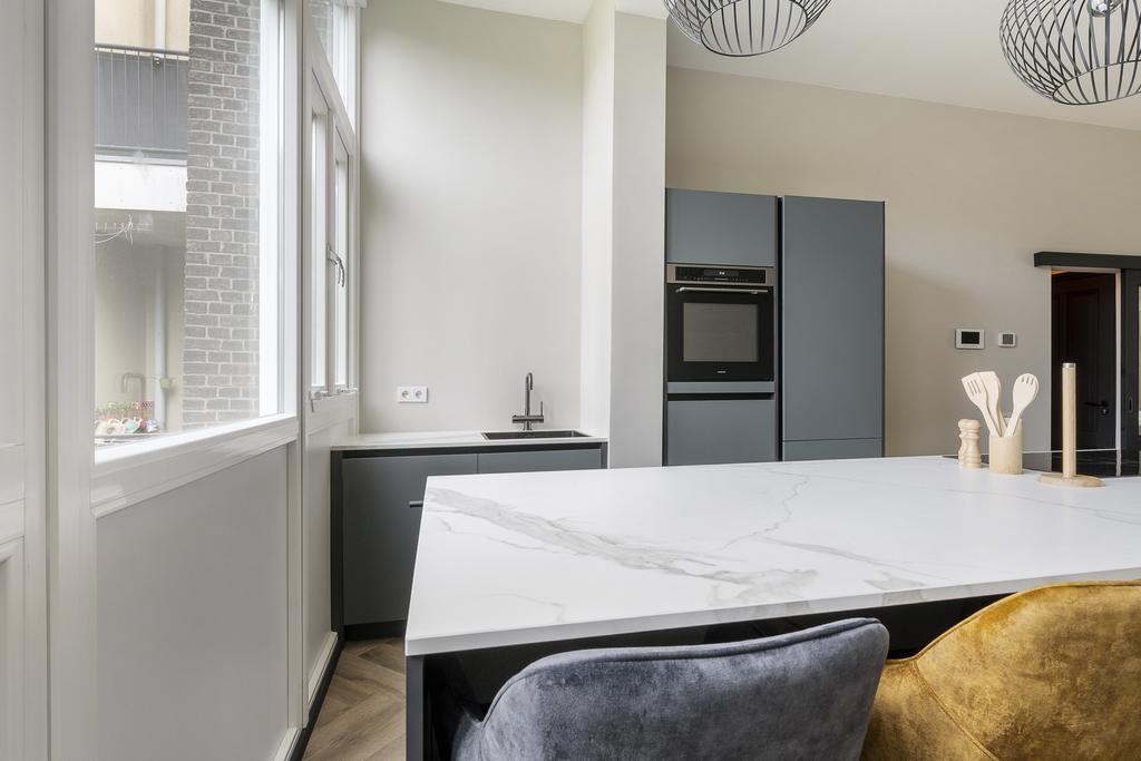 -een open luxe uitgevoerde keuken inclusief een kookeiland, marmerenlook aanrechtblad, bora kookplaat, vaatwasser, koelkast, vriesladen, oven en veel kastruimten.