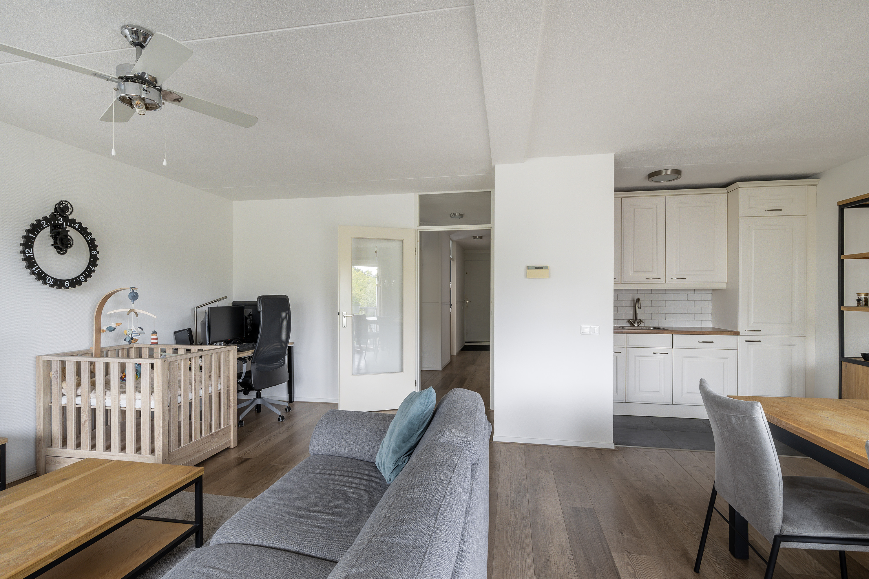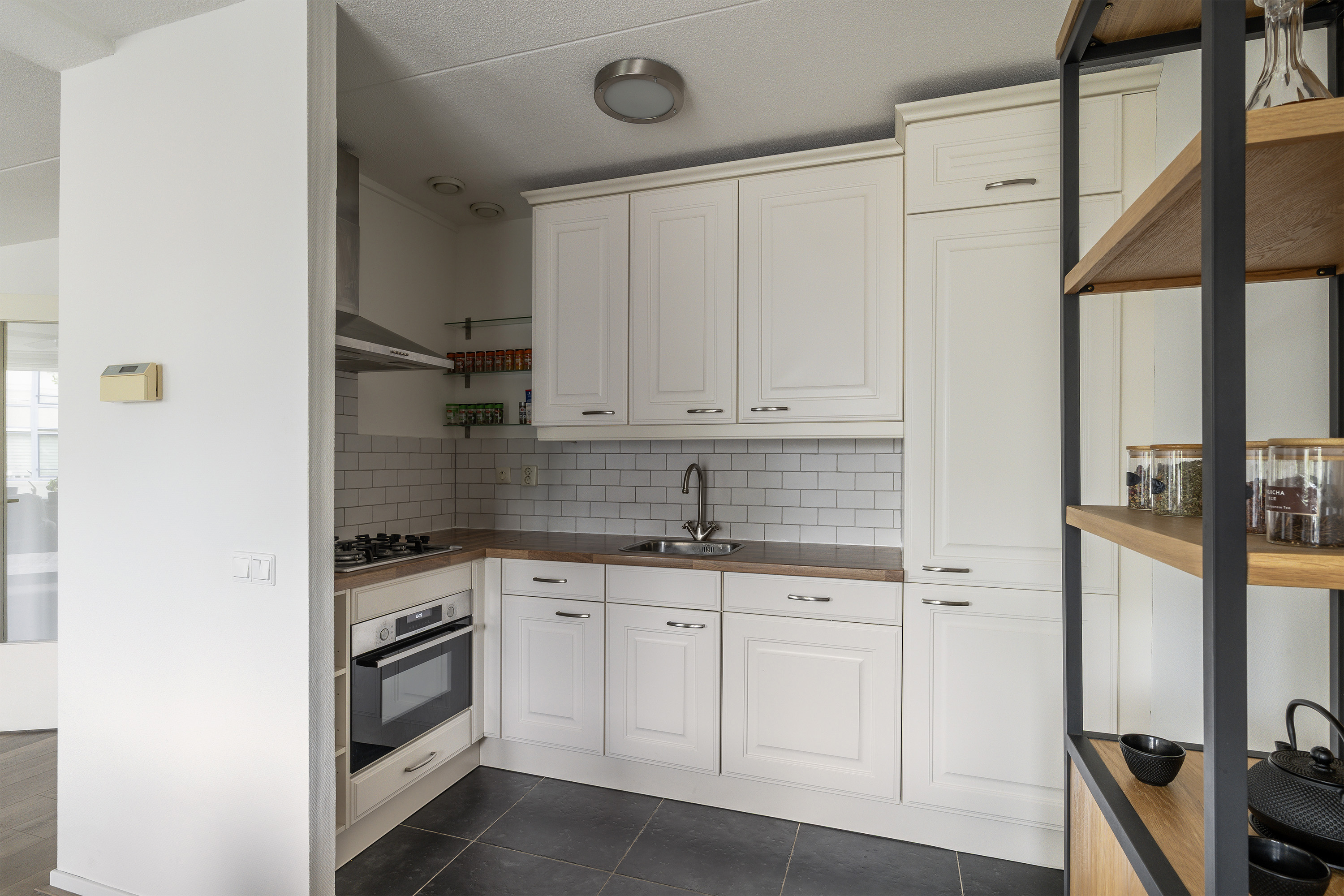 Entree, ruime gang welke toegang geeft tot alle vertrekken. Beide slaapkamers liggen aan de galerijzijde en zijn respectievelijk 11.1m2 en 6.6m2. De hoofdslaapkamer is voorzien van een schuifkastenwand. Separaat toilet met fonteintje. Inpandige berging welke fungeert als natte ruimte, maar ook gebruikt kan worden als extra bergruimte. De ruime badkamer is net uitgevoerd en voorzien van een douche/ligbad, radiator en een wastafel. Ruime woonkamer met open keuken van tezamen ruim 35m2. De keuken is voorzien van een L-vormige keukenopstelling voorzien van de volgende inbouwapparatuur: gaskookplaat, combi-oven, afzuigkap, vaatwasser en een koel/vrieskast.. Vanuit de woonkamer is er tevens het riante balkon bereikbaar.