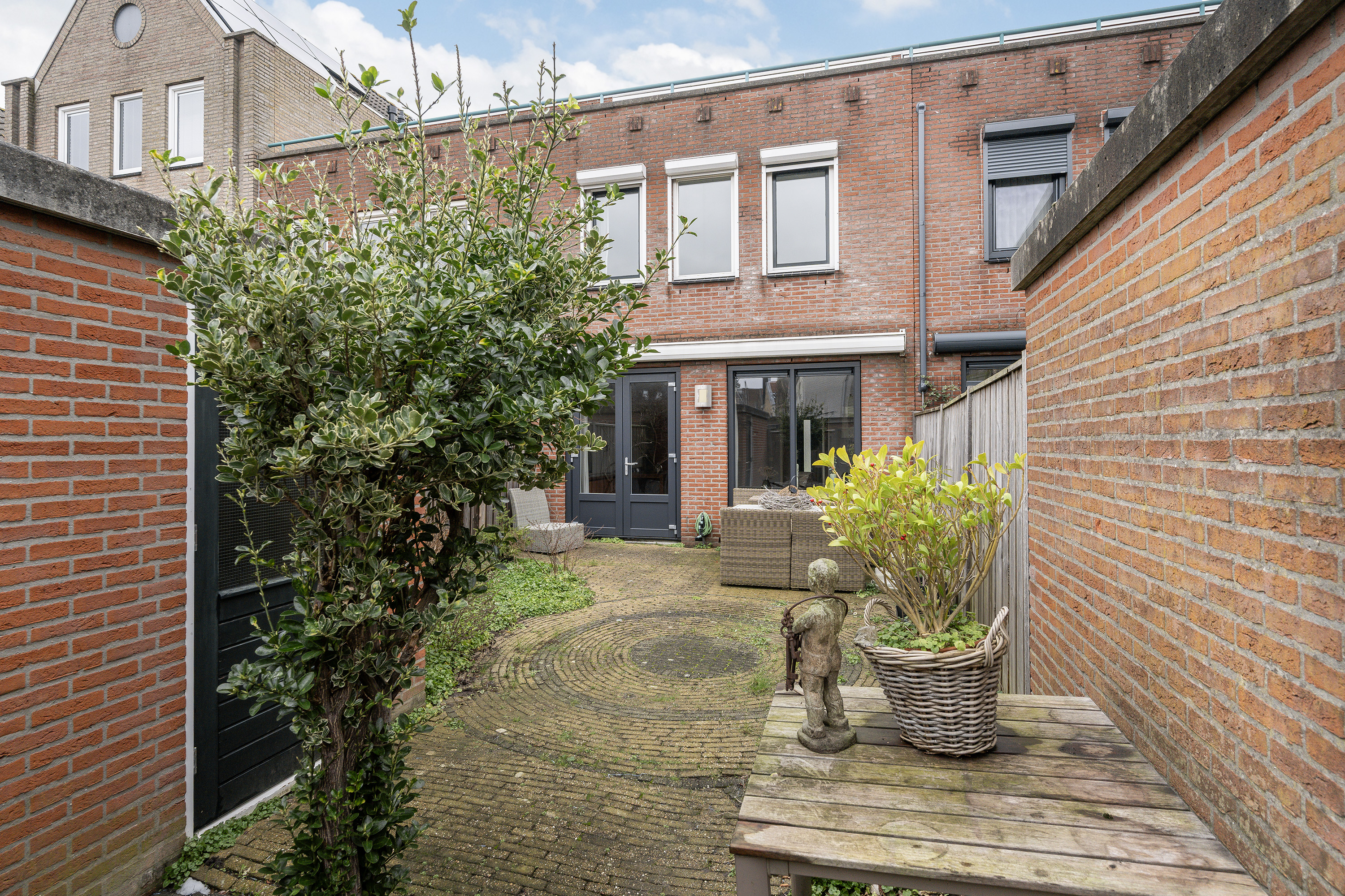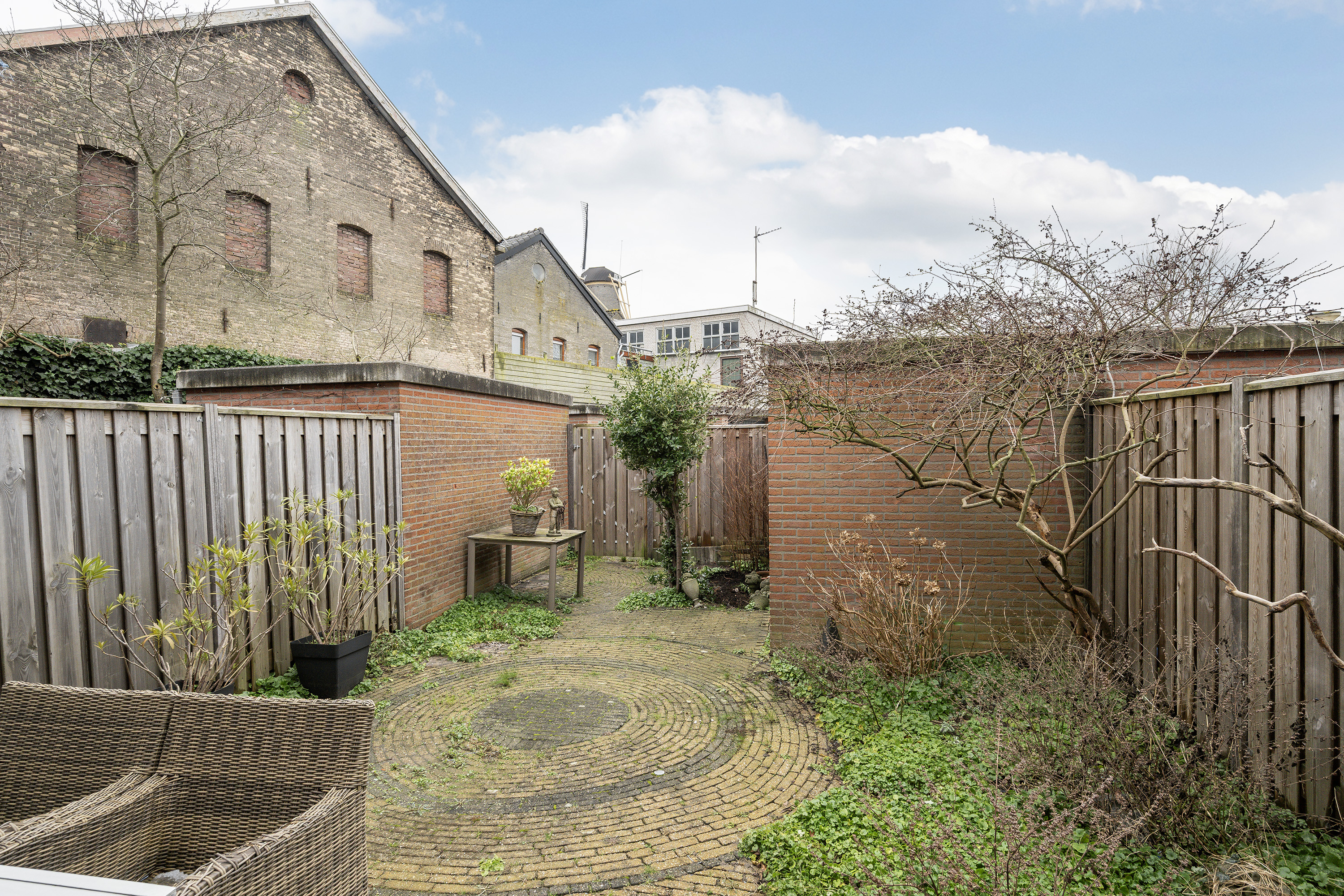 Spacious backyard facing the sunny southwest. The garden is 9.60 meters deep and 5.15 meters wide. There is a very spacious shed of over 9m² in the garden, and there is rear access. The rear access leads to a public parking lot where parking is permitted with a permit.