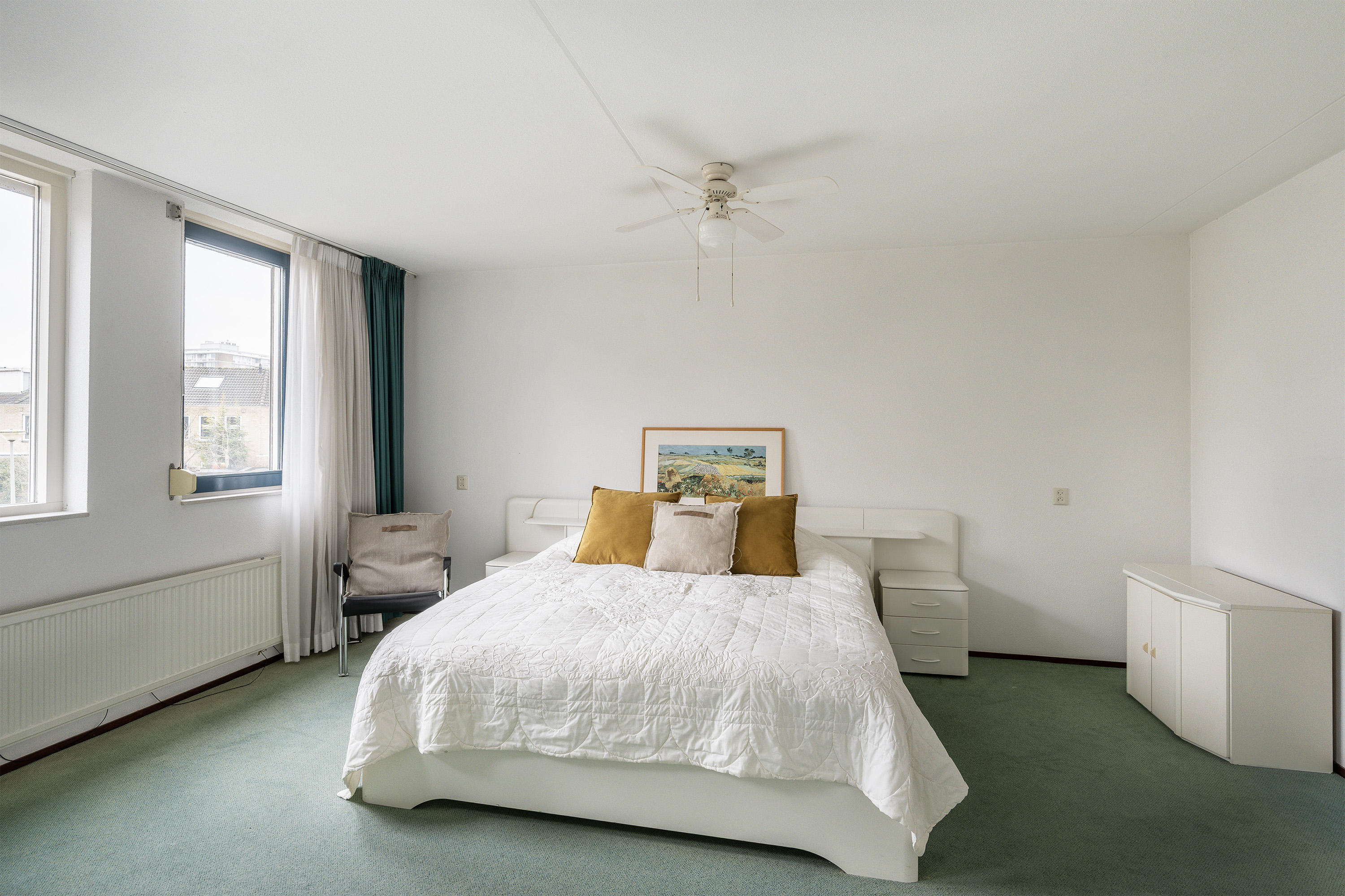 Overloop, trapopgang naar de 2e verdieping. Slaapkamer van ca. 11m2. De hoofdslaapkamer is 23.7m2. Deze kamer is op te splitsen in 2 kamers. De badkamer is verouderd, maar netjes en is voorzien van een ligbad/douche, wastafel en 2e toilet.