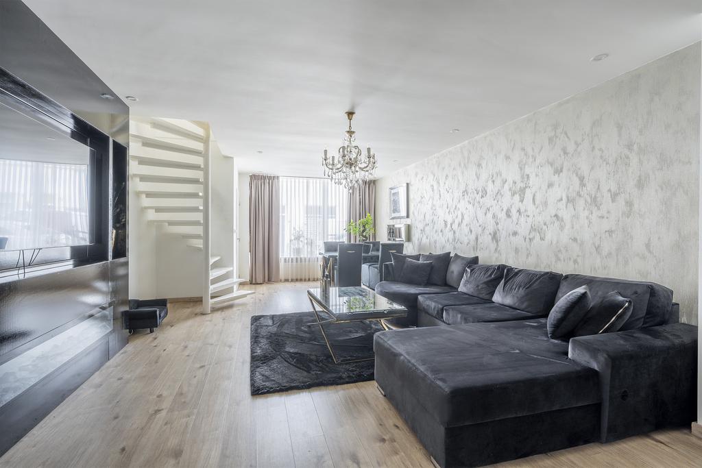 Entree, tochtportaal, kast. Ruime woonkamer met open keuken van ruim 40m2. De woonkamer heeft een open wenteltrap naar de slaapverdieping, beschikt over een cinewall en is voorzien van een strakke wand/vloer/plafond afwerking. In het verlengde van de woonkamer bevindt zich de keuken, welke opgesteld is in een hoek. Het hoogglans witte keukenblok is voorzien van een stenen aanrechtblad en de navolgende inbouwapparatuur: oven, magnetron, koelkast, vriezer, afzuigkap en een 4 pits gaskookplaat. De keuken is verder voorzien van diverse lades, bovenkasten en onderkasten. Op de begane grond bevinden zich verder nog een aparte kast met de CV ketel en het toilet.