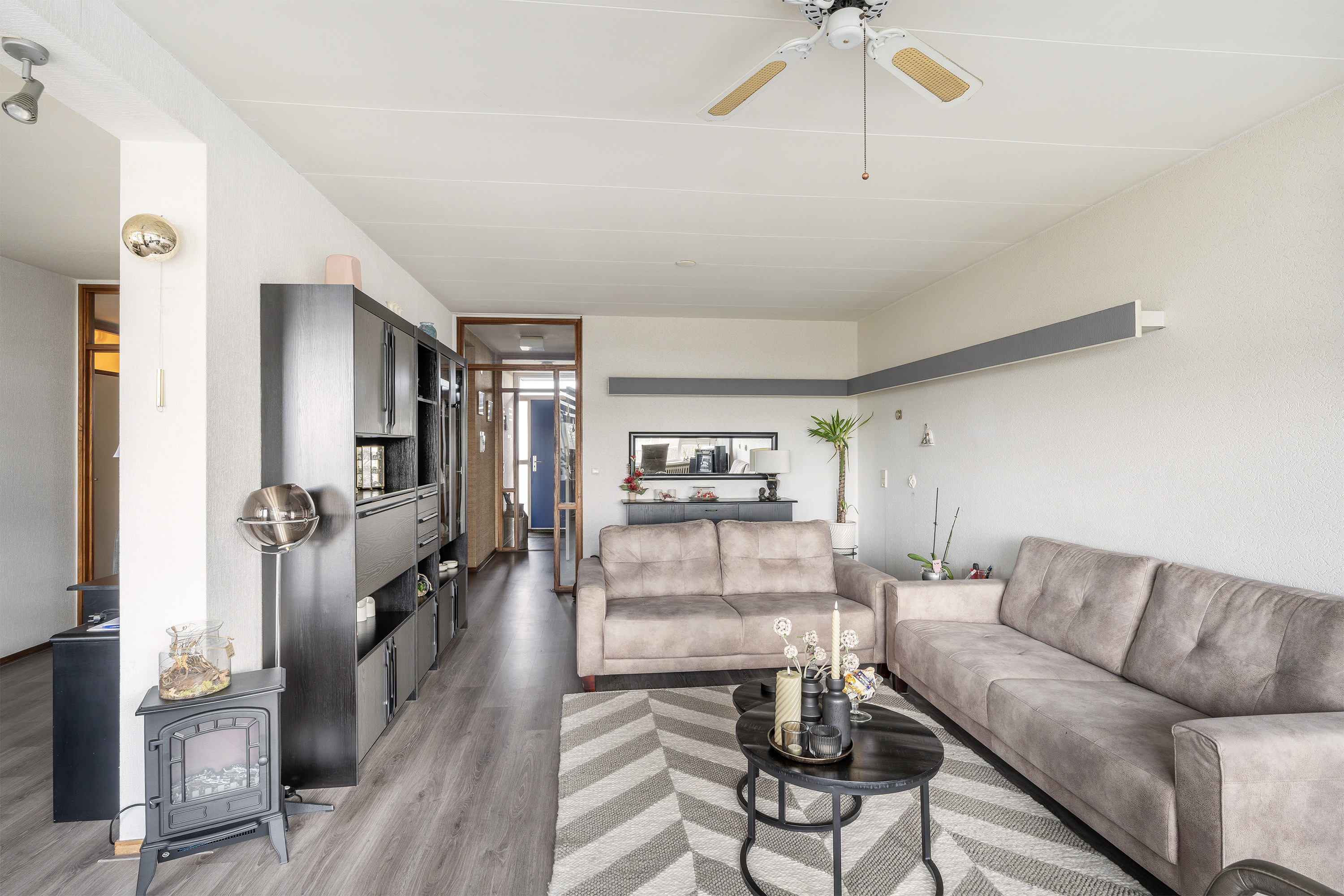Entrance, long hallway with a spacious storage cupboard housing the boiler. Spacious closed kitchen with a neat, simple layout. Generous and bright living room of approximately 27m². The living room has been enlarged by incorporating the adjacent room of approximately 10m². This space can easily be converted back into a separate bedroom. From this room, there is access to the balcony. Master bedroom of approximately 12m² located on the balcony side. Bedroom of approximately 6m² and bedroom of approximately 9m² located on the gallery side. Separate toilet with small sink. Bathroom equipped with washbasin, radiator, washing machine connection, and walk-in shower.