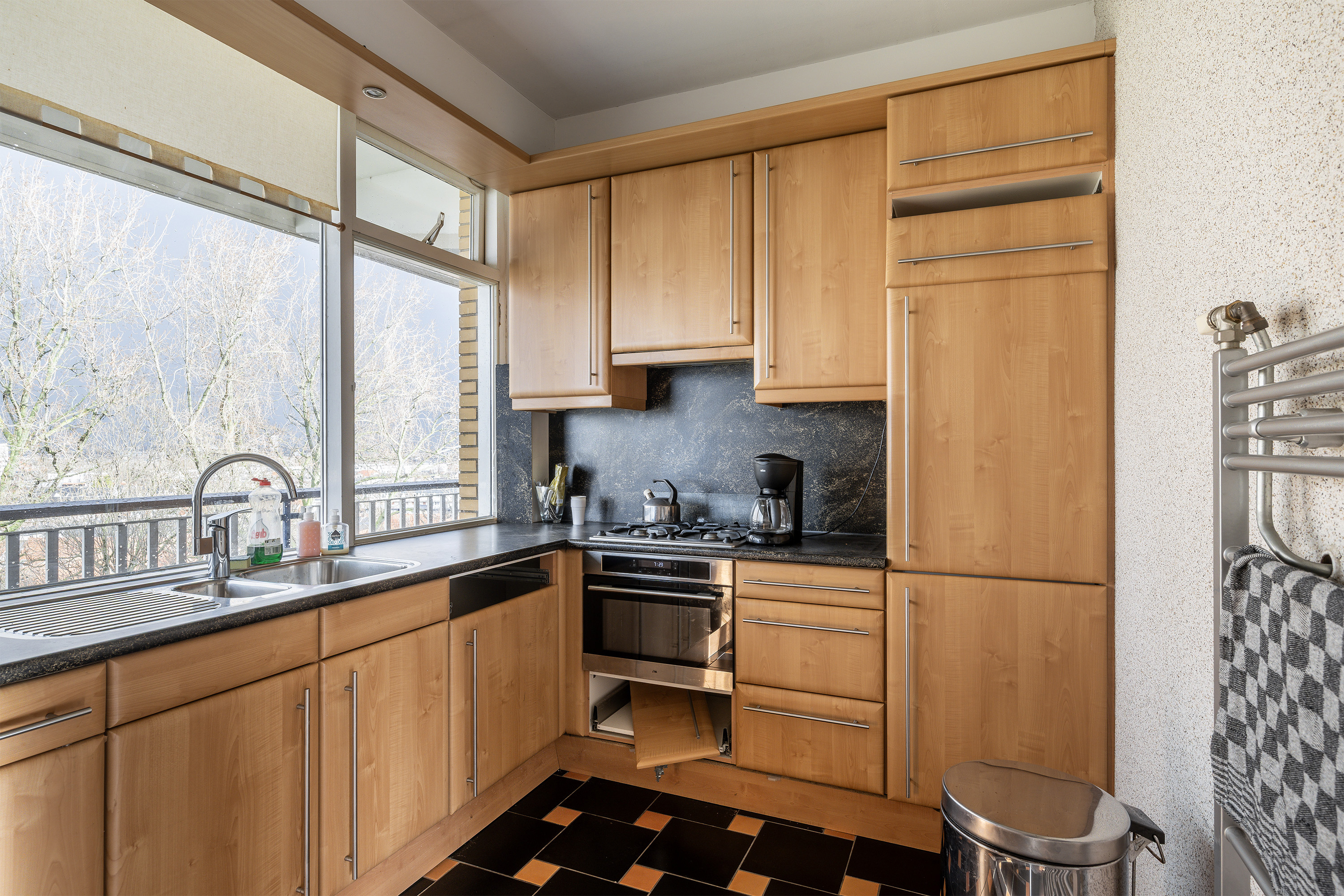 De hoekkeuken (3,25m x 2,37m) bevindt zich aan de galerijzijde en is voorzien van diverse apparatuur; koelkast/vriesladen, oven, vaatwasser, gaskookplaat en een afzuigkap. Vanuit de keuken is een mooi zicht op de Molens van Schiedam. De badkamer is voorzien van een riante inloopdouche, wastafelmeubel en een designradiator. Separaat toilet met een handwasbakje. Riante slaapkamer aan de achterzijde van ca. 13,2m2 met een grote schuifkastenwand en ingebouwde boiler. Tevens toegang naar het balkon. Aan voorzijde is nog een 2e kamer van ca. 7,6m2