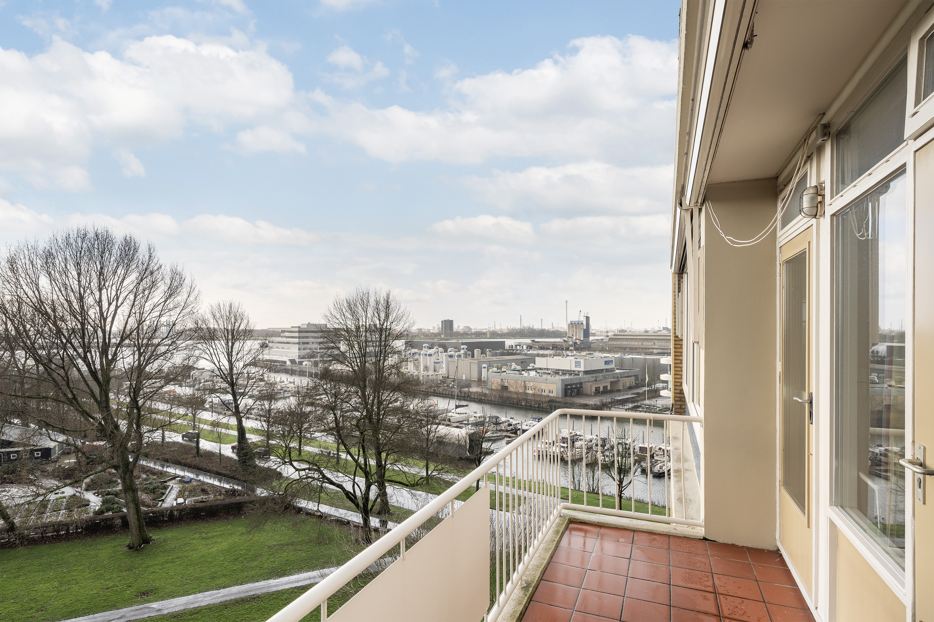 De woning heeft een ruim zonnig balkon (4,75 x 1,49) op het zuiden aan het park met een direct zicht op de Waterweg, het haventje en park.