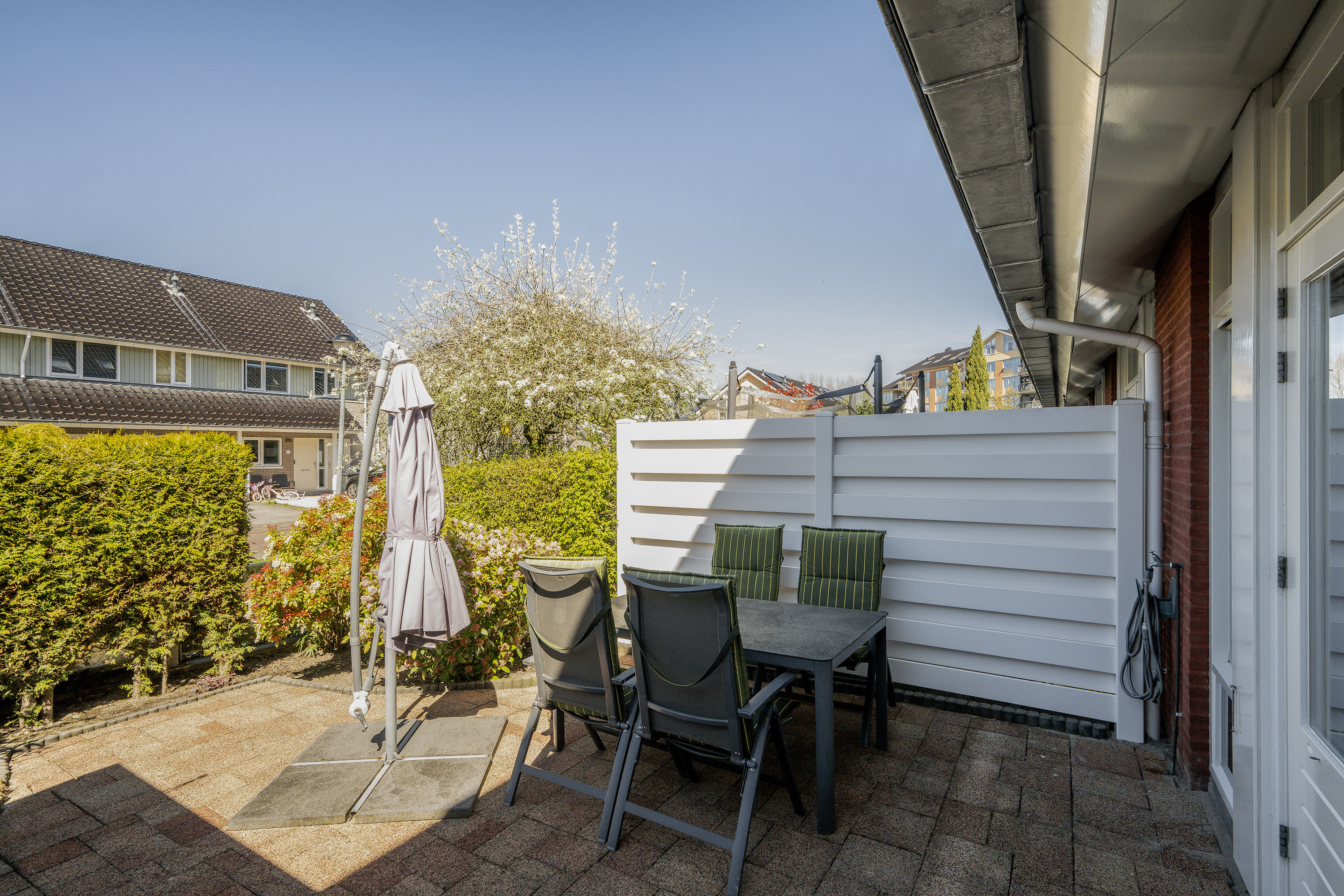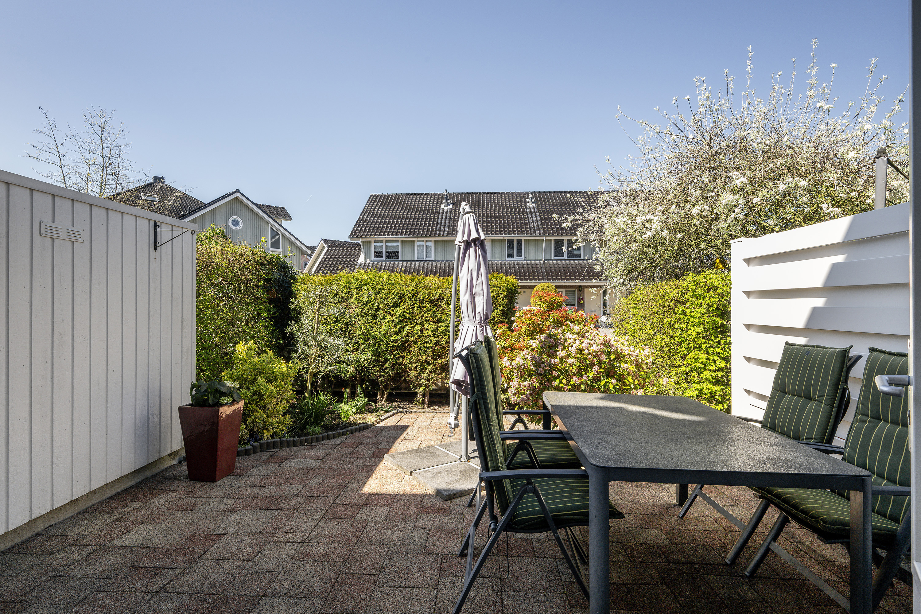 De achtertuin is voorzien van sierbestrating, veel groen en gelegen op het zuidoosten. Er is een buitenkraan aanwezig, evenals elektra. De tuin grenst aan de achterzijde aan een smalle waterstrook.