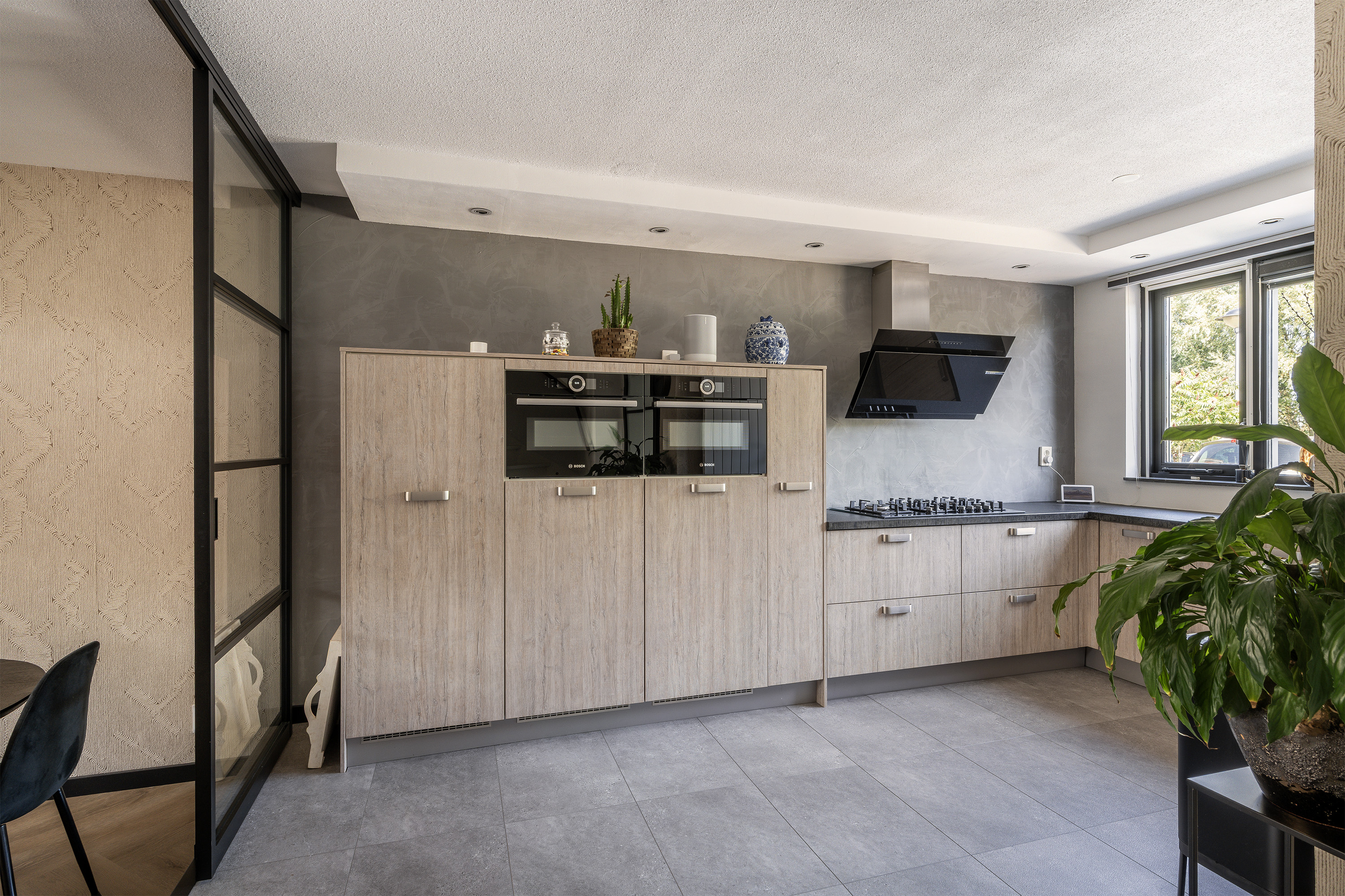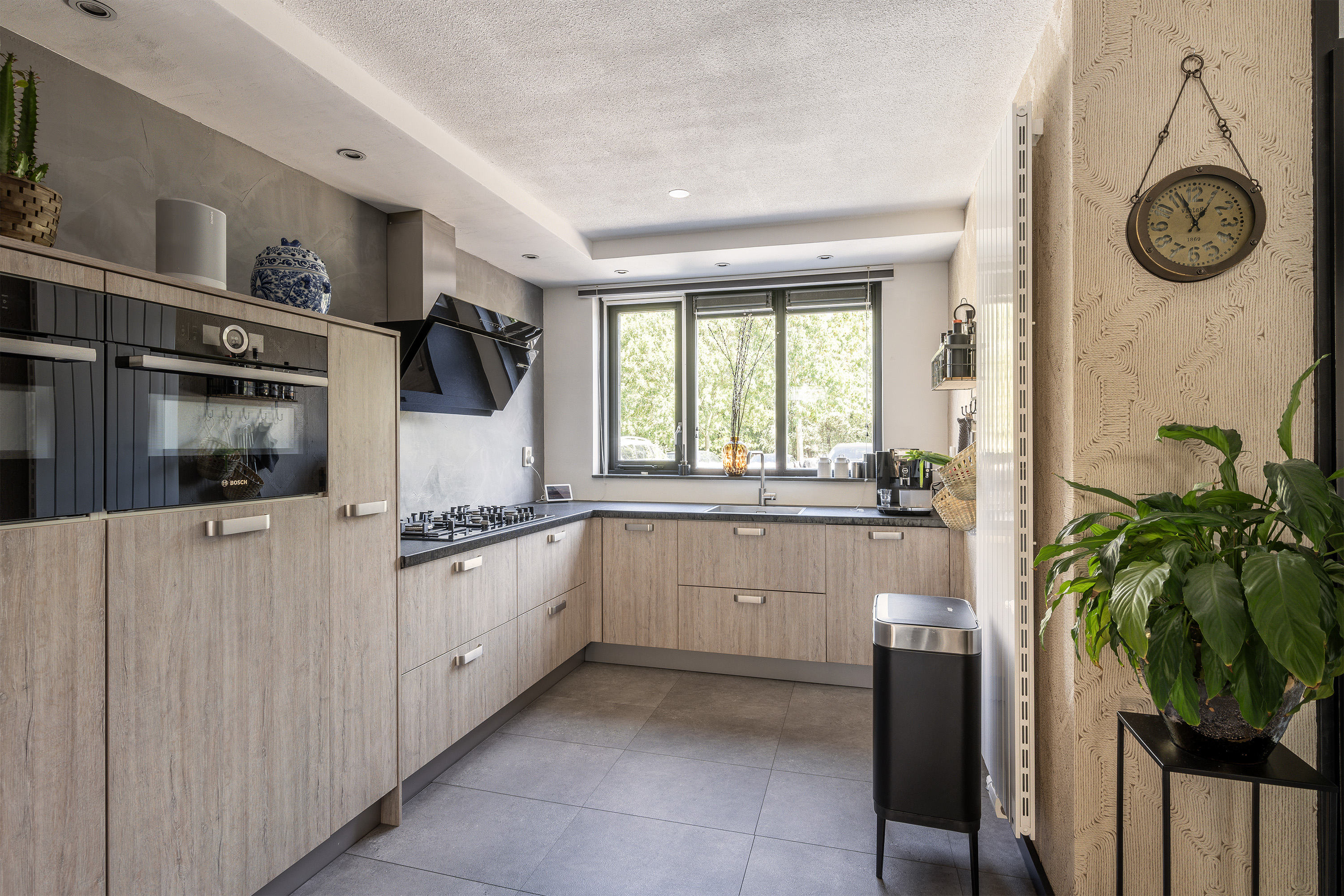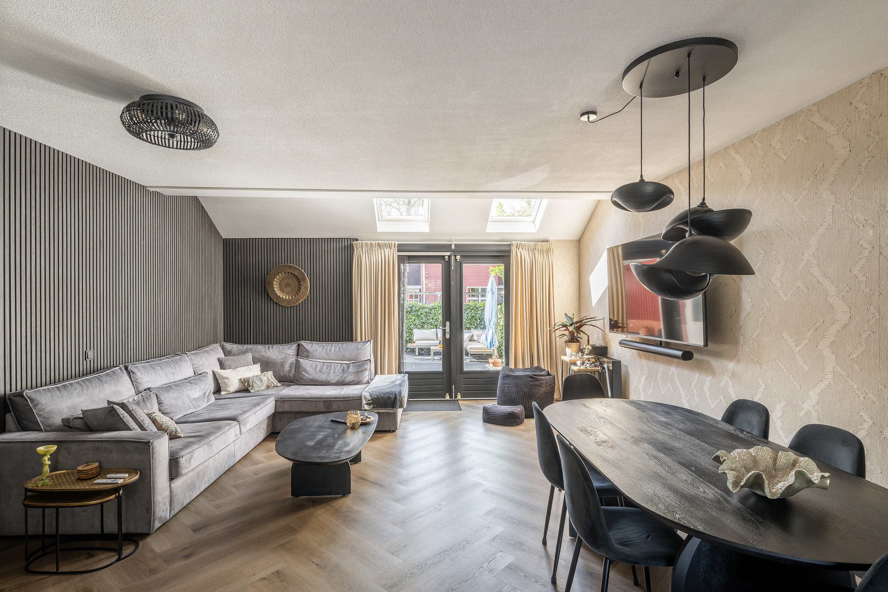 De luxe keuken aan de voorzijde is uitgevoerd in een royale hoekopstelling met veel werk- en bergruimte, en voorzien van hoogwaardige inbouwapparatuur: een vaatwasser, twee koelkasten, vriezer, twee combi-ovens, 5-pits gaskookplaat en afzuigkap. De woonkamer is uitgebouwd en heeft extra daglicht dankzij twee dakramen. Via openslaande deuren stap je zo de zonnige achtertuin in. De gehele verdieping is voorzien van vloerverwarming.