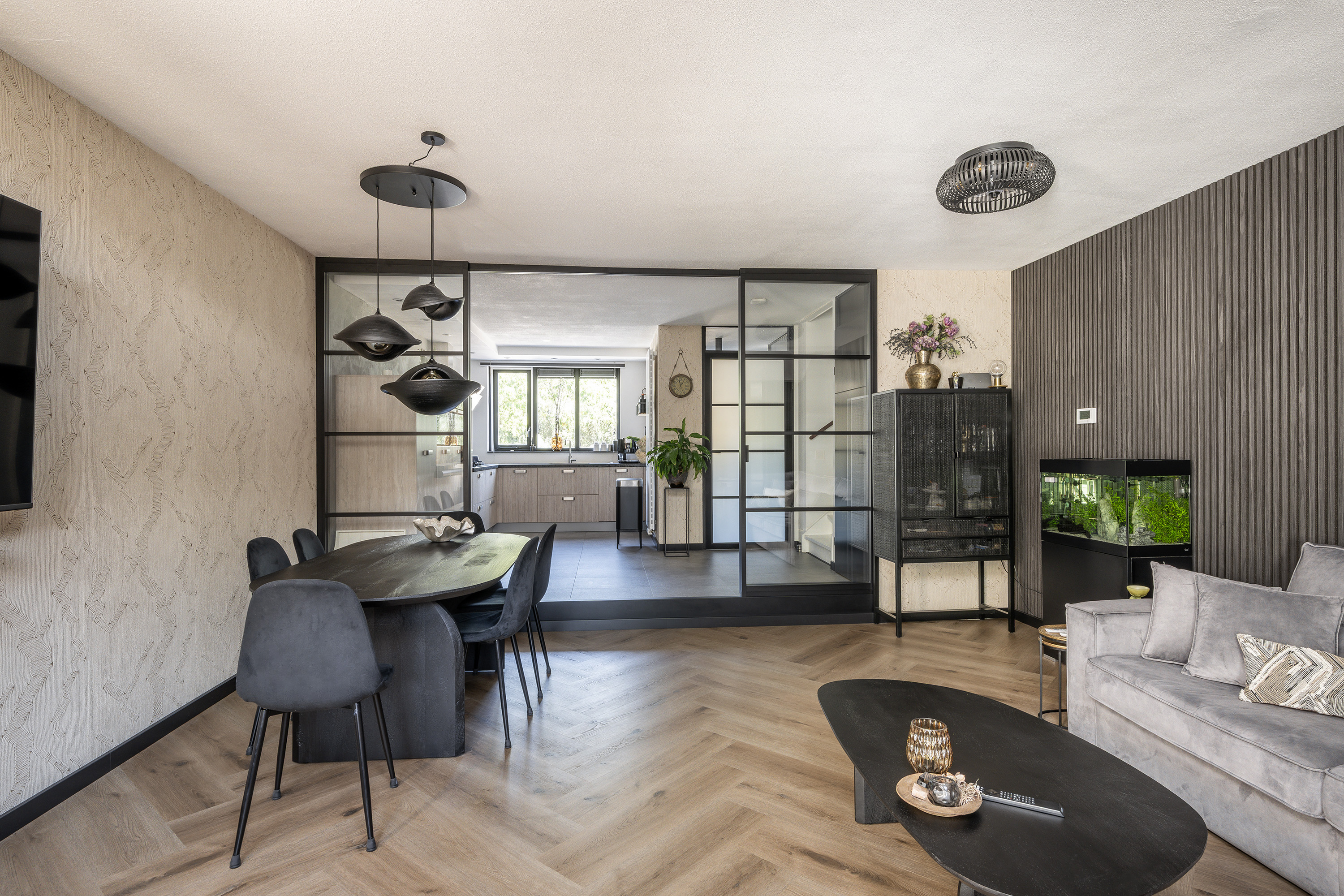 Via de ruime entree met hal, meterkast en modern toilet (met fonteintje) kom je binnen in de prachtige leefruimte. De zwarte stalen deuren van Gers geven direct een stoere en luxe uitstraling. De woonkamer en keuken samen beslaan maar liefst ca. 46 m² en kunnen door een fraaie stalen schuifdeur van elkaar worden gescheiden.