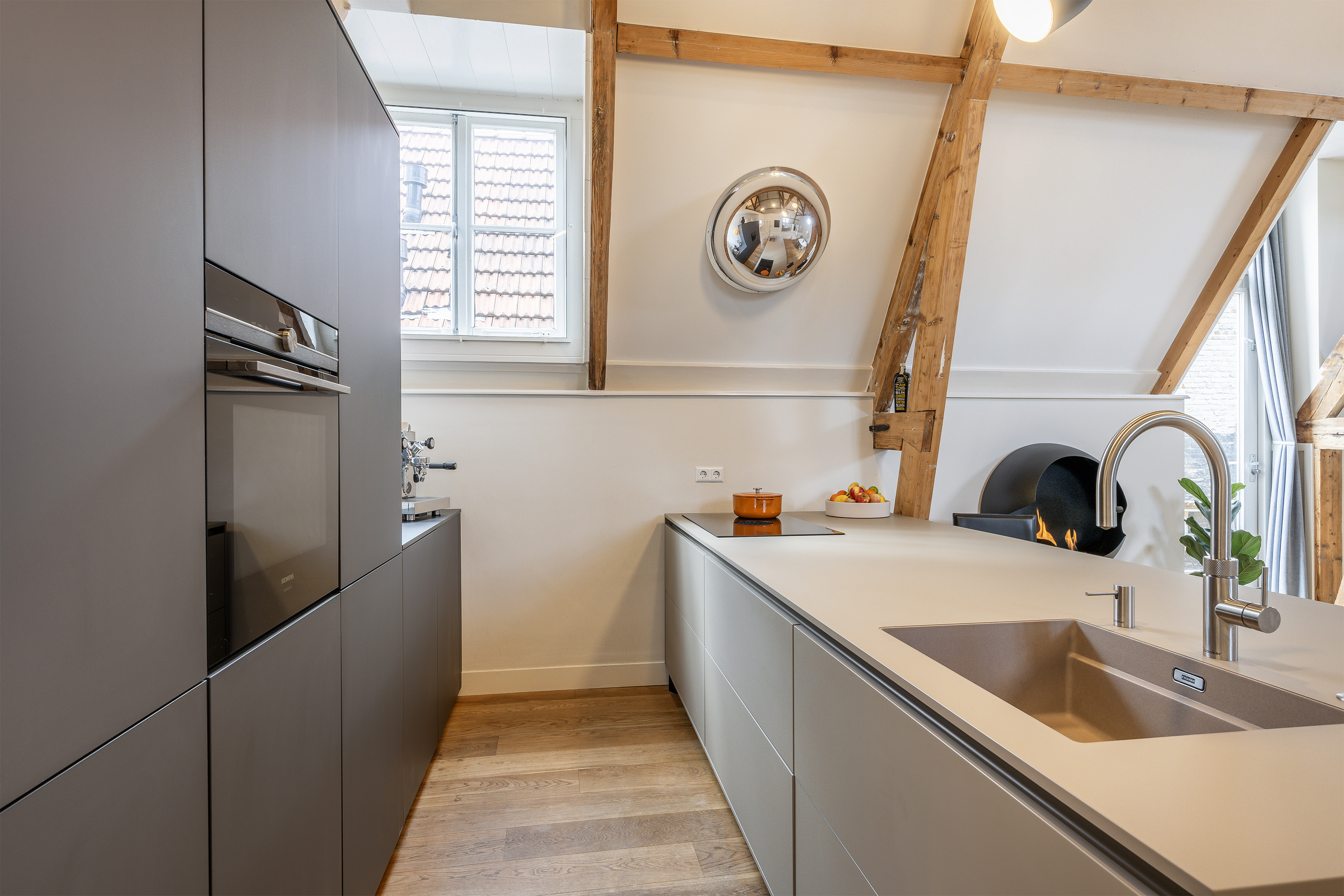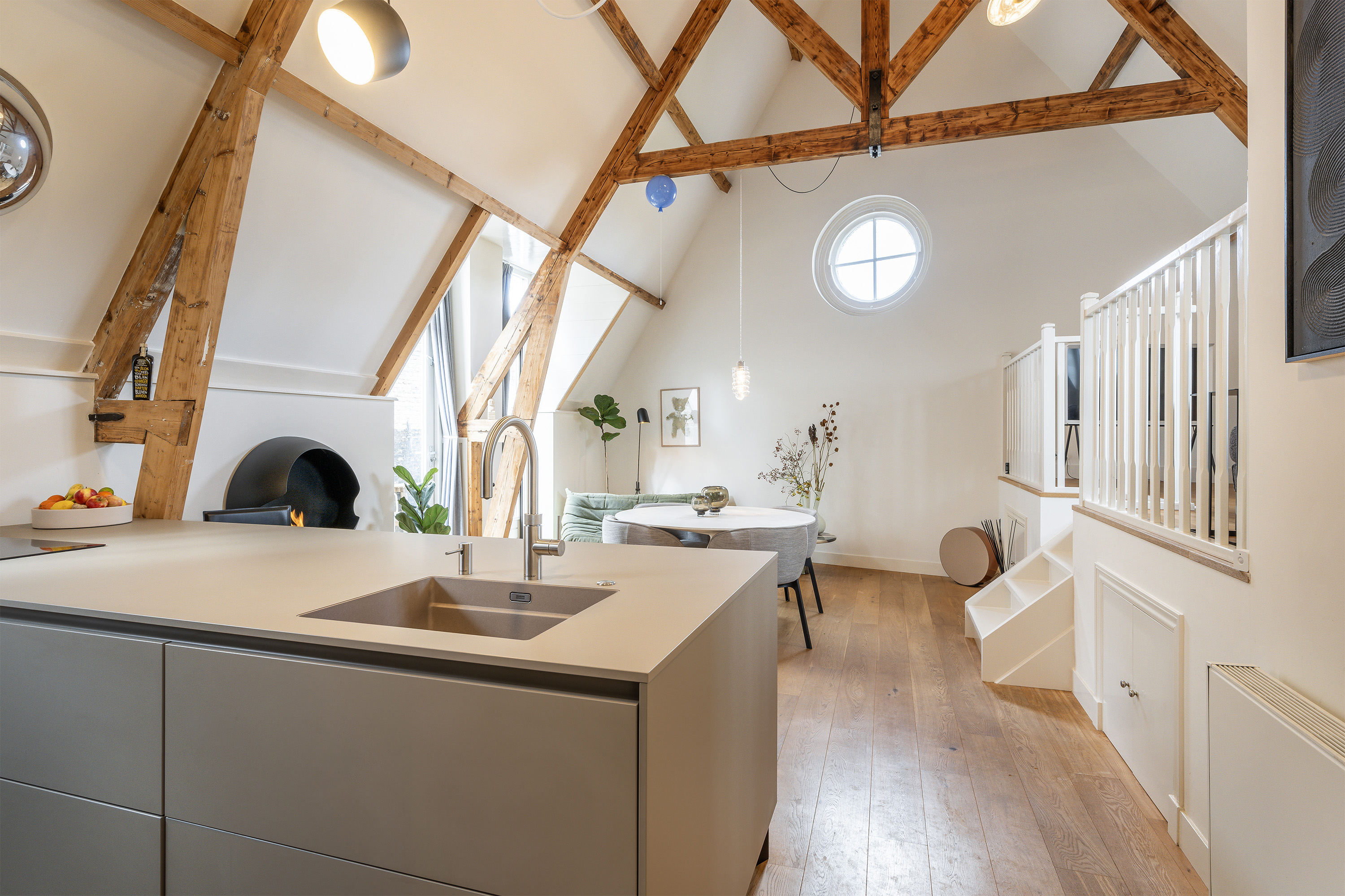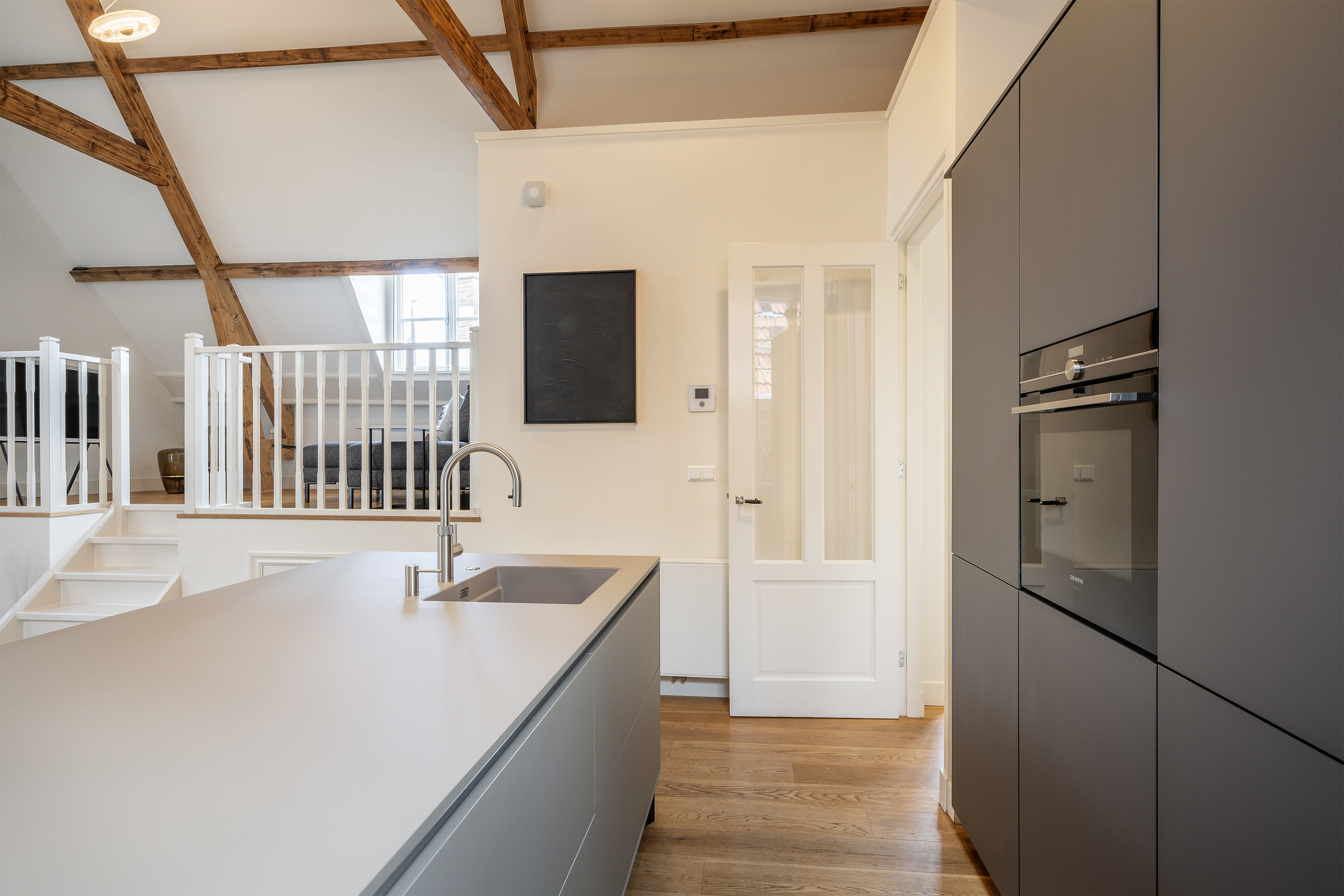 Entree, riante gang met de meterkast en een kast met CV ketel en wasmachineaansluiting, toegang tot alle vertrekken. Ruime hoofdslaapkamer van ruim 16m2 met een prettige lichtinval door o.a. 2 extra dakramen. De 2e slaapkamer is bijna 10m2. Apart toilet met fonteintje. De badkamer is bijzonder fraai uitgevoerd met een ligbad met bubbelfunctie, aparte douche en een wastafelmeubel met dubbele kraan, radiator en spiegel met verlichting. De woonkamer met verhoogd zitgedeelte en moderne open keuken (totaal ca. 42m2) is gelegen aan de voorzijde van de woning. De keuken is in 2023 volledig vernieuwd en omgetoverd in een walhalla voor de keukenprins/prinses met een keuken van Next! Een prachtig spoel/kookeiland met Quooker, vaatwasser en BORA inductieplaat met geïntegreerde afzuigkap, aangevuld met hoge kasten met de koelkast, vriezer en oven! De woonkamer geeft tevens toegang tot de vliering van 10m2.