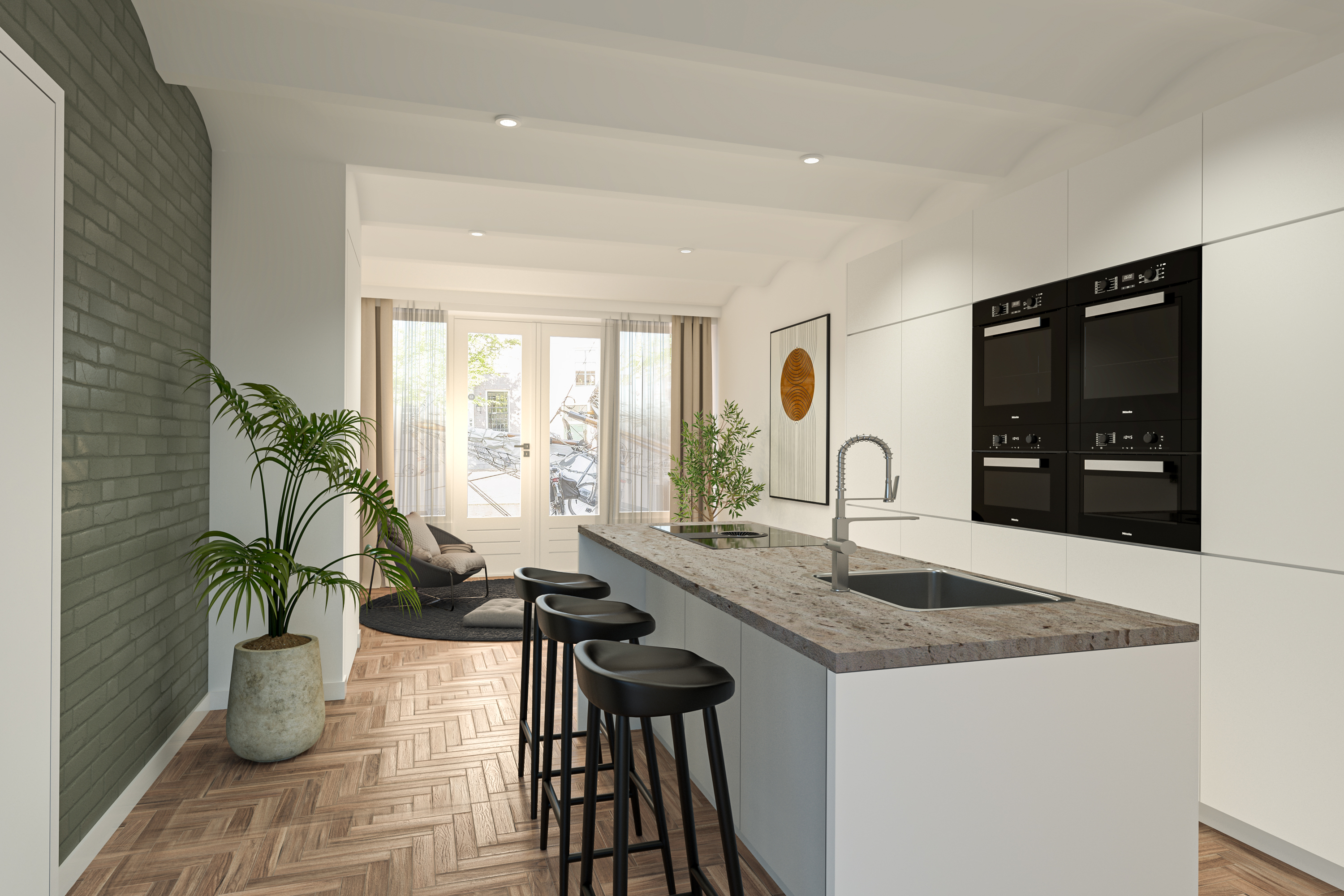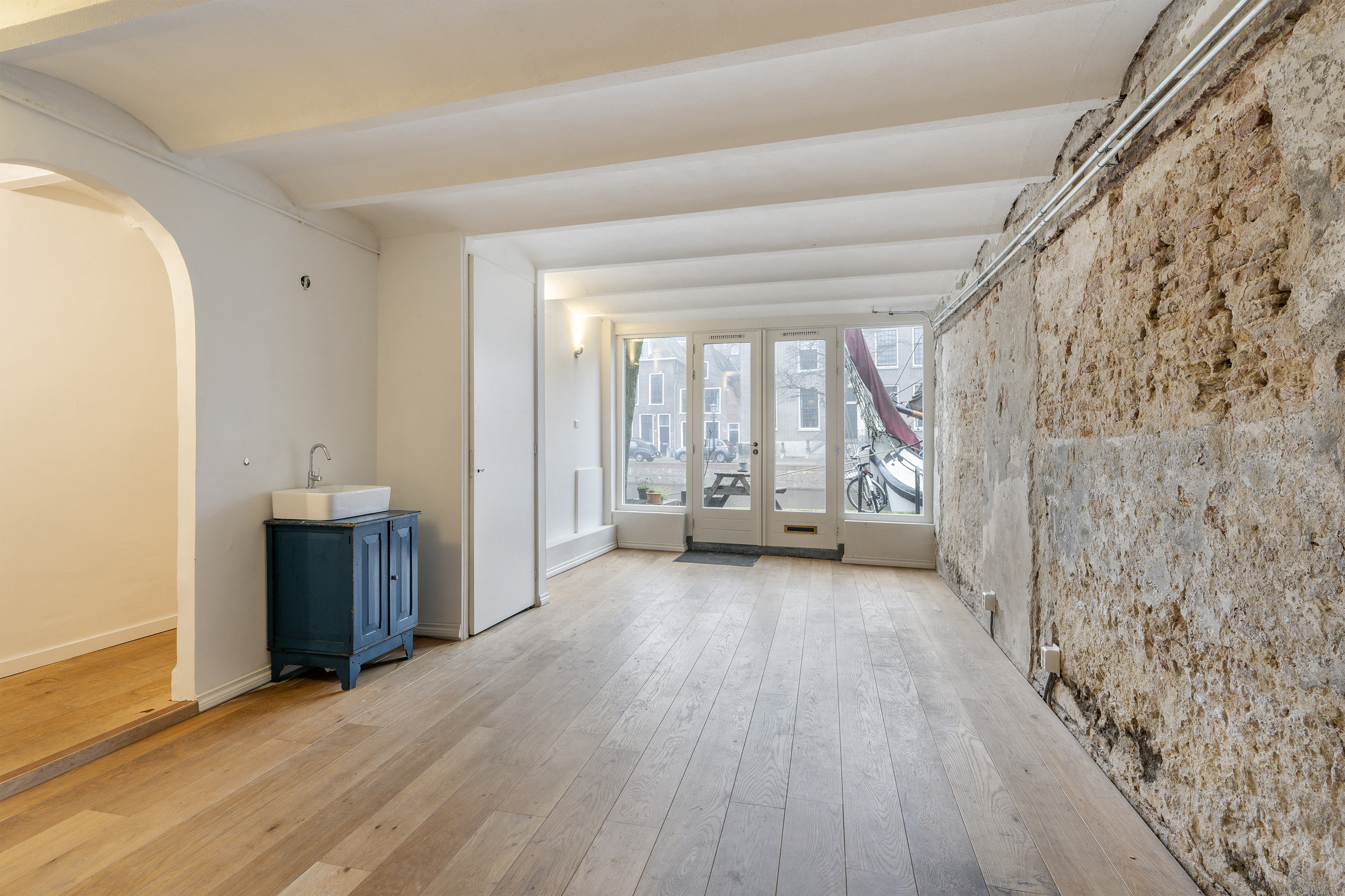 Via een vaste trap bereik je direct de woonkeuken van ca. 28m2. In deze keuken is het heerlijk ruim en licht. Gekozen is voor een industriële opstelling met diverse RVS keuken units en apparatuur: SMEG gasfornuis, afzuigkap, kokend waterkraan, vaatwasser en veel kastruimten. Ingebouwde CV ketel opstelling. Sfeervolle woonkamer van ca. 30m2 met een inbouwkast en een schitterend zicht op de historische haven met bebouwing. Aan de achterzijde bevindt zich nog een slaapkamer van ca. 8,6m2 en een toilet met fonteintje. Wederom een hoog plafond (2,9m) en mooie lichtinval. In 2019 is de vloer volledig vernieuwd door eiken visgraat parket, glad gestucte wanden en er is centrale verwarming aanwezig.