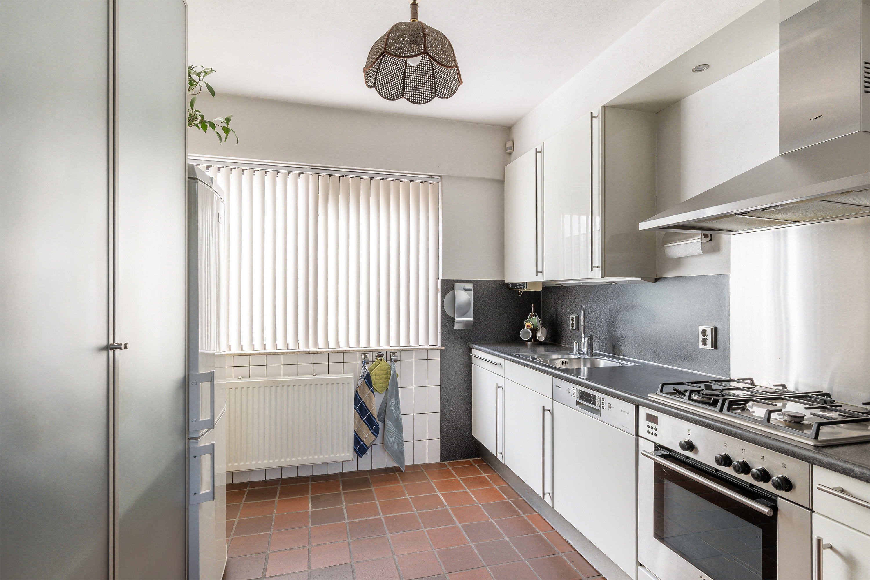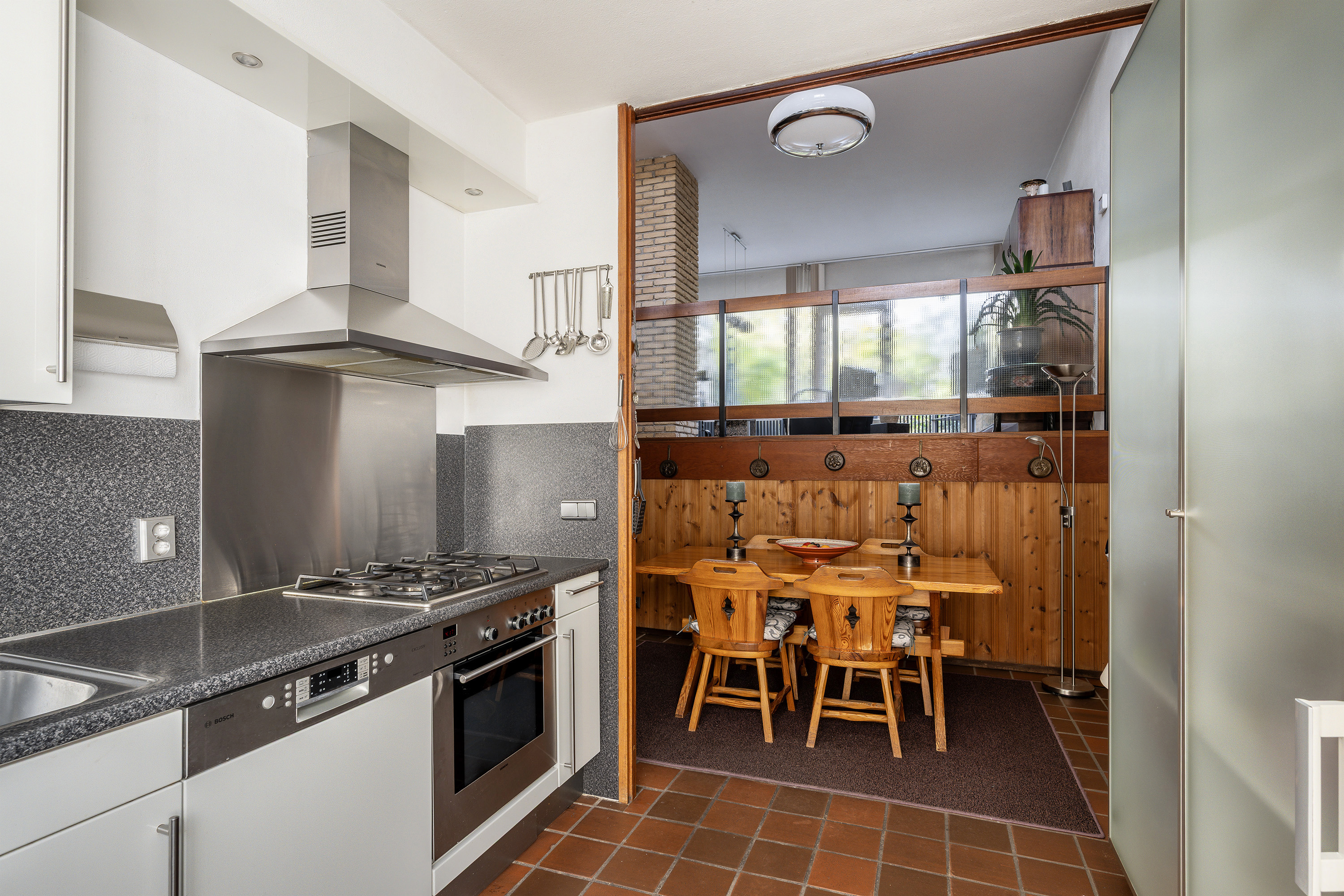 Ruime hal, toilet voorzien van fonteintje. De eetkamer van ca. 12m2 grenst aan de keuken en beschikt over een vaste kast. De keuken is voorzien van een eenvoudige keukenopstelling.
