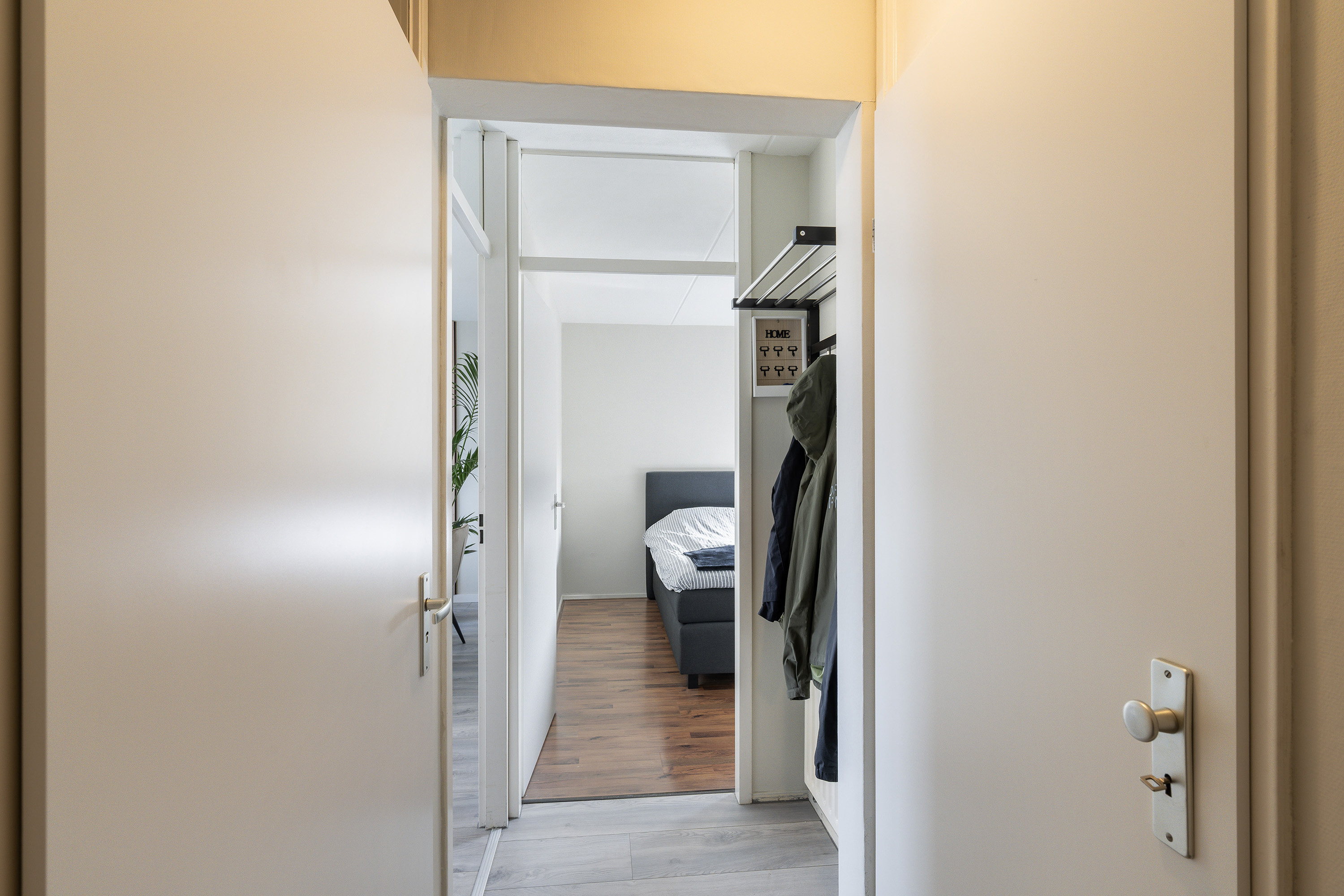 Entree, hal, meterkast en een praktische bergkast met de CV-ketel. De ruime en lichte woonkamer met aangrenzende keuken van tezamen circa 35m² is voorzien van een laminaatvloer en een directe toegang tot het balkon. De modern uitgevoerde keuken is uitgerust met veel werkblad en de navolgende inbouwapparatuur zoals een gaskookplaat, afzuigkap, combi-oven, koel-/vriescombinatie en vaatwasser. Riante slaapkamer van circa 13 m² voorzien van een ingebouwde kastenwand. De volledig betegelde badkamer heeft een douchecabine, wastafelmeubel en een aansluiting voor de wasmachine en droger. Toilet zit apart.