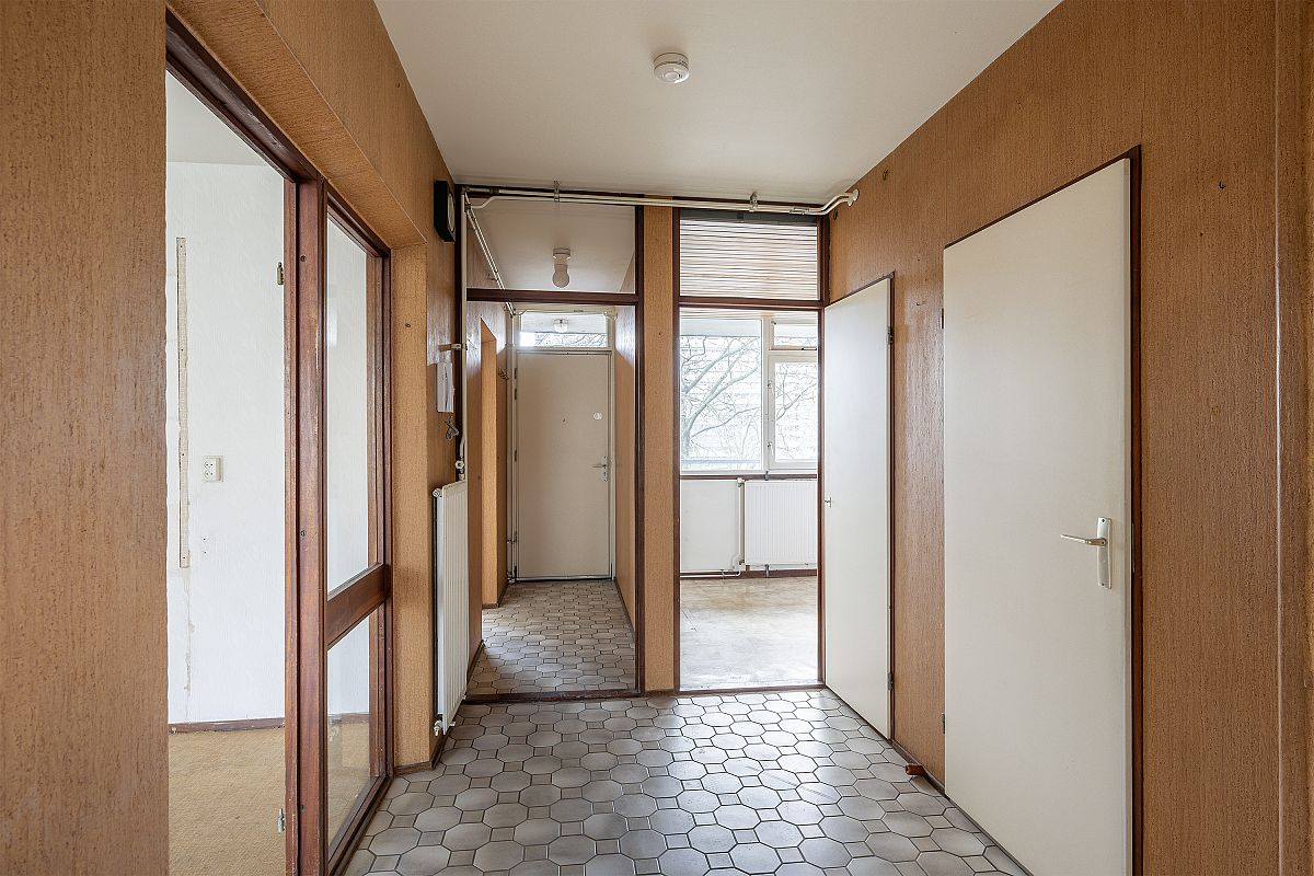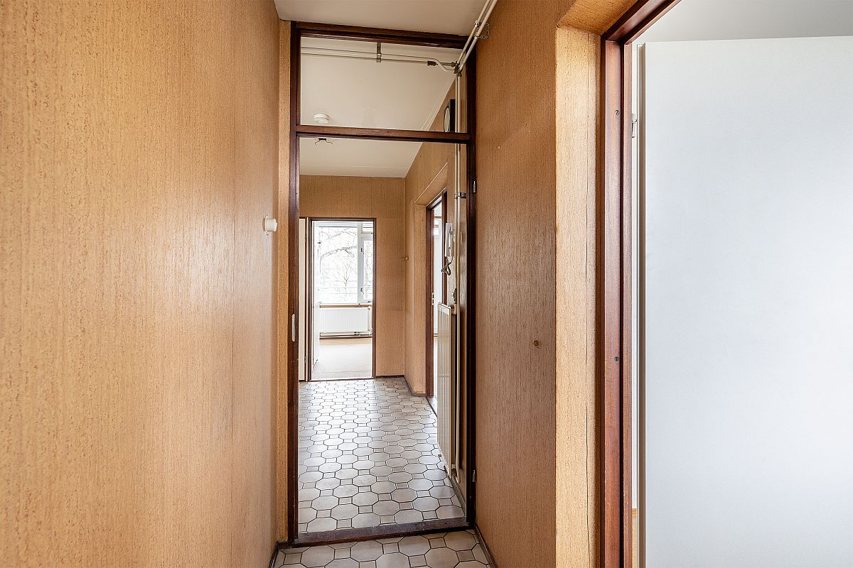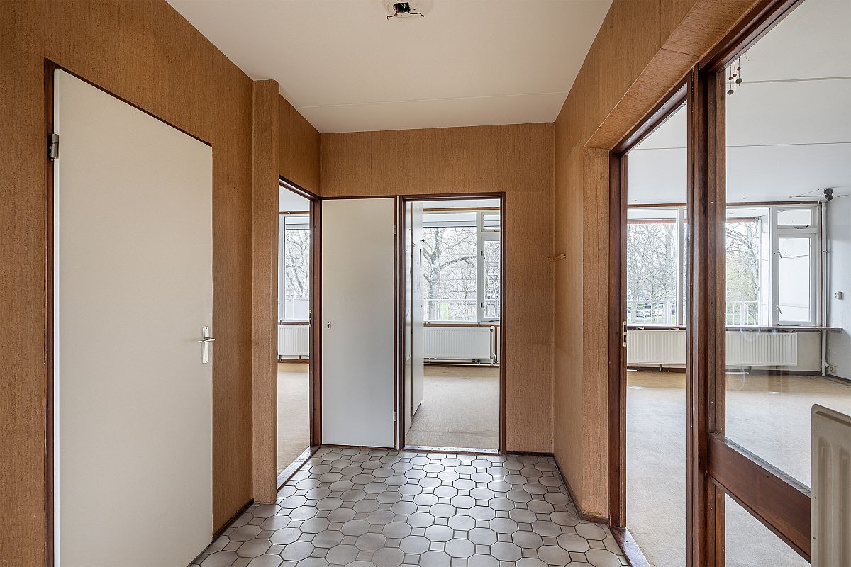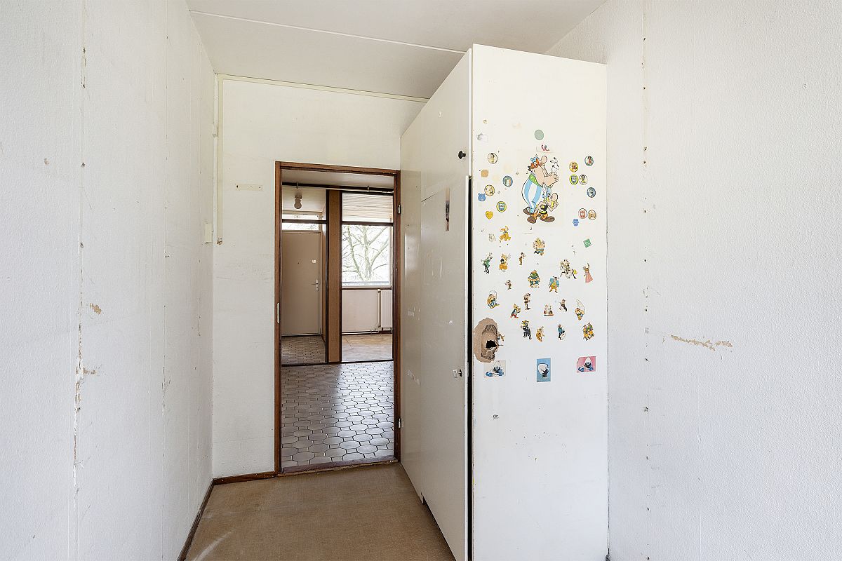 Apartment entrance, vestibule. Spacious hall with meter cupboard. Eat-in kitchen with a simple but neat kitchen unit. Hallway with access to a fully tiled toilet and bathroom. Spacious living room of approx. 29m² with access to the balcony. The balcony faces west and measures approx. 14m². There is an unobstructed view from the balcony. Bedroom 1 of approx. 7m². Bedroom II of approx. 9m². Bedroom III of approx. 12m².