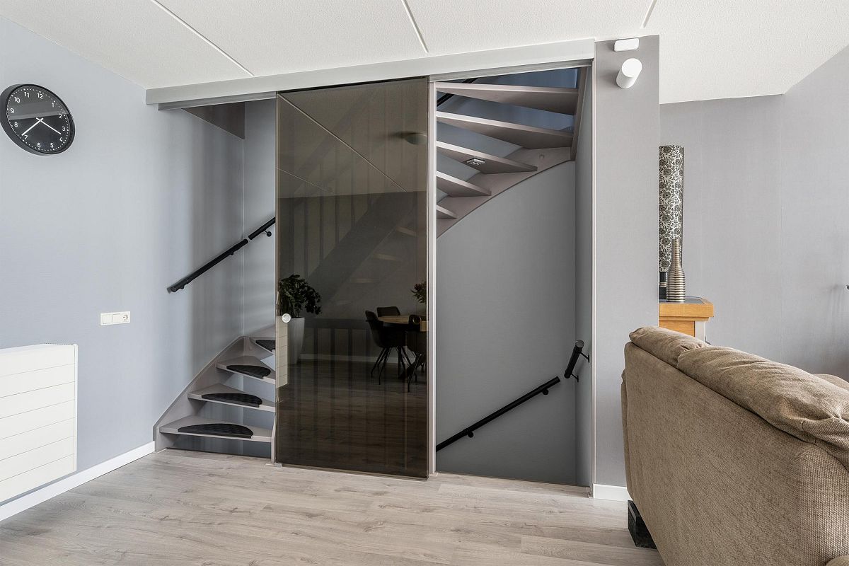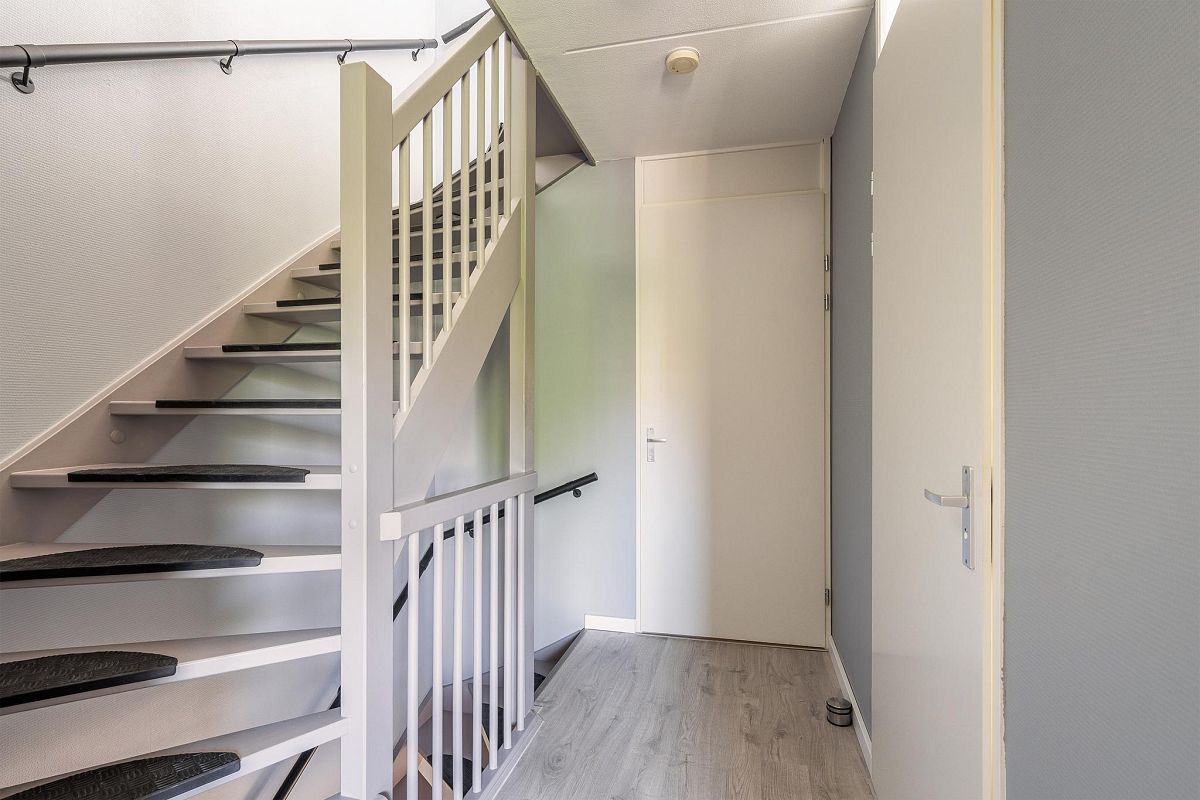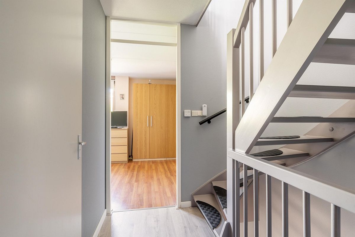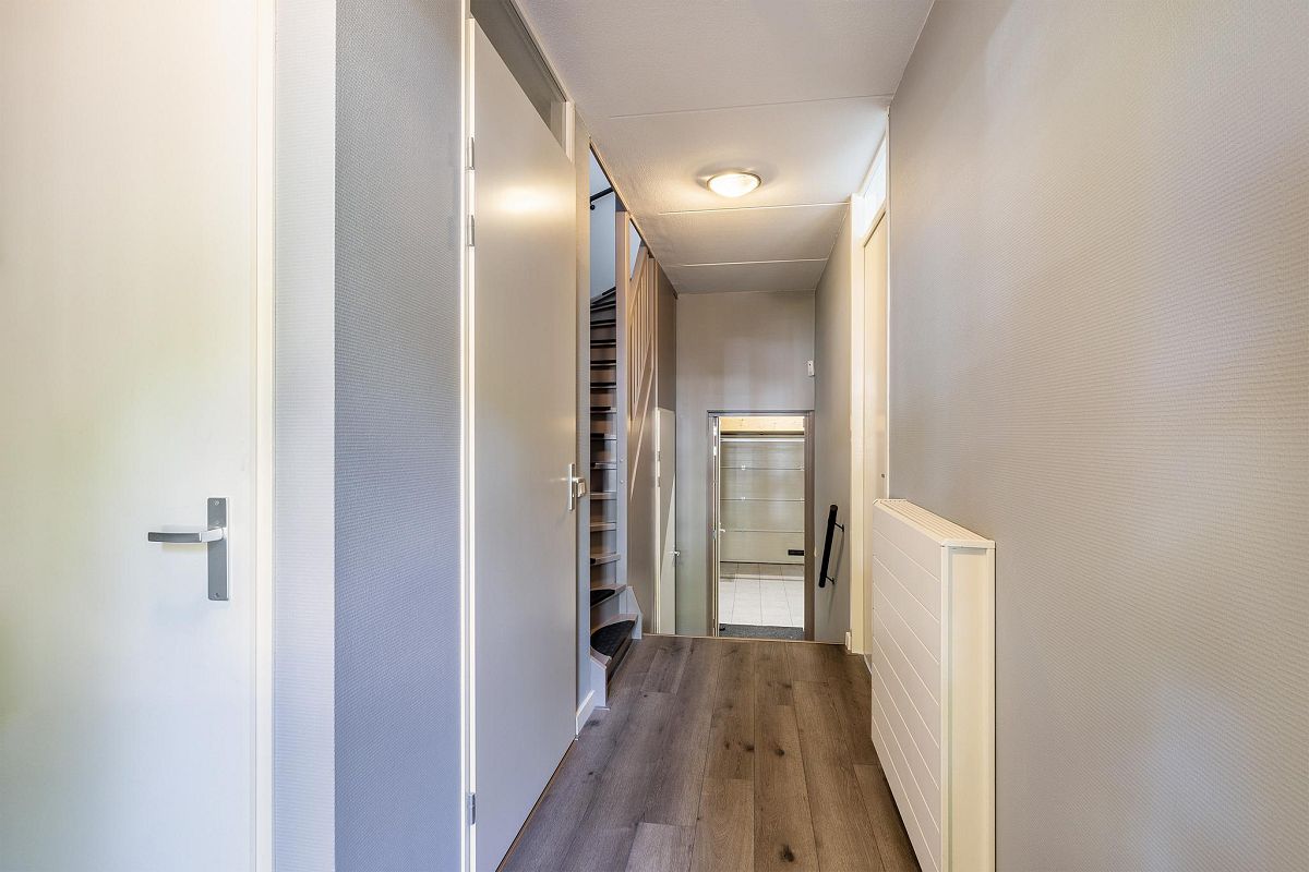Bij binnenkomst van de woning is er een ruime hal. Aan de rechterzijde van de hal bevindt zich een slaap/werkkamer van ca. 11.8m2. Aan de linkerzijde een apart toilet voorzien van fonteintje. Aan het einde van gang zijn 4 traptreden naar beneden, die je leidt naar de grote trapkast met veel opbergruimte en de toegang naar de ruime garage. Via de trapopgang ga je naar de woonverdieping.