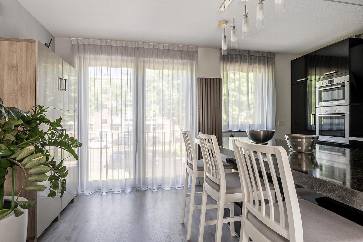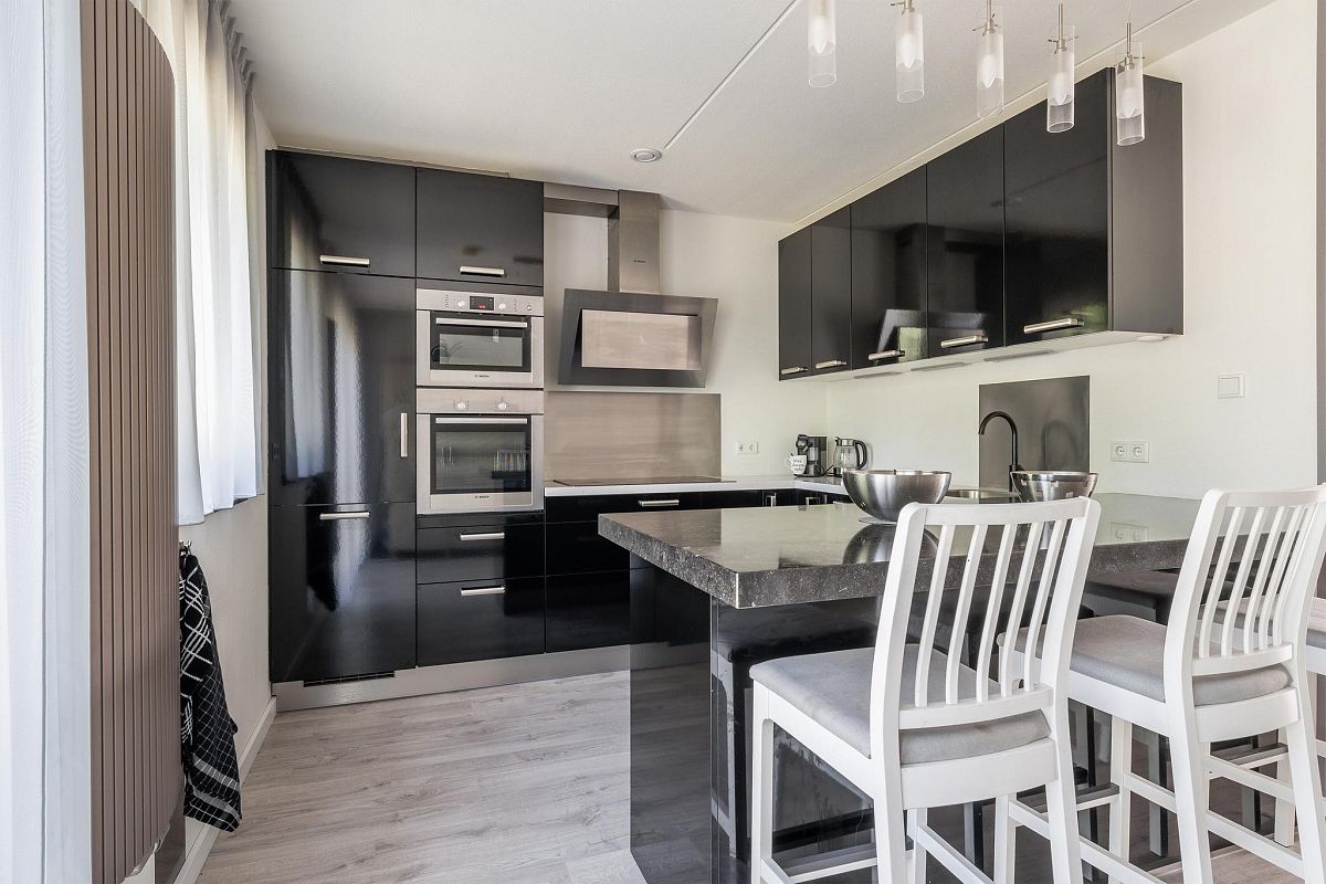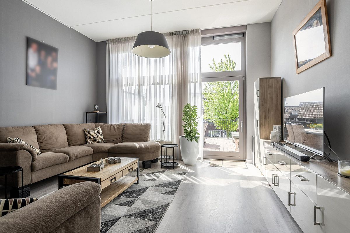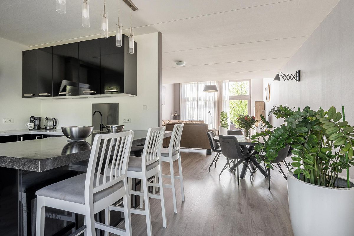 Deze ruime doorzon woonverdieping is praktisch ingedeeld in een open keuken, eetgedeelte en woongedeelte (totaal ca. 59m2!). Aangrenzend bevindt zicht het riante zonnige dakterras! De keuken bevindt zich aan de voorzijde en is voorzien van een keukenblok in een U opstelling met hoogglans zwart front. Verder is de keuken voorzien van een oven, combimagnetron, vaatwasser, koel/vrieskast en een inductiekookplaat en afzuigkap, allen van het fabricaat Bosch. Een gedeelte van het keukenblad is uitgevoerd in Belgisch hardsteen met een overstek, waardoor men aan het keukenblad kan eten of lekker kan borrelen. Het eetgedeelte grenst aan de keuken en het woongedeelte heeft een waanzinnig hoog plafond van bijna 3.60 meter. De achtergevel is voorzien van een grote glazen schuifpui. Vanuit de woonkamer loop je direct het aangrenzend riante zonnige dakterras op. Het trapgat naar boven of beneden in de woonkamer is af te sluiten met glazen deuren.