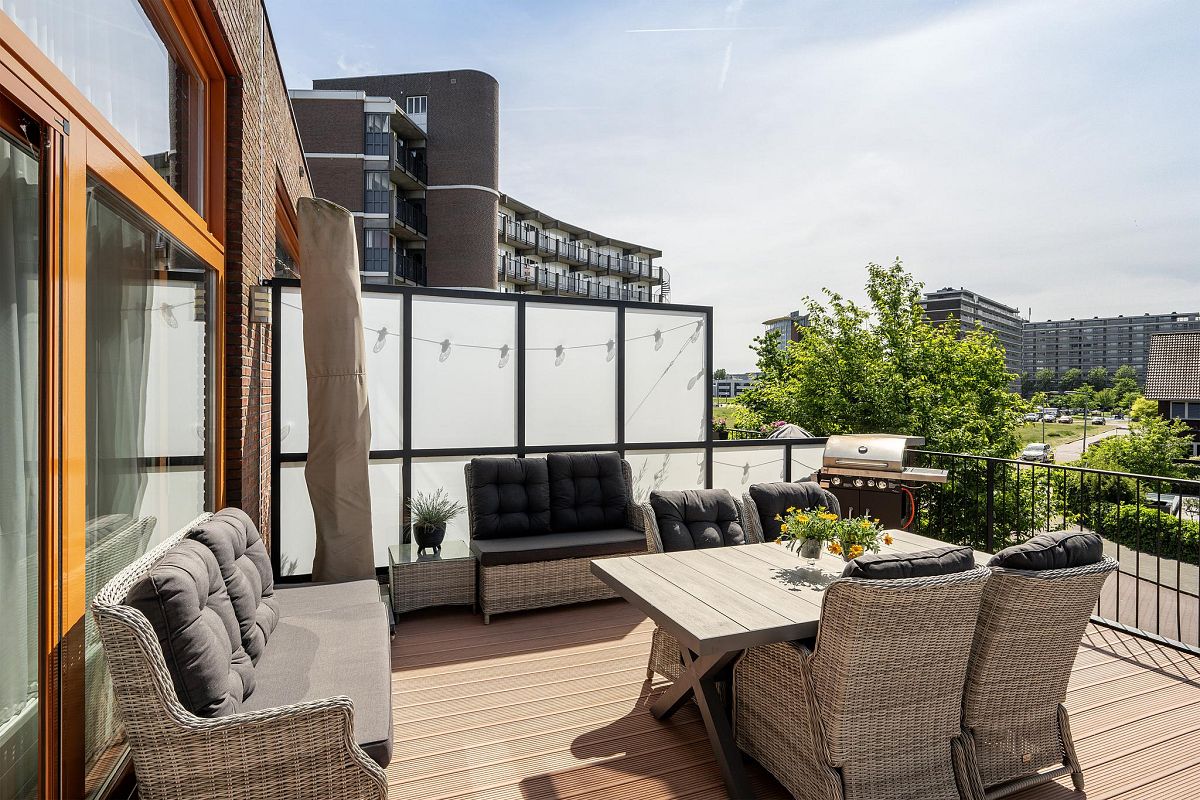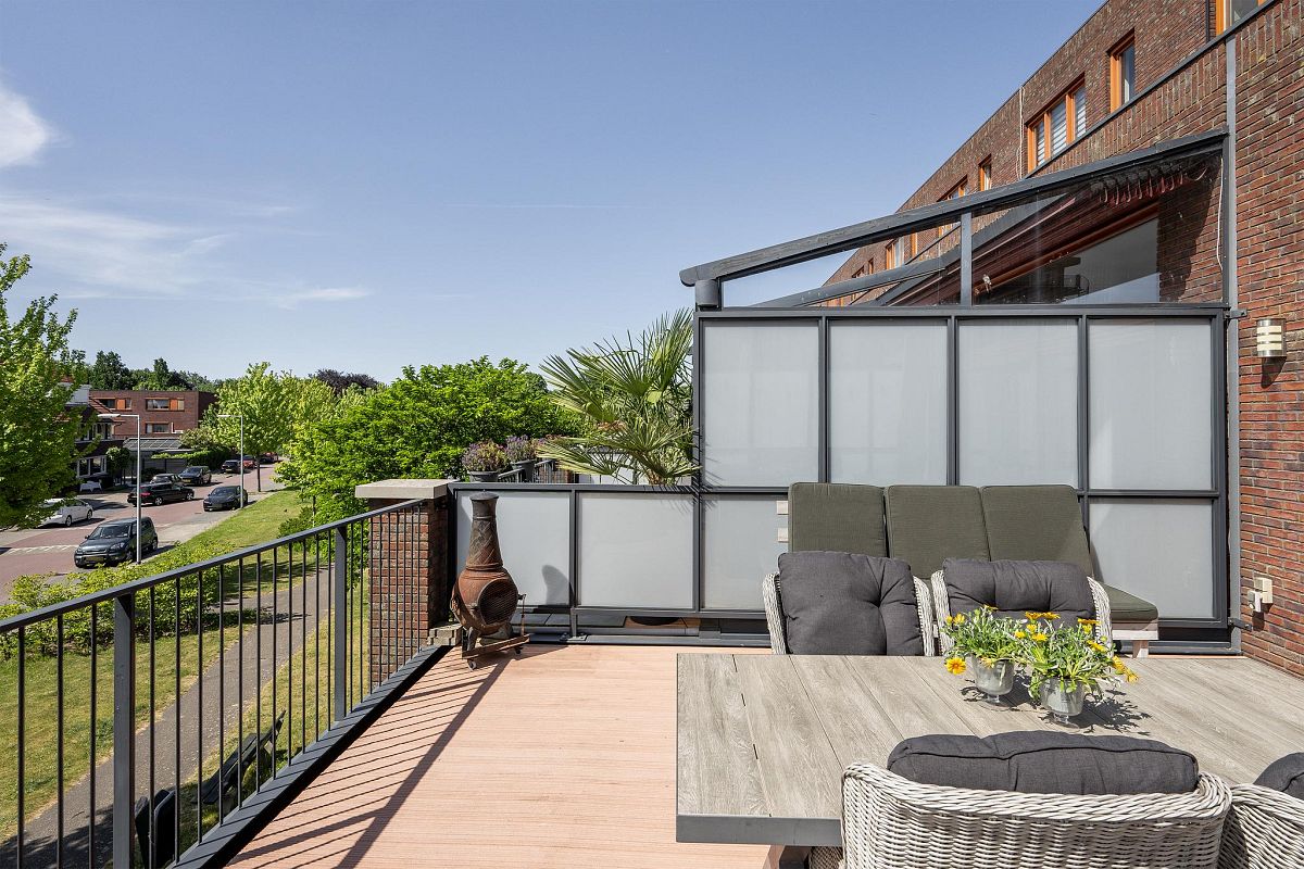 Zeer ruim en zonnig terras van ca. 31m2 gelegen op het zonnige zuid/westen. Het terras bevindt zich op de 1e verdieping en is te bereiken vanuit de woonkamer.