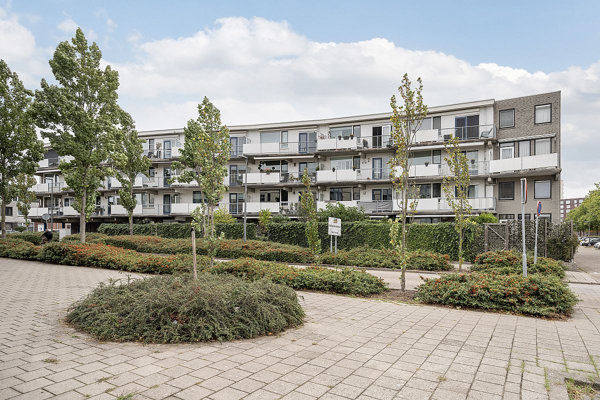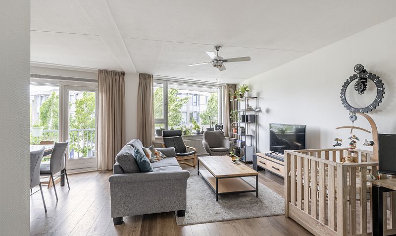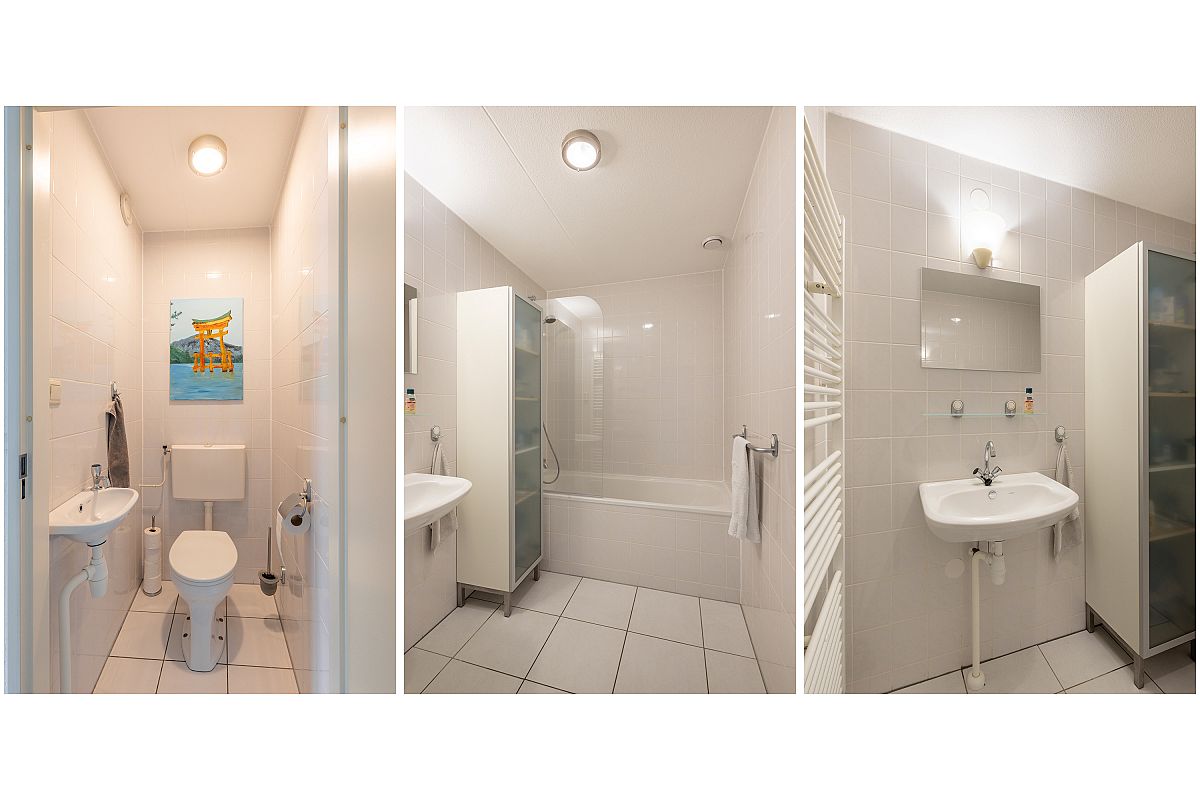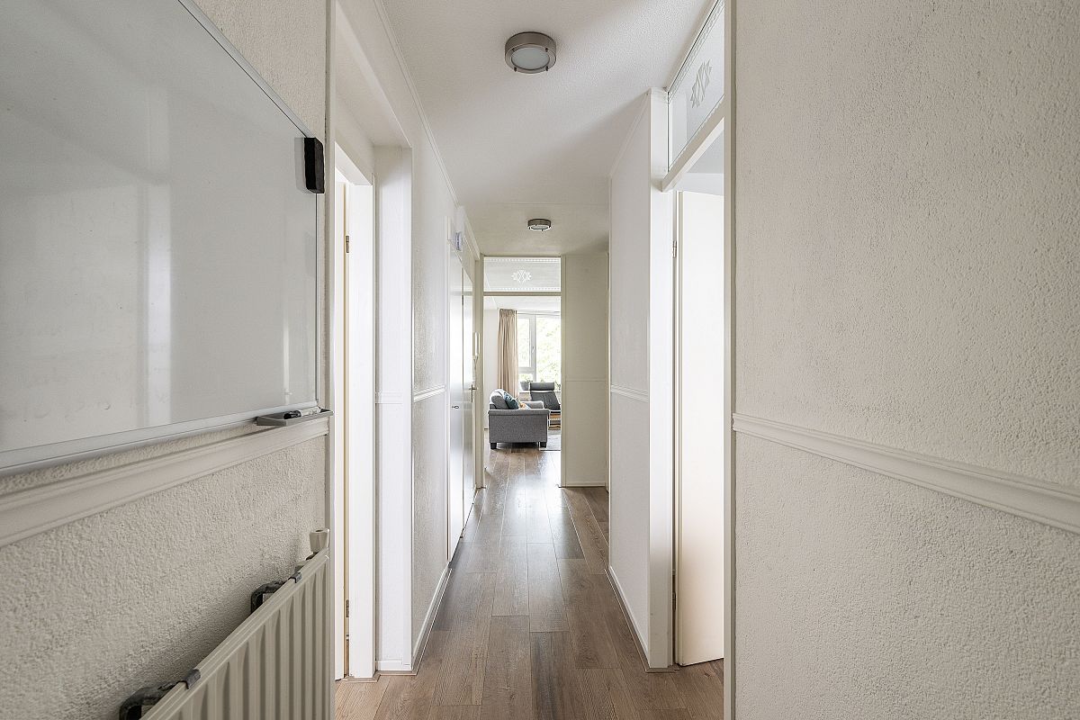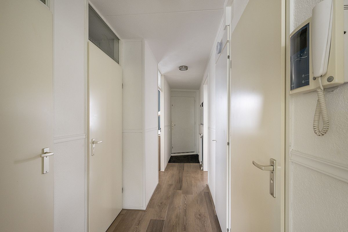 Entree, ruime gang welke toegang geeft tot alle vertrekken. Beide slaapkamers liggen aan de galerijzijde en zijn respectievelijk 11.1m2 en 6.6m2. De hoofdslaapkamer is voorzien van een schuifkastenwand. Separaat toilet met fonteintje. Inpandige berging welke fungeert als natte ruimte, maar ook gebruikt kan worden als extra bergruimte. De ruime badkamer is net uitgevoerd en voorzien van een douche/ligbad, radiator en een wastafel. Ruime woonkamer met open keuken van tezamen ruim 35m2. De keuken is voorzien van een L-vormige keukenopstelling voorzien van de volgende inbouwapparatuur: gaskookplaat, combi-oven, afzuigkap, vaatwasser en een koel/vrieskast.. Vanuit de woonkamer is er tevens het riante balkon bereikbaar.