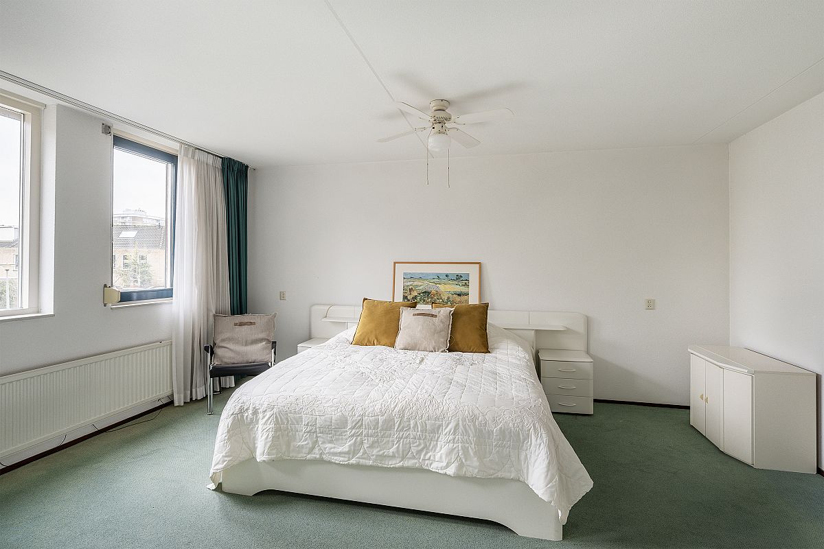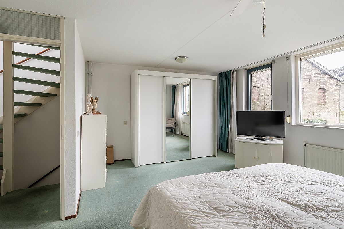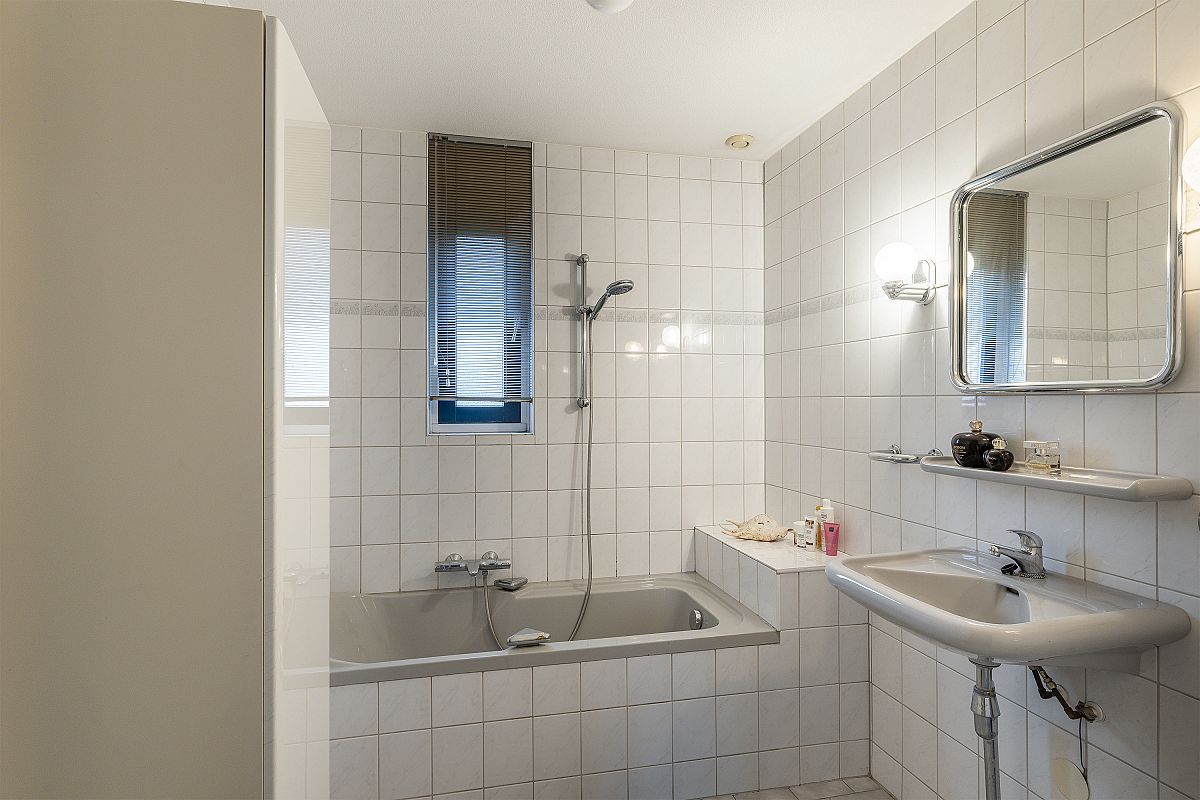 Overloop, trapopgang naar de 2e verdieping. Slaapkamer van ca. 11m2. De hoofdslaapkamer is 23.7m2. Deze kamer is op te splitsen in 2 kamers. De badkamer is verouderd, maar netjes en is voorzien van een ligbad/douche, wastafel en 2e toilet.