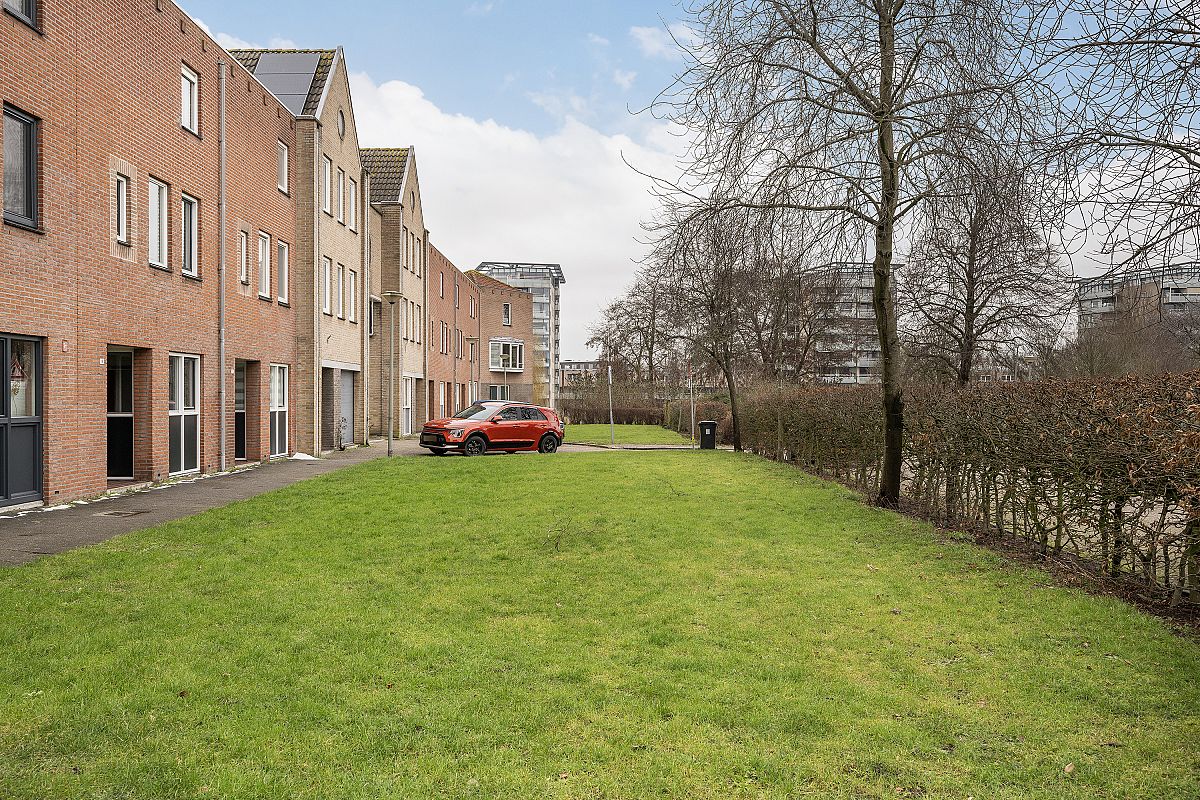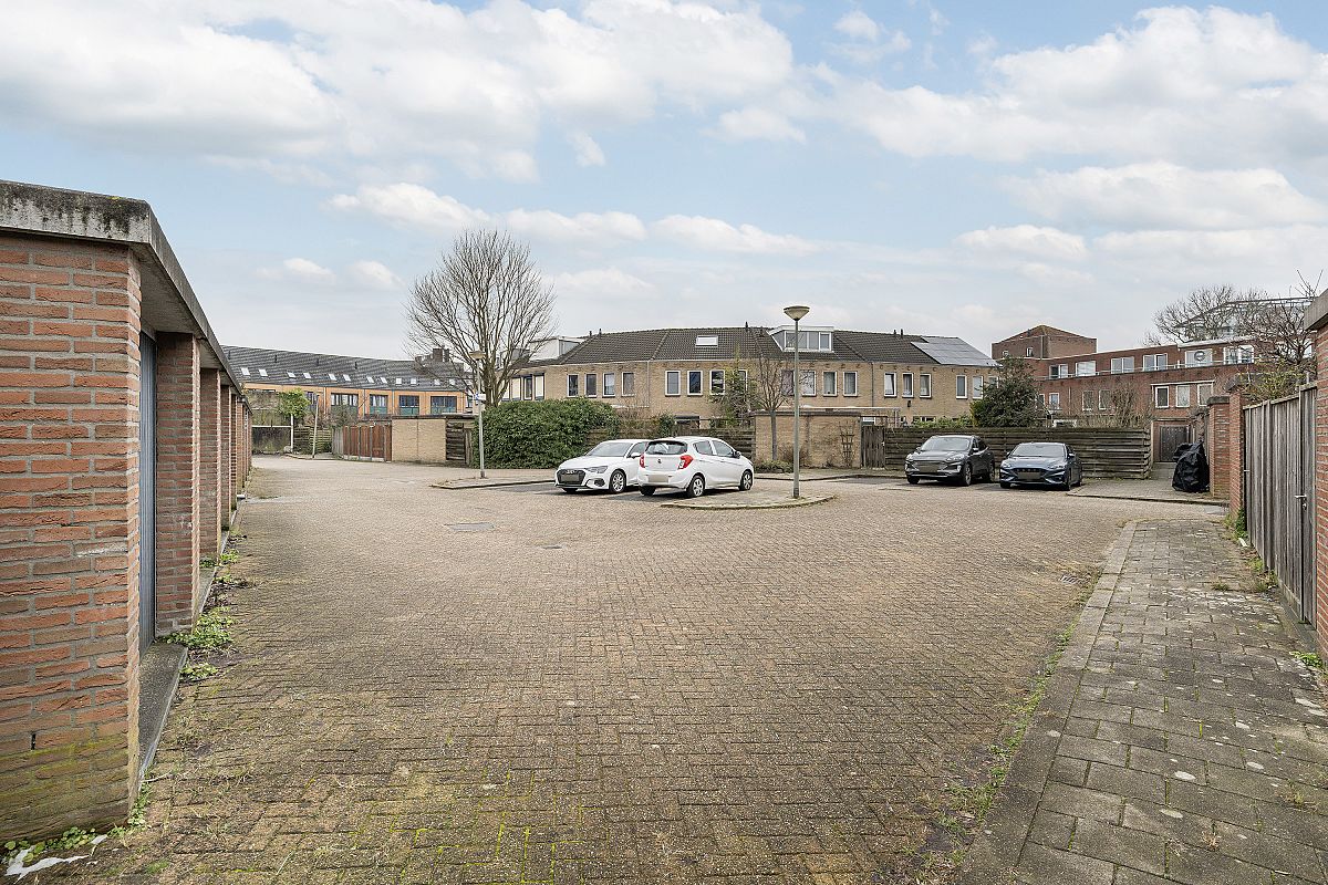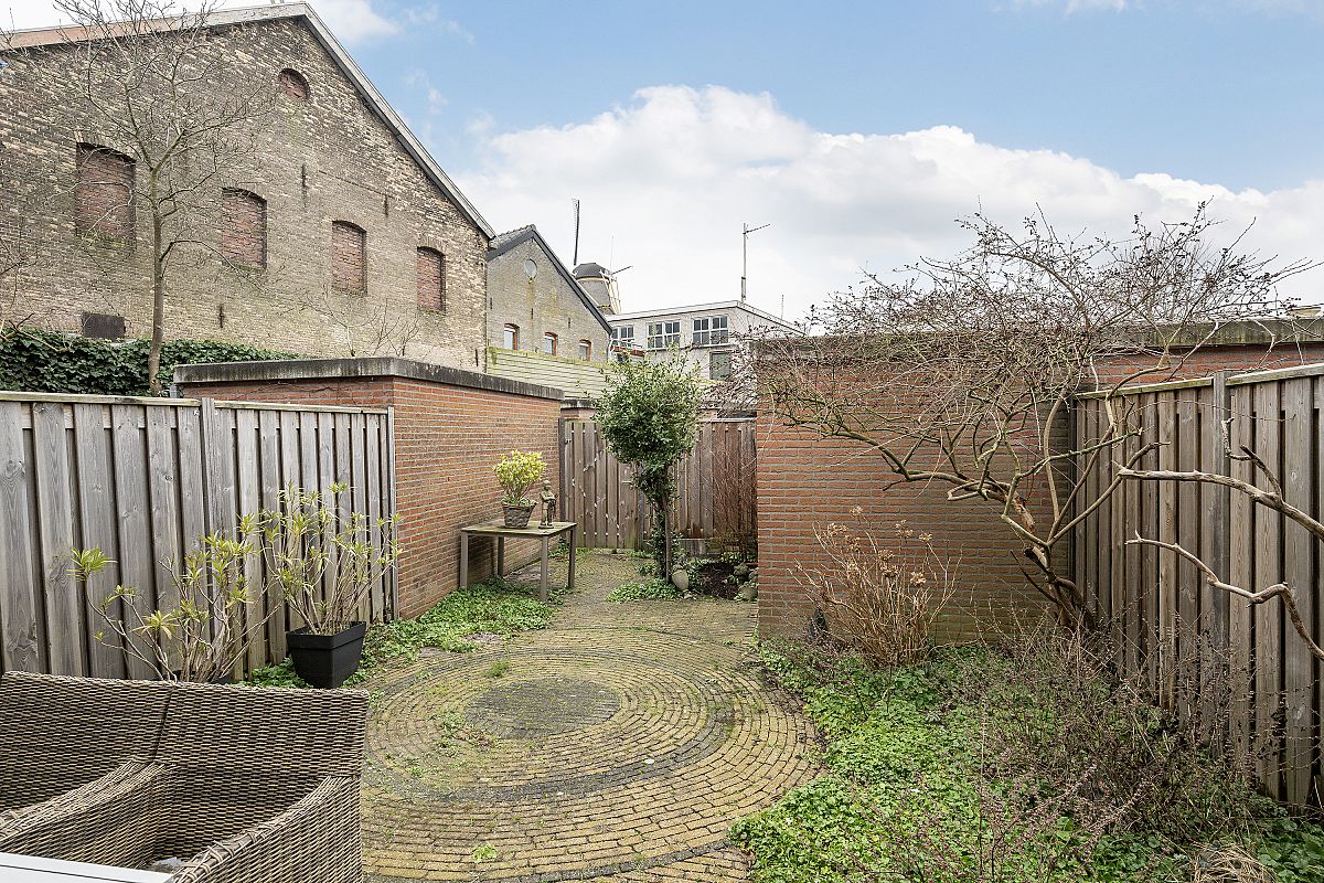 Spacious backyard facing the sunny southwest. The garden is 9.60 meters deep and 5.15 meters wide. There is a very spacious shed of over 9m² in the garden, and there is rear access. The rear access leads to a public parking lot where parking is permitted with a permit.