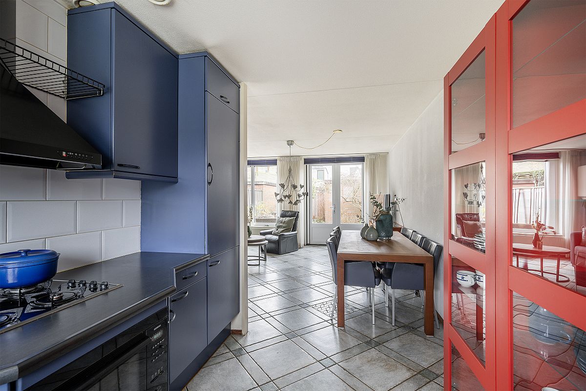 Entrance hall, meter cupboard, toilet with hand basin, and stairs to the first floor. The spacious living room and open-plan kitchen together measure approximately 35m². There is a storage cupboard under the stairs, and French doors provide access to the garden. The corner kitchen is located at the front of the house and is equipped with built-in appliances: a refrigerator, freezer, dishwasher, combination microwave oven, gas cooktop, and extractor hood. First floor: