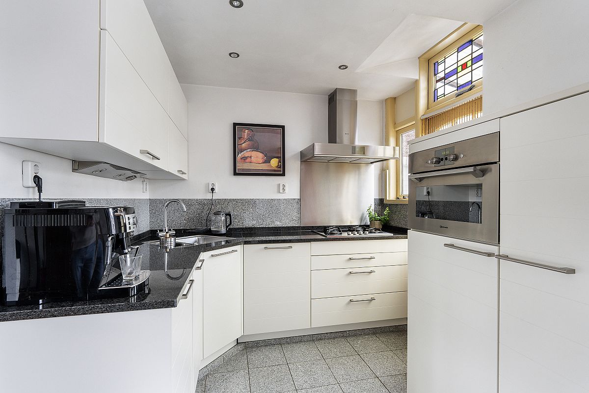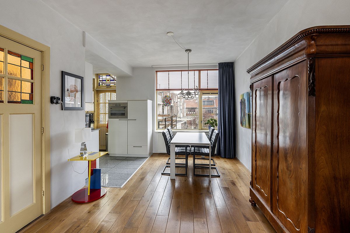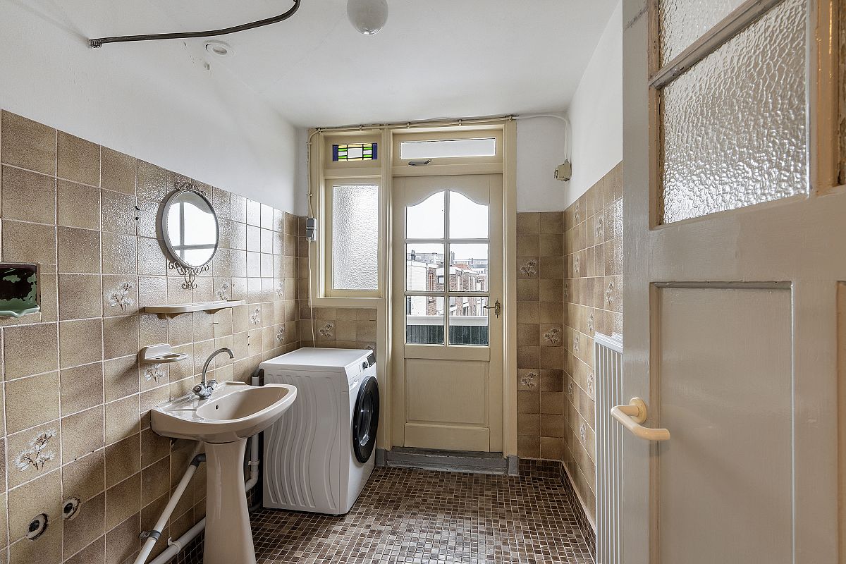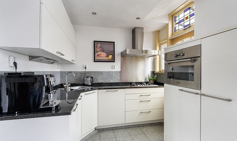 Landing with toilet. Spacious and inviting living room including kitchen (approx. 41 m²). Located on the first floor, the property offers privacy, abundant natural light from large front and rear windows, and a wide view over the square. Part of the windows still have beautiful stained glass, and a bay window at the front adds character. The modern kitchen at the rear is equipped with dishwasher, fridge, gas hob, extractor hood, microwave, and combi oven. Access to balcony and roof terrace.