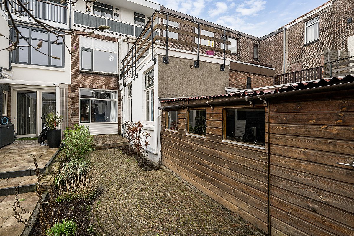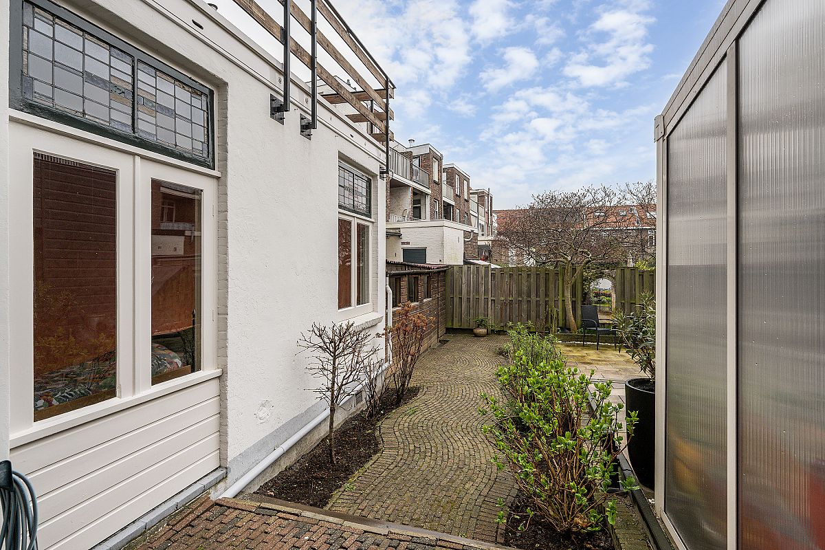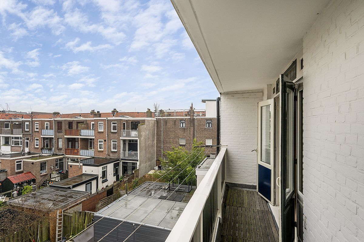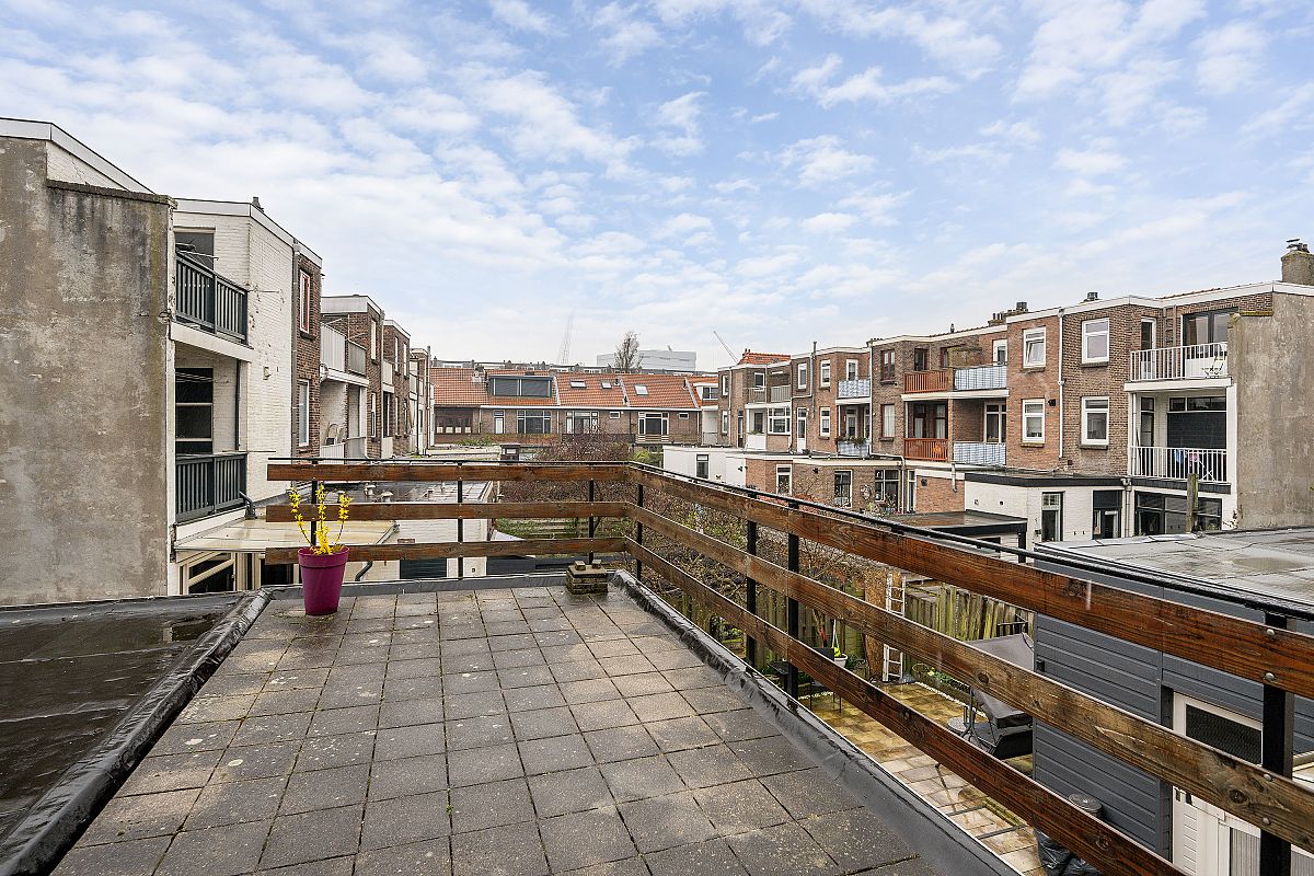 Totaal 24m2 aan balkonoppervlakten, bestaande uit een balkon met aansluitend dakterras op de 1e verdieping en een balkon op de tweede verdieping. De tuin van ca, 12m diep ligt op het zuiden en biedt ruimte voor een zonnig terras. De tuin bevat tevens een grote houten fietsenberging/schuur van ca. 12,8m2 (5,38m x 2,37m) en met een eigen achteringang.
