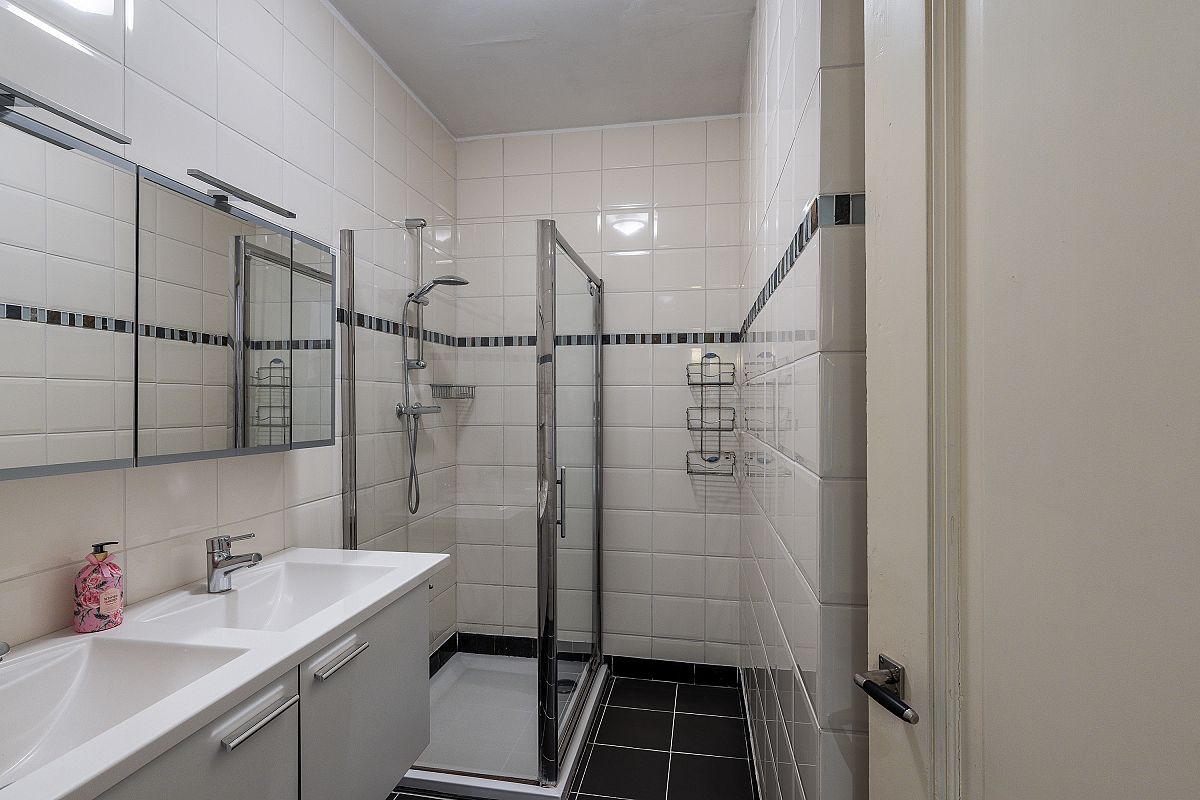 Entrance, vestibule, hallway, stairs cupboard/meter cupboard, toilet with washbasin. Modern bathroom of approx. 4.3 m² with large shower and double sink. Front bedroom approx. 12.8 m². Rear bedroom approx. 13.8 m². Garden-side bedroom approx. 13.3 m². Access to the garden.