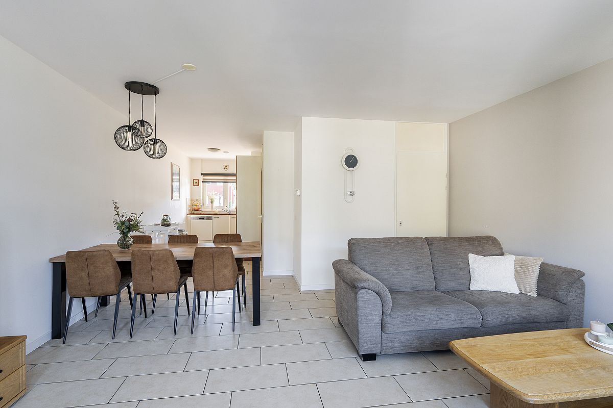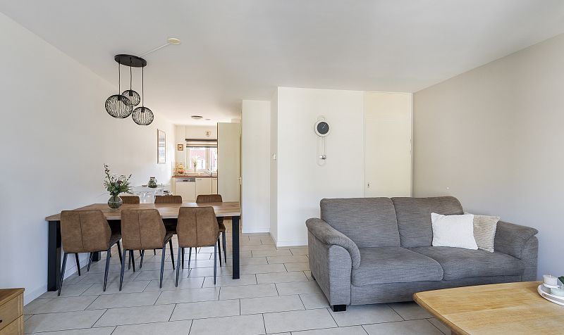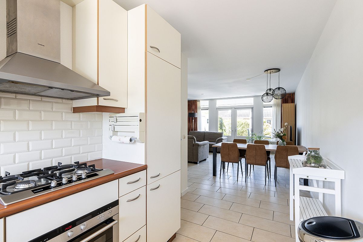 Entrance, hallway, meter cupboard, toilet, staircase, and access to the internal storage room (accessible from both inside and outside). The spacious living room with open kitchen of approximately 31m² features French doors overlooking the backyard. The open kitchen is located at the front and is equipped with various upper and lower cabinets and built-in appliances: 4-burner gas hob, extractor hood, dishwasher, fridge/freezer combination, and a combi-oven.