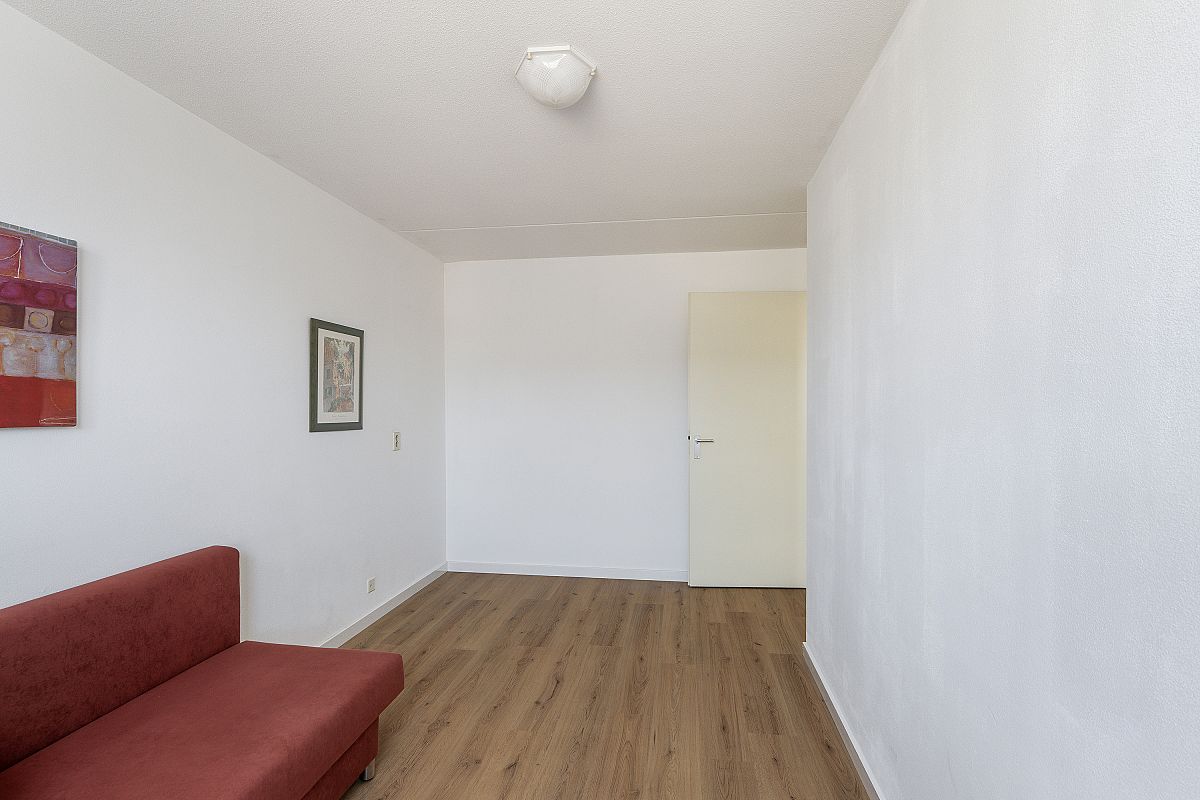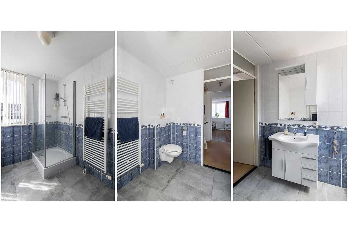 Overloop, trapopgang en toegang tot 3 slaapkamers en de badkamer. Twee slaapkamers aan de achterzijde van respectievelijk ca. 9m² en ca. 12.5m². De 3e slaapkamer op deze verdieping ligt aan de voorzijde en is ca. 11m². De ruime en netjes uitgevoerde badkamer is voorzien van een douche, wastafelmeubel met spiegel, toilet en een designradiator.