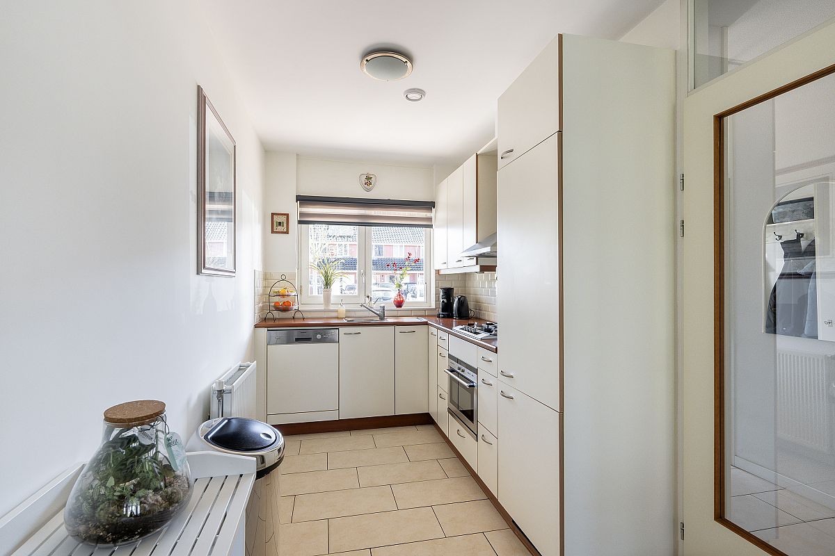 Entree, hal, meterkast, toilet, trapopgang en toegang tot de inpandige berging (zowel van binnen als buiten te bereiken). De ruime woonkamer met open keuken van tezamen ca. 31m² heeft openslaande deuren met uitzicht op de achtertuin. De open keuken ligt aan de straatzijde en is voorzien van diverse onder- en bovenkasten en diverse inbouwapparatuur: 4-pits gaskookplaat, afzuigkap, vaatwasser, koel-/vriescombinatie en een combi-oven.