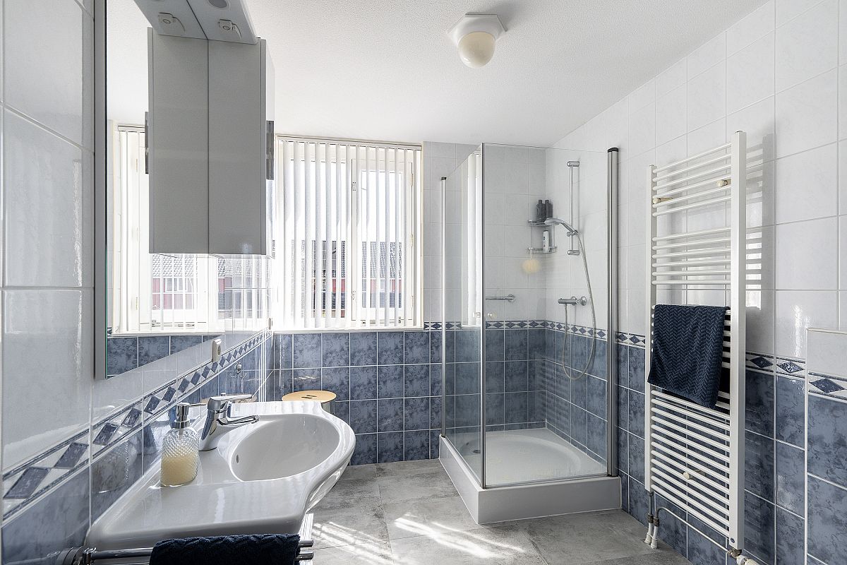 Landing, staircase, and access to 3 bedrooms and the bathroom. Two bedrooms at the rear of approximately 9m² and 12.5m² respectively. The 3rd bedroom on this floor is located at the front and is approximately 11m². The spacious and neatly finished bathroom is equipped with a shower, vanity unit with mirror, toilet, and a design radiator.