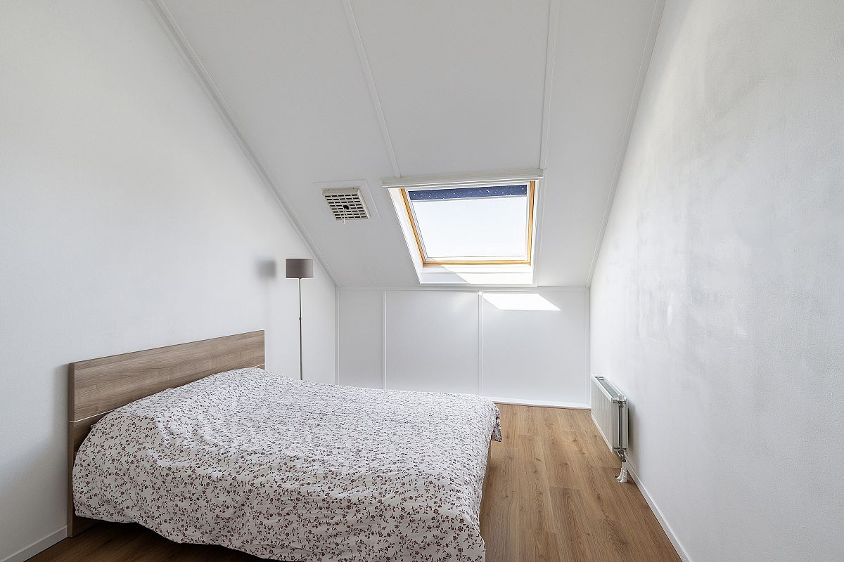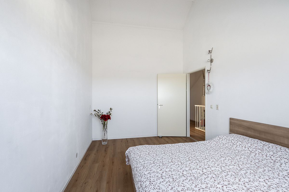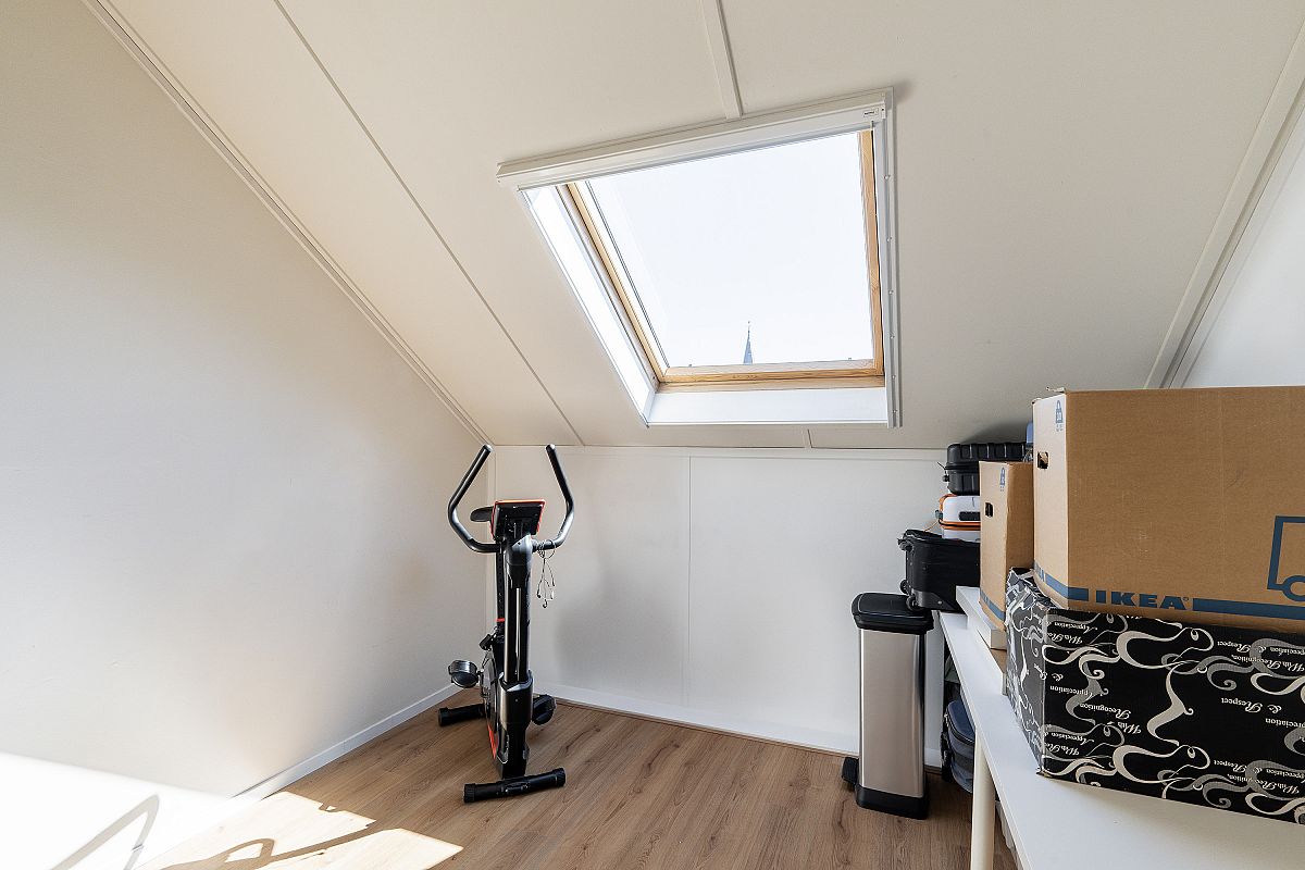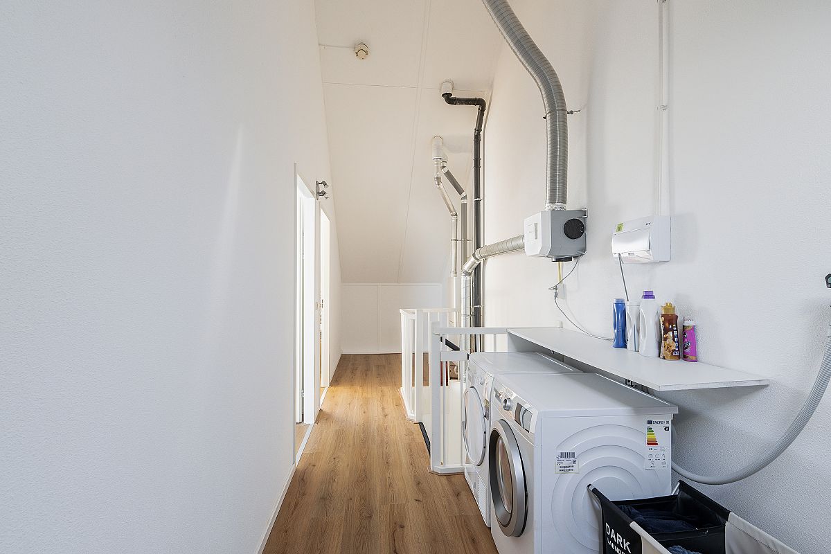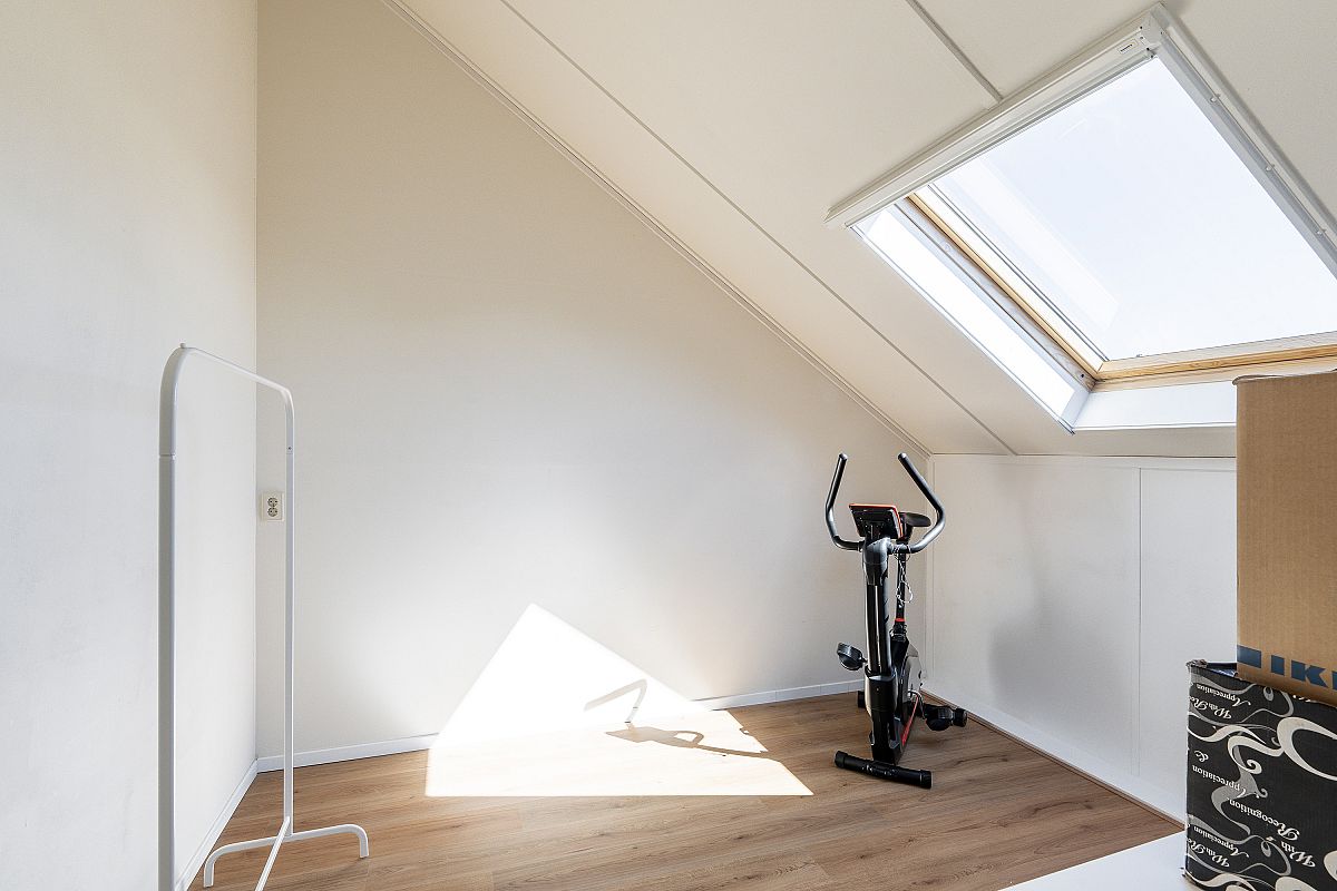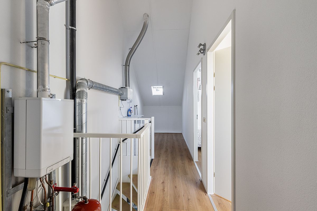 Ruime overloop met toegang tot de overige 2 slaapkamers, welke ook ruim bemeten zijn met ca. 15m² en ca. 10m². Beide kamers zijn voorzien van een Velux dakraam met zonwering en hebben een extra hoge nok. De overloop dient deels als technische ruimte met de opstelplaats van de cv-combiketel, de unit van de mechanische ventilatie en de aansluiting voor wasmachine-/droger. Het is eventueel mogelijk om hier een tweede badkamer te realiseren.