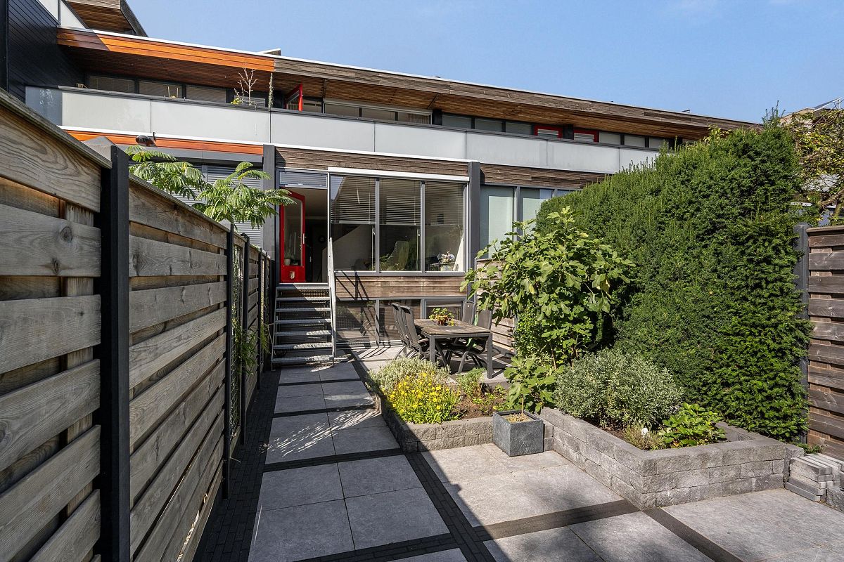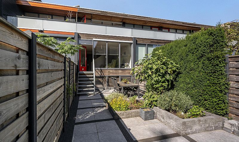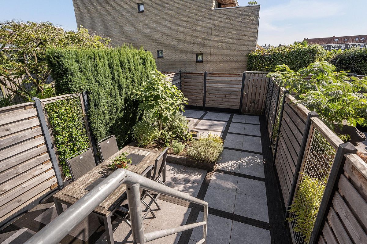 Bij de woning hoort een in 2021 mooi aangelegde zonnige tuin van ca. 9,5m diep en 4,4m breed voorzien van mooie grote keramiektegels, planten, borders, houten schutting met betonpalen en een achterom. Buitenkraan aanwezig.