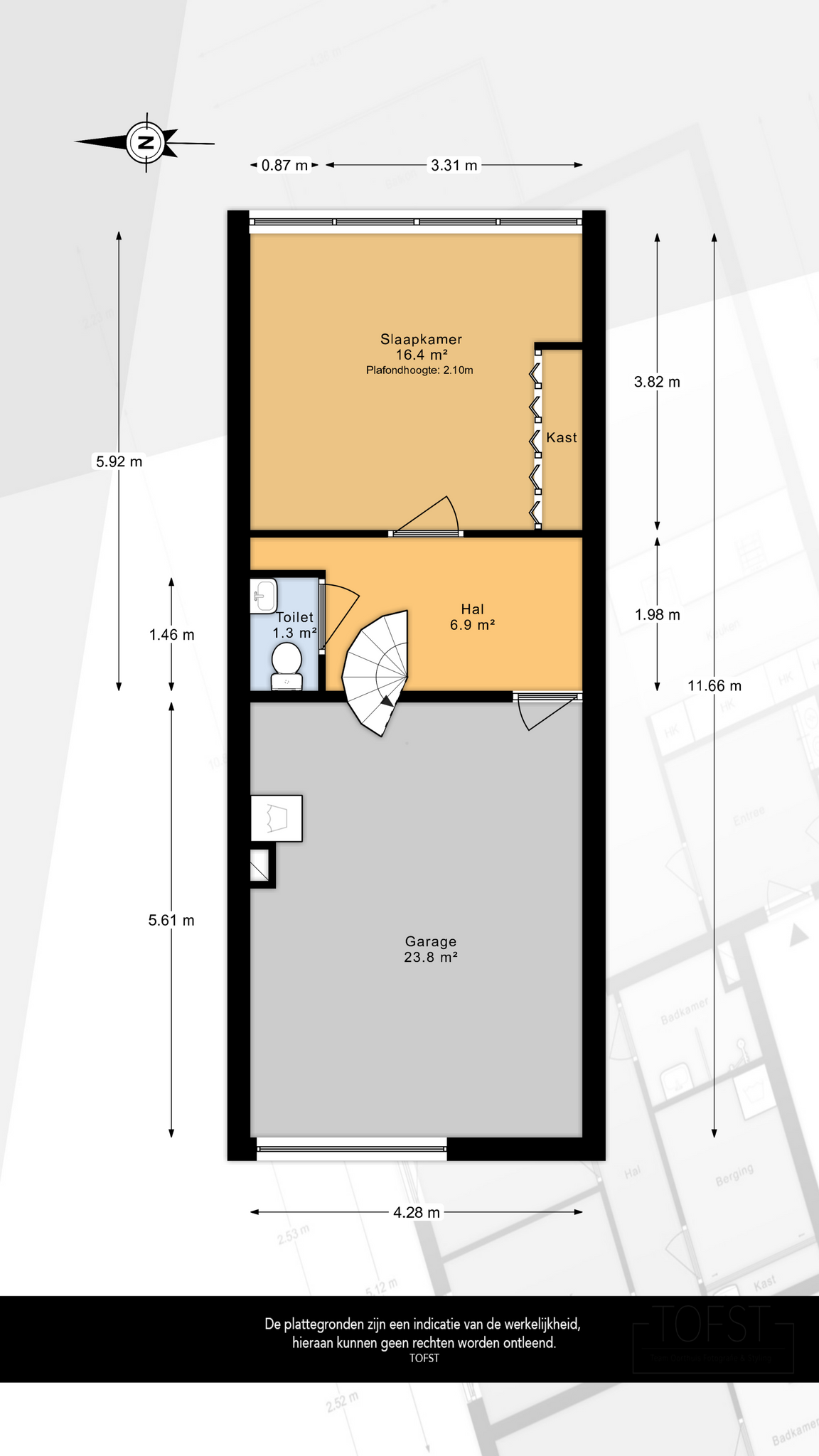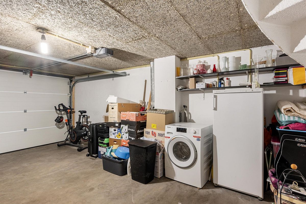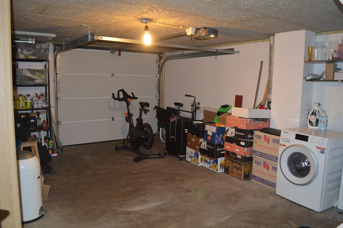 De garage 5,61m x 4,28m is voorzien van een elektrische roldeur en thans in gebruik als berging en wasruimte. Hier bevinden zich ook de aansluiting voor de wasmachine en de droger.