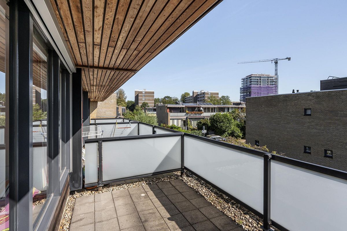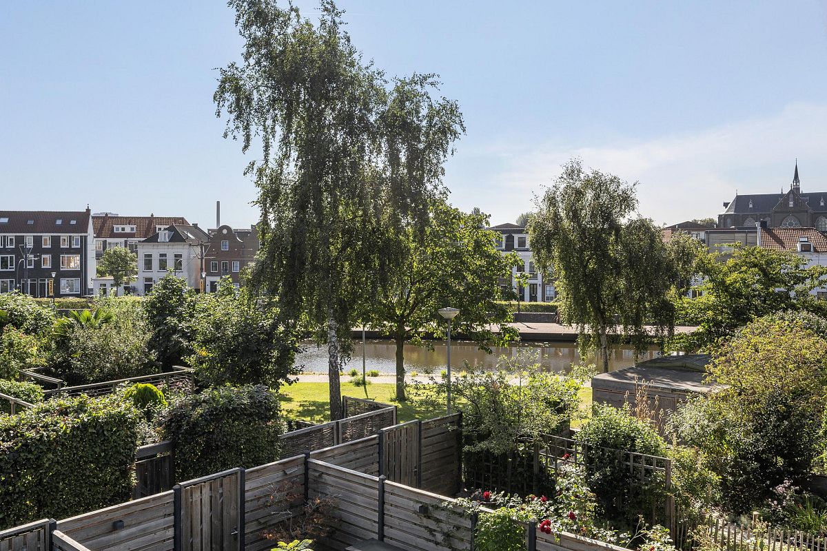 Vanuit het terras (4,42m lang en 2,34m breed) is een leuk zicht op de Schie.