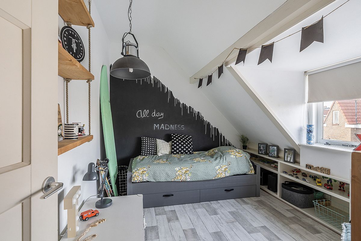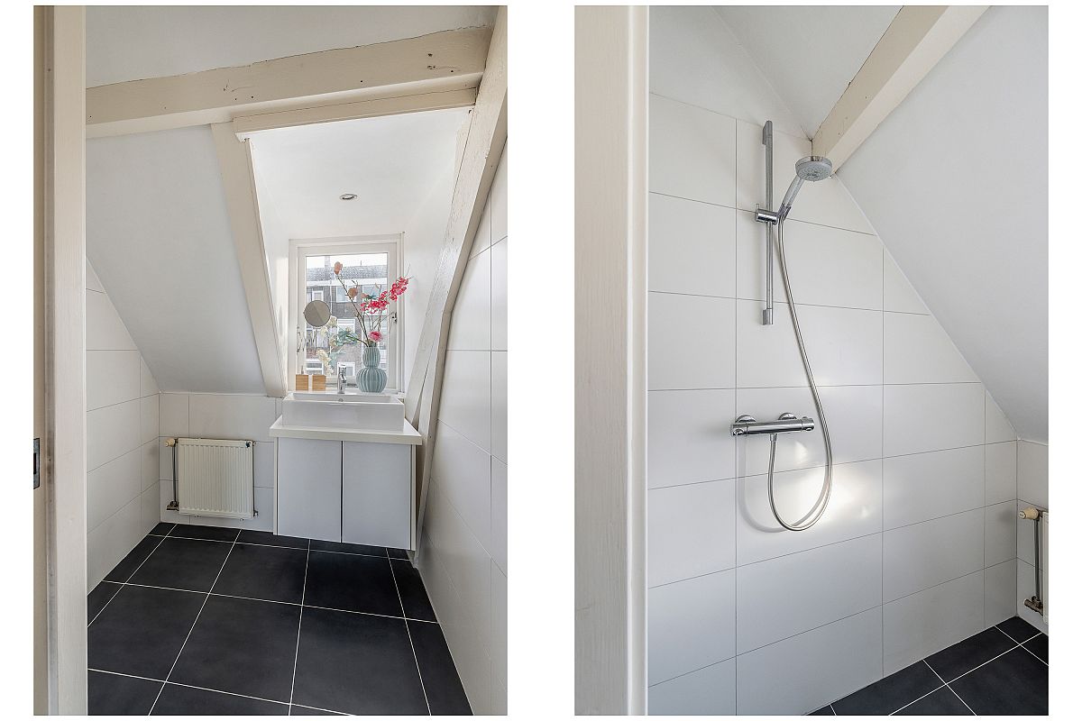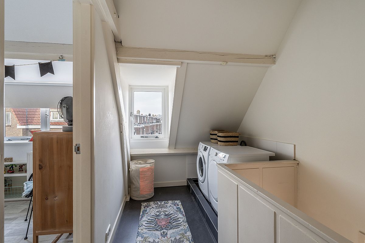 Overloop met ruimte voor de wasmachine/droger (betonnen bak met afvoerput). Op deze verdieping bevinden zich ook nog ruime 2 slaapkamers van 9m2. Beide kamers zijn voorzien van een voorzien van een dakkapel. 2e badkamer voorzien van een douche en wastafelmeubel.