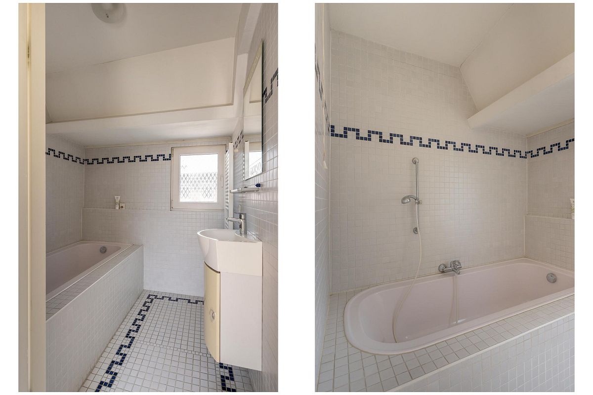Op deze verdieping bevindt zich een tweede badkamer, uitgerust met een ligbad, wastafelmeubel met spiegel en een raam.