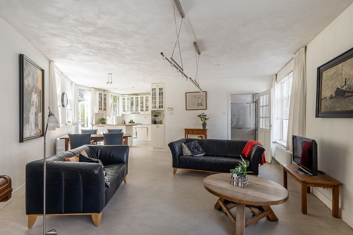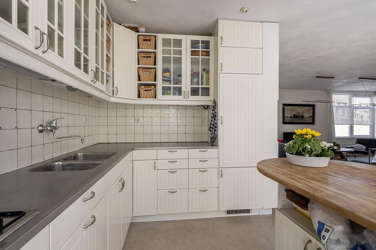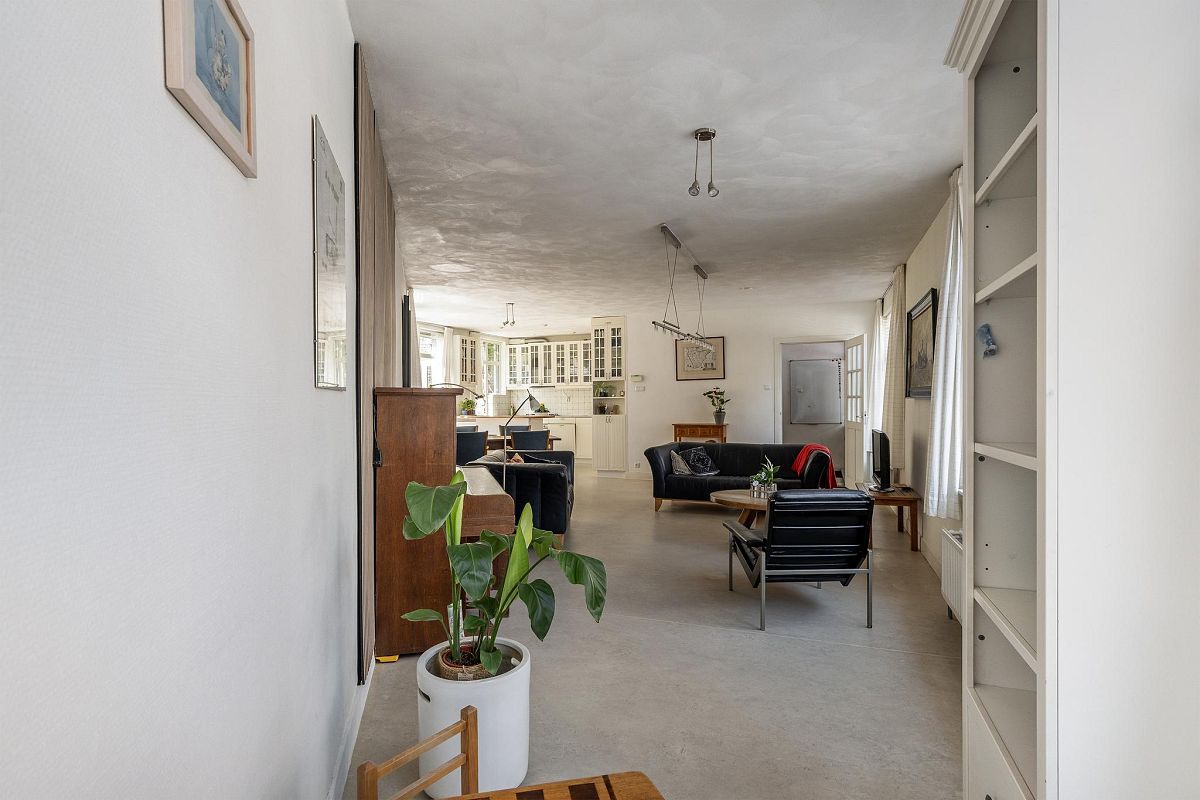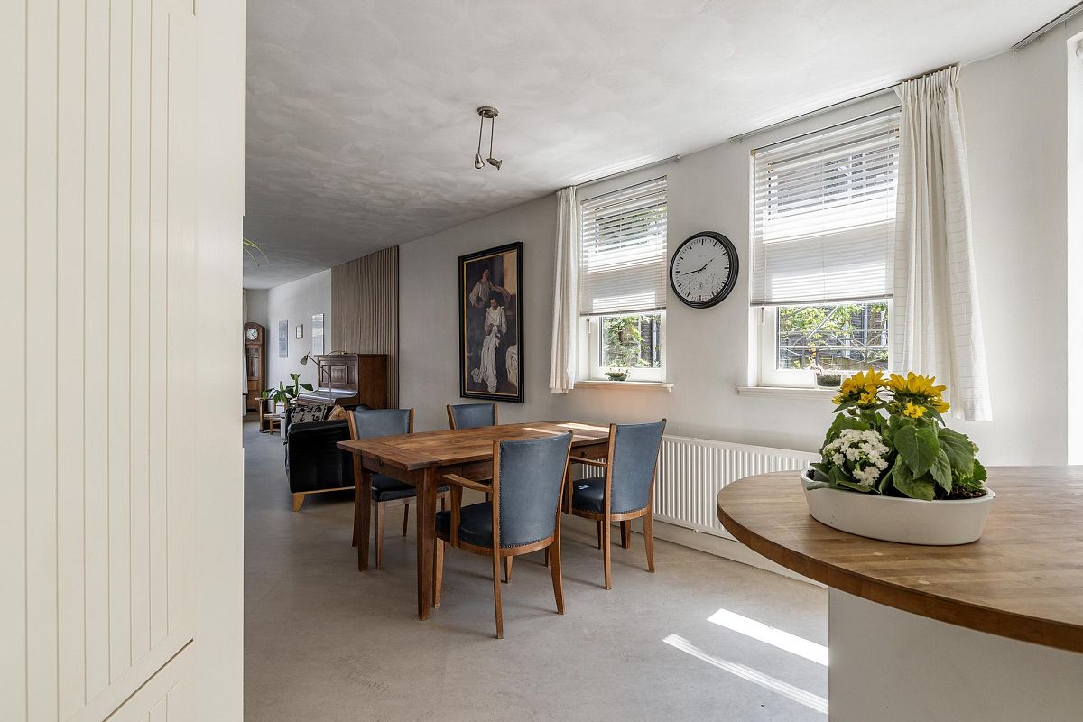 Entree, ruime hal met trapopgang, meterkast en een modern toilet met fonteintje. De opvallend ruime woonkamer met open keuken beslaat samen ca. 51 m². Dankzij de ligging en vorm is er een prettige lichtinval gedurende de hele dag. Vanuit zowel de woonkamer als de keuken is er toegang tot de tuin. De keuken is uitgevoerd in een hoekopstelling en beschikt over veel onder- en bovenkasten, een royaal werkblad en een losse unit die als bar of extra werkruimte kan worden gebruikt.