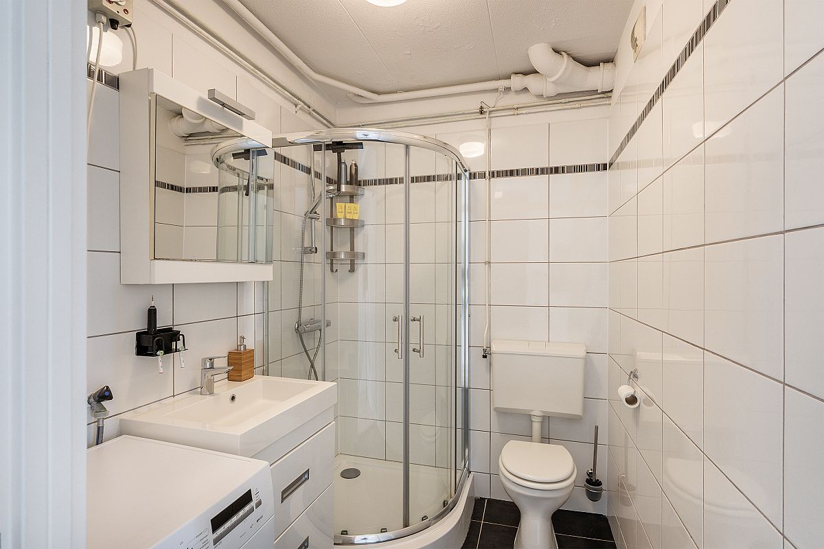 Entrance, spacious storage cupboard also housing the boiler, meter cupboard. The bathroom is equipped with a shower, toilet, washbasin cabinet, mirror cabinet, and connection for the washing machine. The generous separate kitchen is fitted with a white-fronted kitchen unit and an anthracite countertop. The kitchen includes a microwave, fridge/freezer combination, 5-burner gas hob, extractor hood, and dishwasher. Spacious bedroom of approximately 11m² with built-in wardrobe. Cozy living room of over 20m² with access to the balcony.