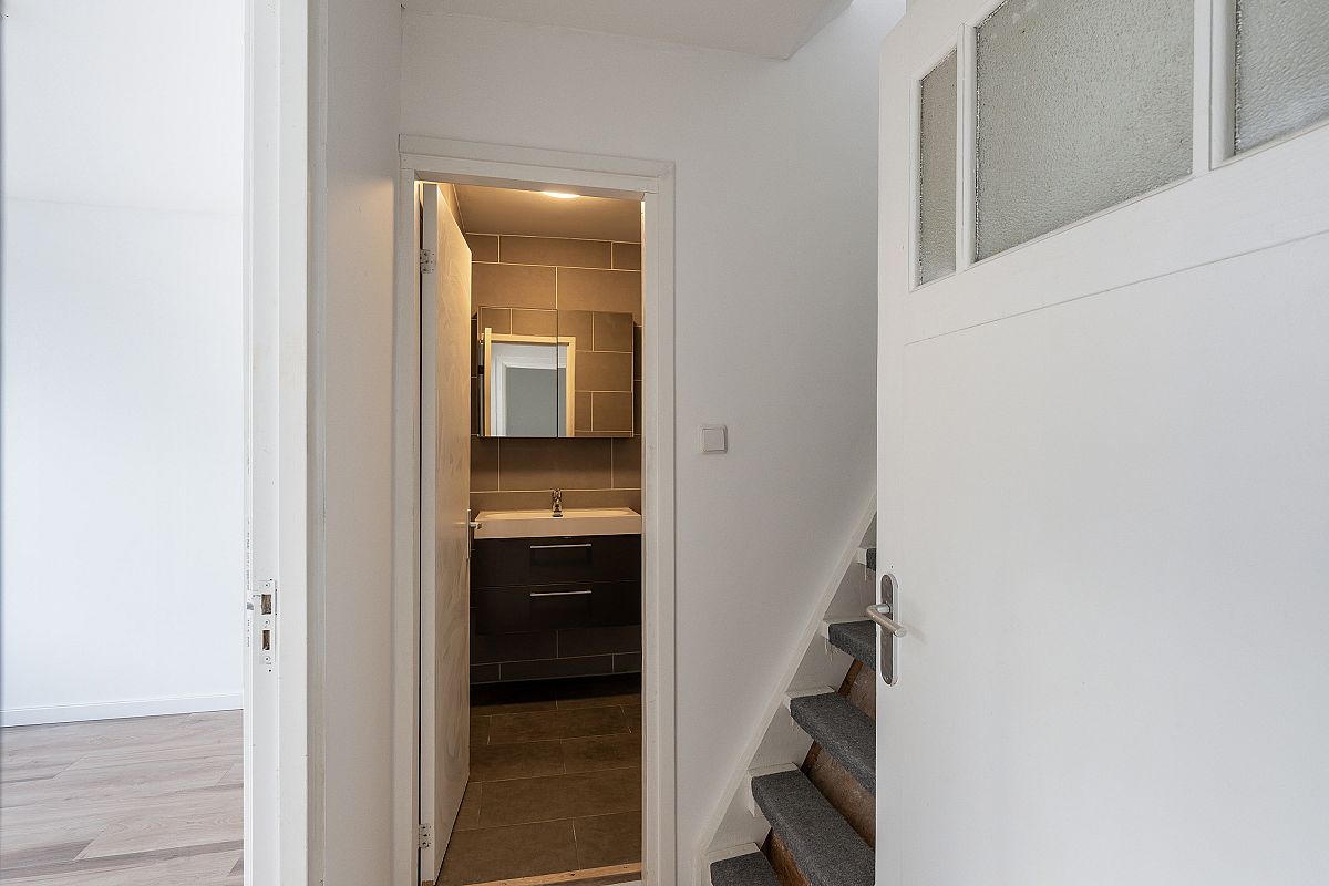 Overloop. Toilet met een handwasbakje. Wasruimte aan de achterzijde. Inbouwkast met cv ketel opstelling. Moderne badkamer voorzien van een wastafelmeubel en douchecabine.