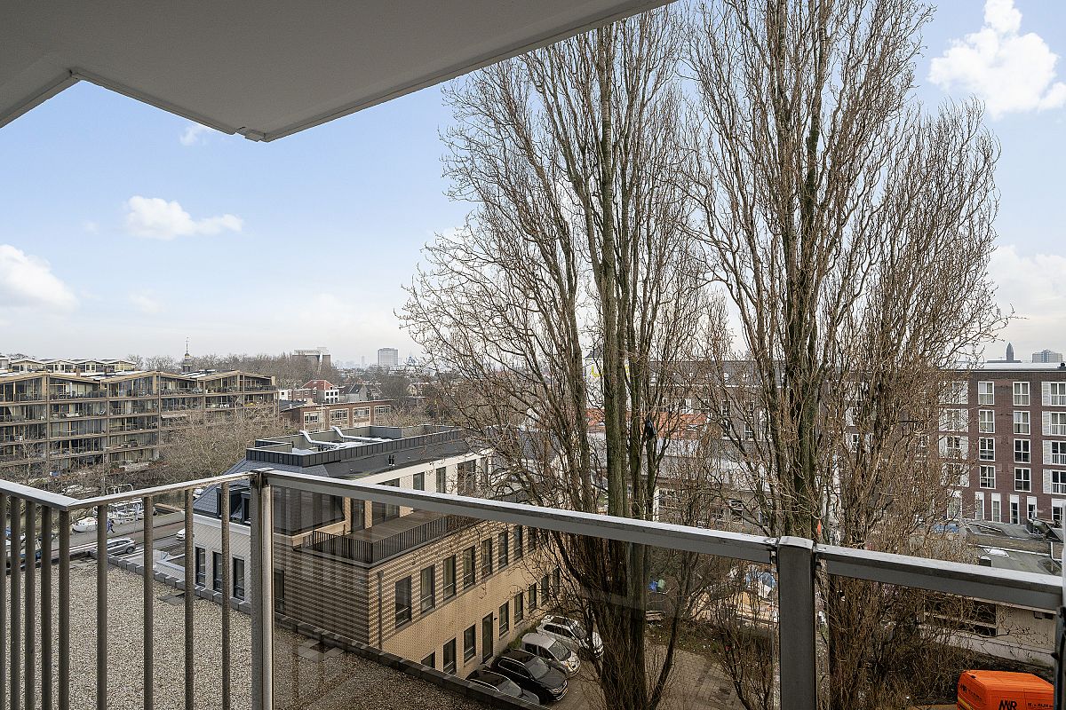 Ruim balkon van ca. 7,5m2 voorzien van een siergrindvloer en nieuw geplaatst zonwerend glas (okt 2024).