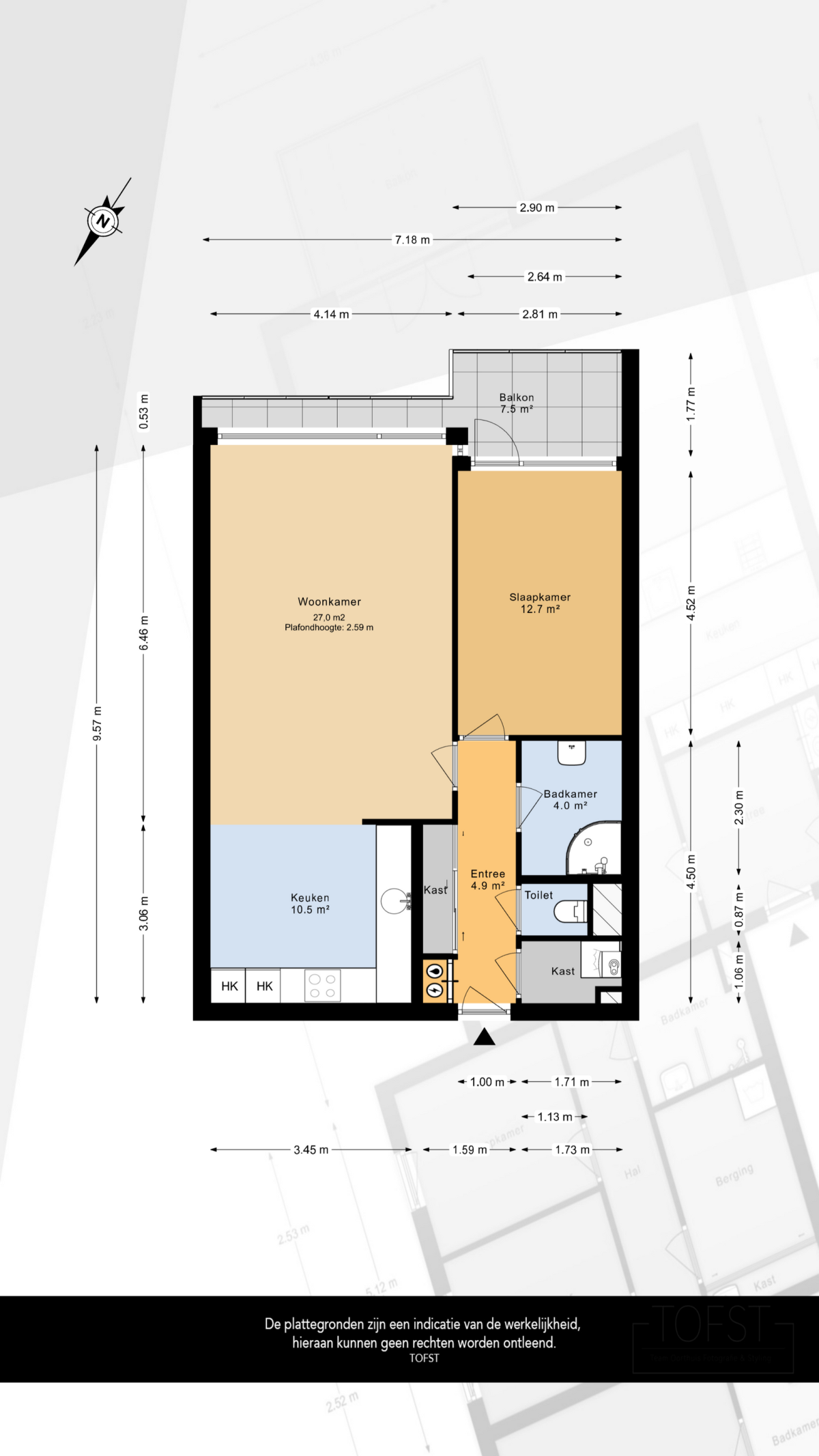 De Meetinstructie is gebaseerd op de NEN2580. De Meetinstructie is bedoeld om een meer eenduidige manier van meten toe te passen voor het geven van een indicatie van de gebruiksoppervlakte. De Meetinstructie sluit verschillen in meetuitkomsten niet volledig uit, door bijvoorbeeld interpretatieverschillen, afrondingen of beperkingen bij het uitvoeren van de meting. Indien de exacte maten voor een koper van cruciaal belang zijn, adviseren wij deze zelf na te meten.