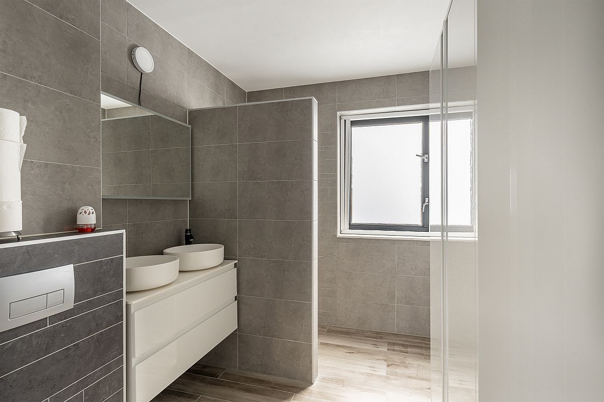 Overloop. Bergkast. Moderne ruime badkamer 3m x 2,17m voorzien van een dubbele wastafelmeubel, vrijhangend toilet en een inloopdouche. Slaapkamer aan de voorzijde van ca.10,4m2. Slaapkamer aan de achterzijde van ca.12,9m2.