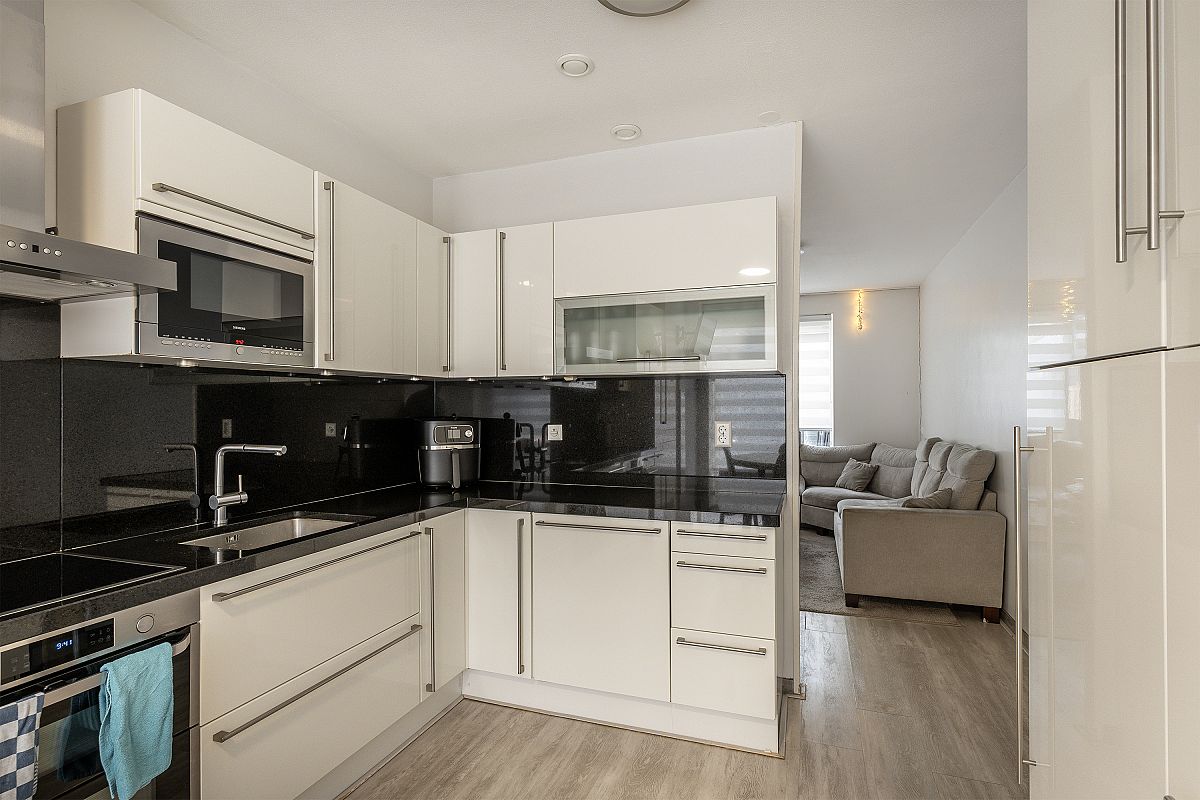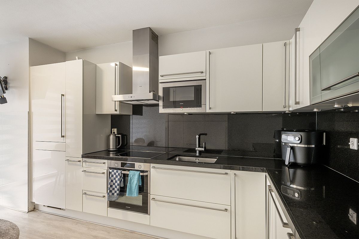 Entrance, hallway, meter cupboard, wall-mounted toilet with a small hand basin. Wonderfully spacious and bright living room including kitchen with a total area of approximately 40 m², equipped with underfloor heating. From the living room there is a pleasant view of the gardens and access to the terrace canopy. The kitchen is spaciously designed and has an additional wall section; equipped with a granite countertop and backsplash, cooktop, oven (2020), combi oven, refrigerator, extractor hood, dishwasher (2019), carousel cabinet, pantry cabinet and plenty of cupboard space. The terrace canopy of approximately 21 m² (5.4 m x 3.9 m) is equipped with underfloor heating, an outdoor kitchen and an additional connection for a washing machine (can also be placed in the attic).