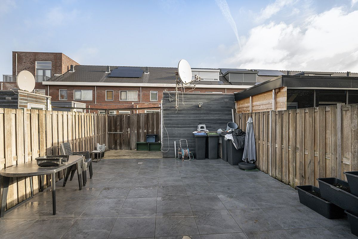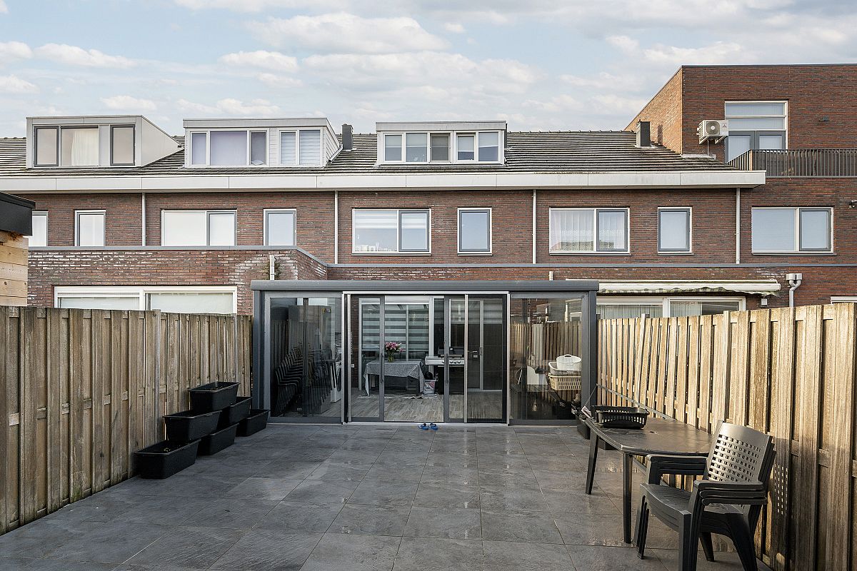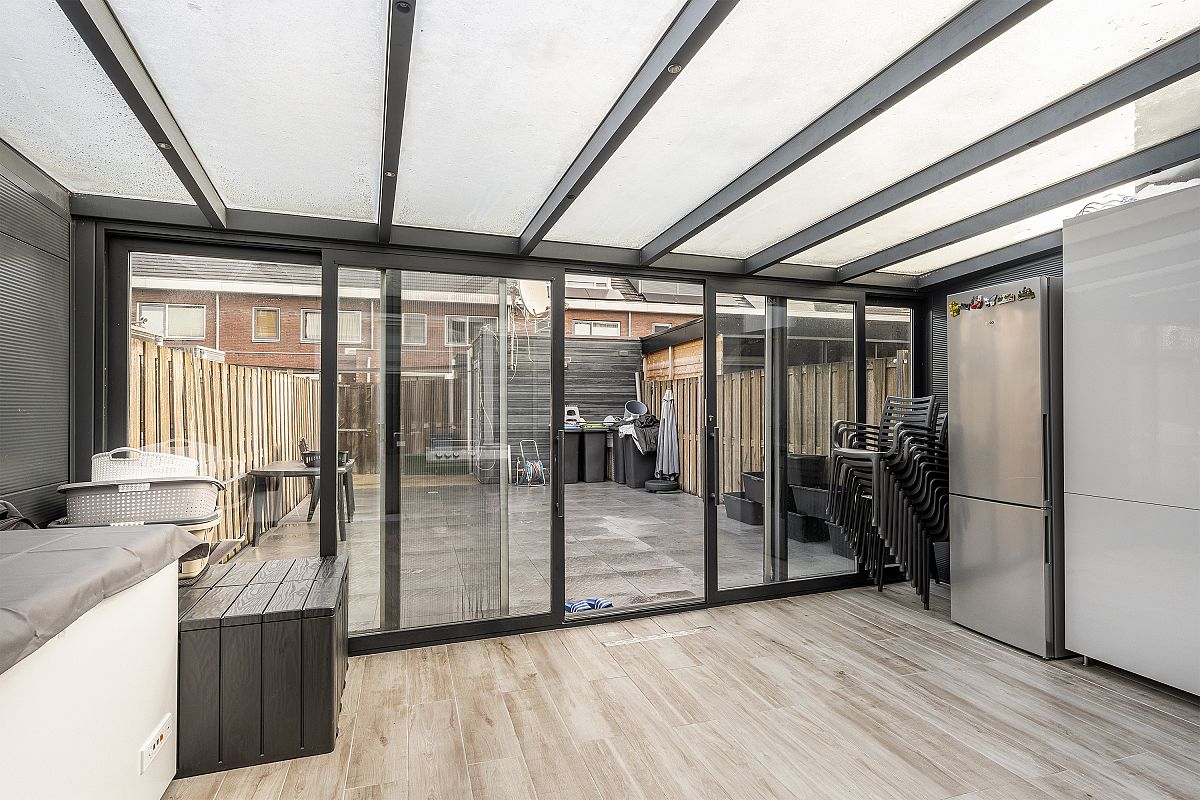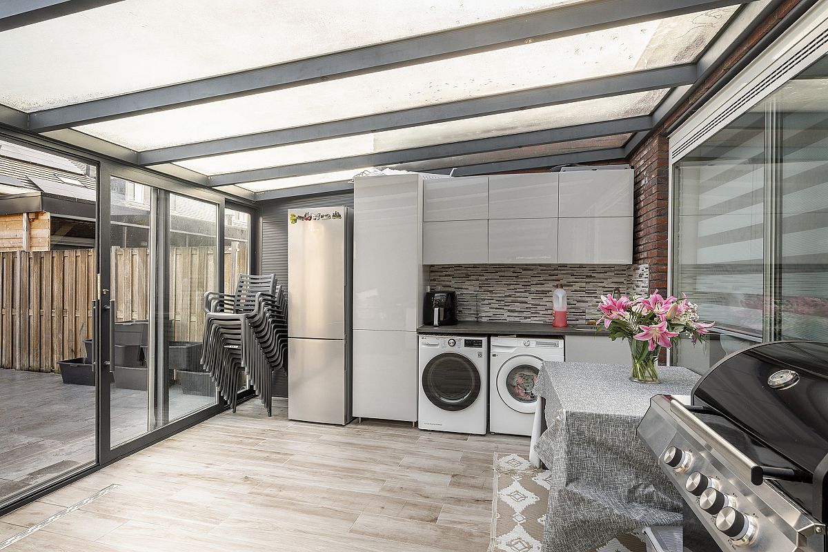 Vanuit de woonkamer bereik je de grote terrasoverkapping (5,4m x 3,9m) met vloerverwarming. In elk seizoen een heerlijke plek om te zijn. Hier is ook een buitenkeuken geplaatst en opstelling wasm.aansluiting (Deze kan ook op zolder.